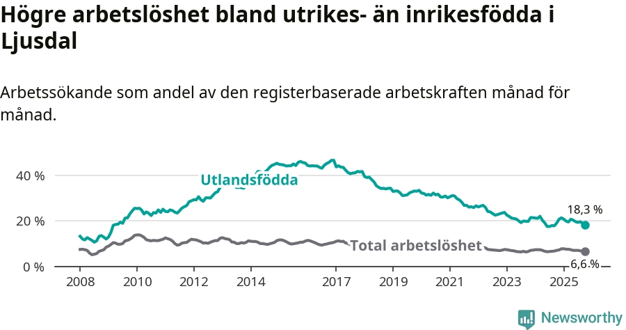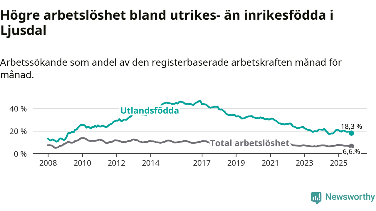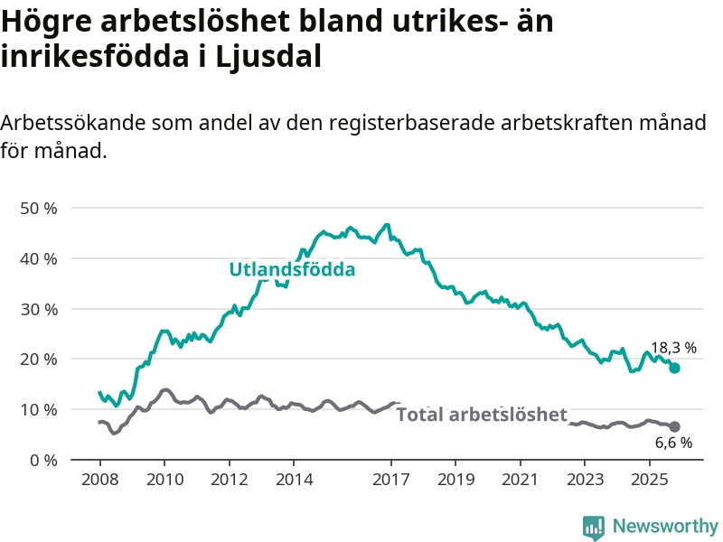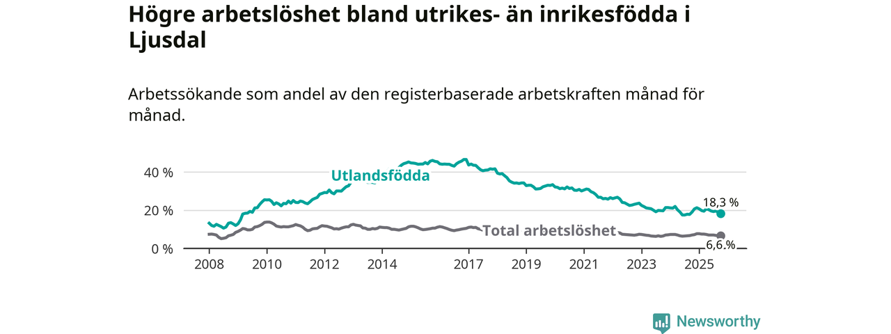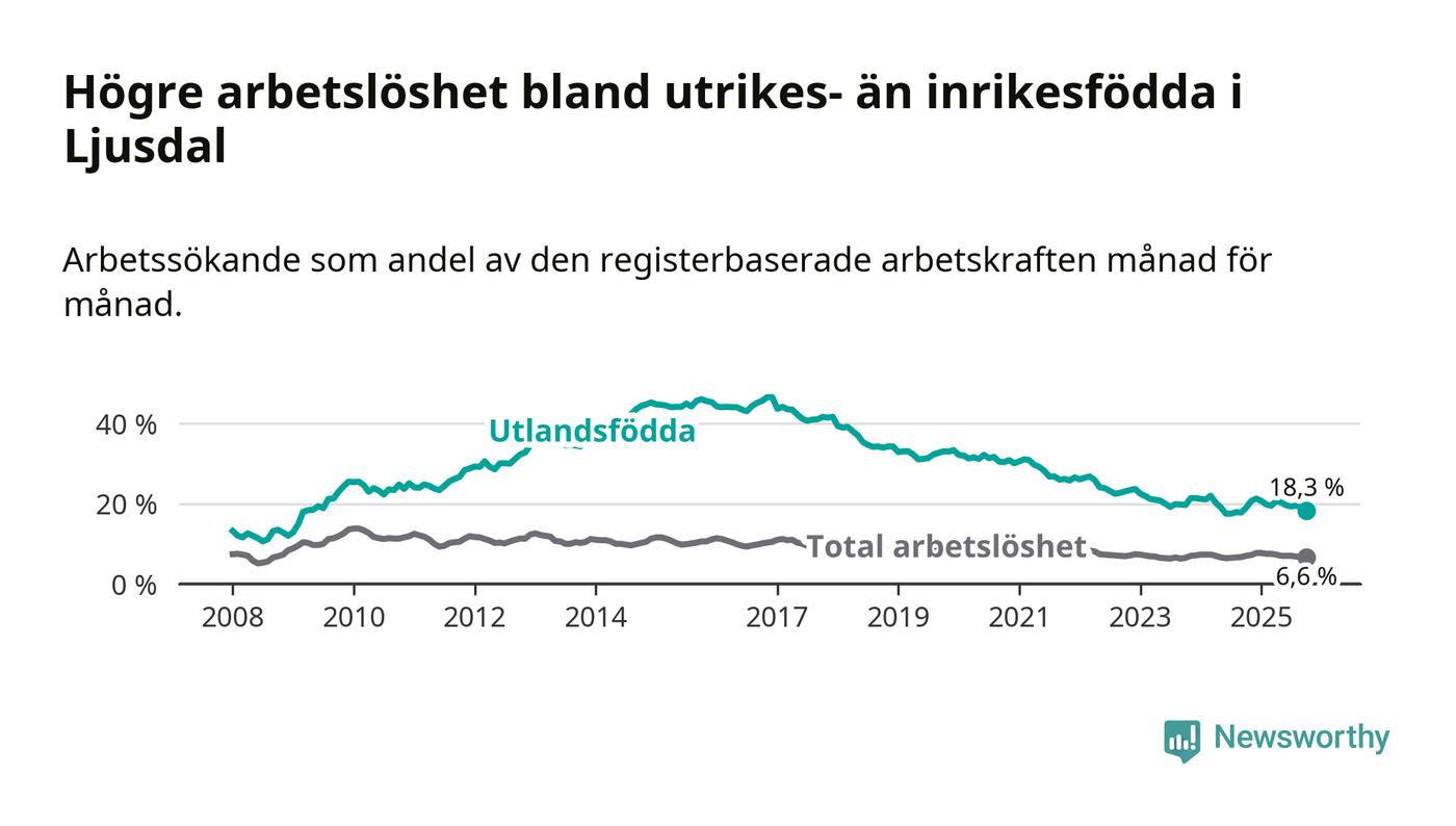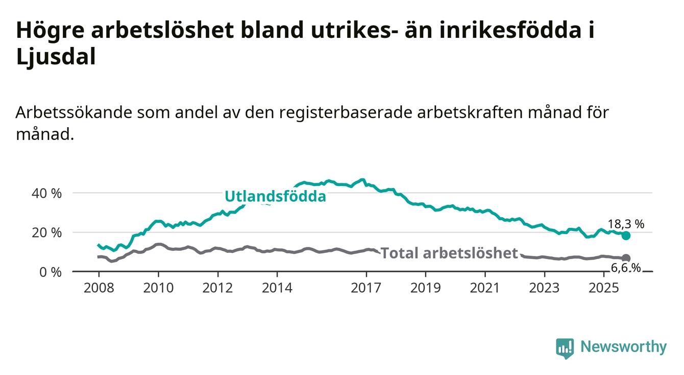 Arbetslösheten bland utlandsfödda var 18,3 procent i Ljusdal under oktober månad, motsvarande 200 av 1 093 personer. Det är 0,7 procentenheter färre än vid samma tidpunkt i fjol (−9 om man räknar personer). Den senaste månadens nedgång innebär ett trendbrott. Under de sex föregående månaderna hade arbetslösheten bland utlandsfödda varit högre än motsvarande tidpunkt året innan.