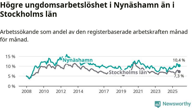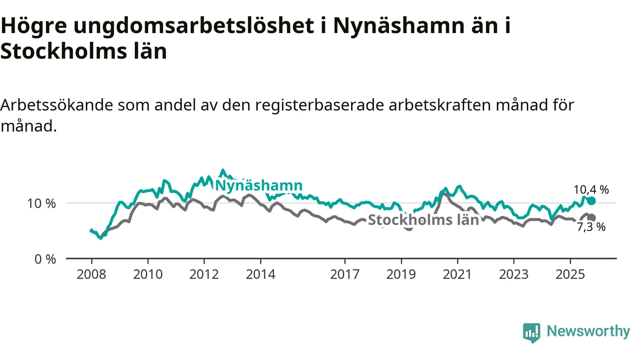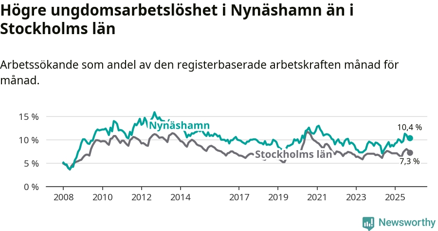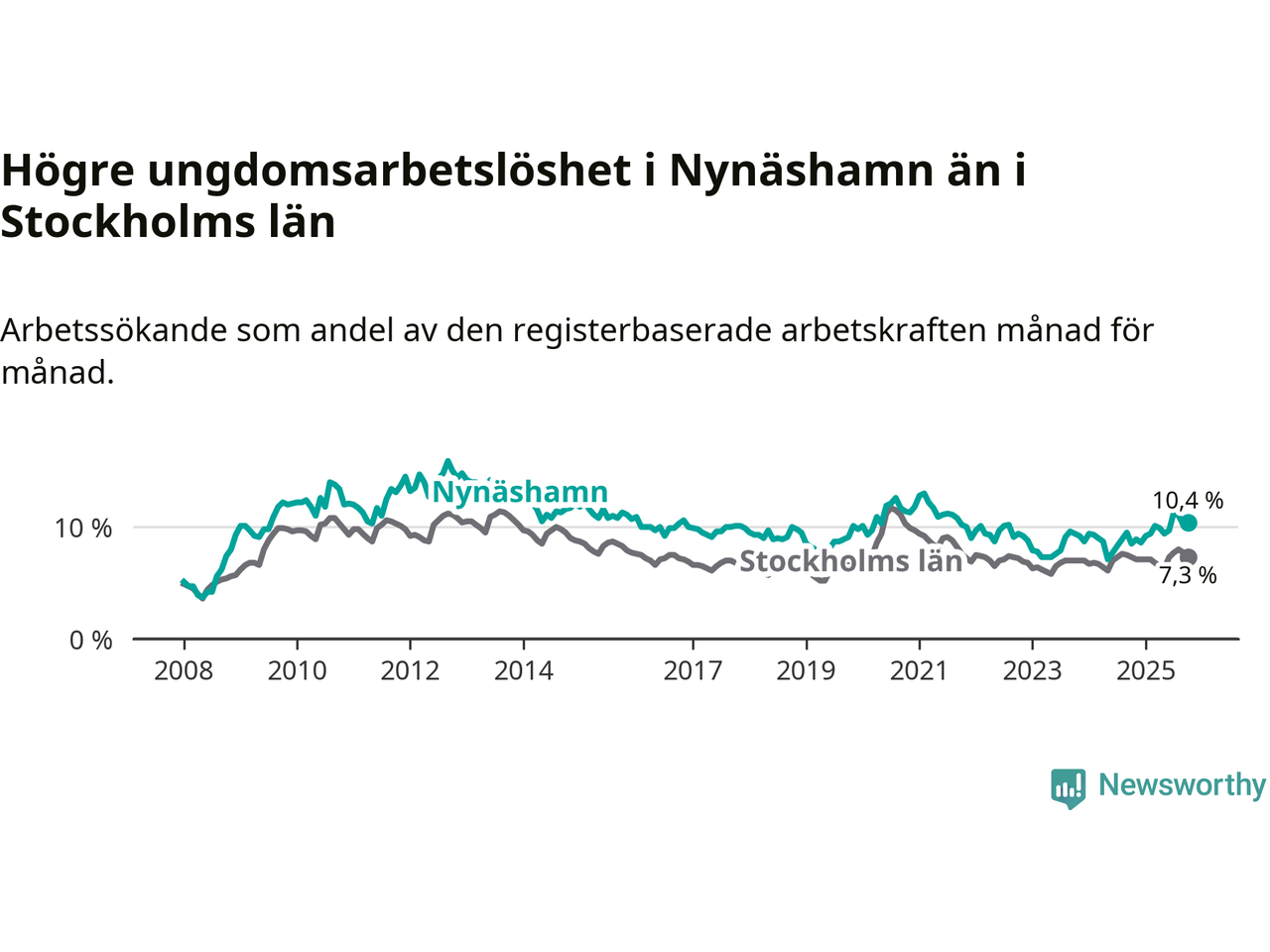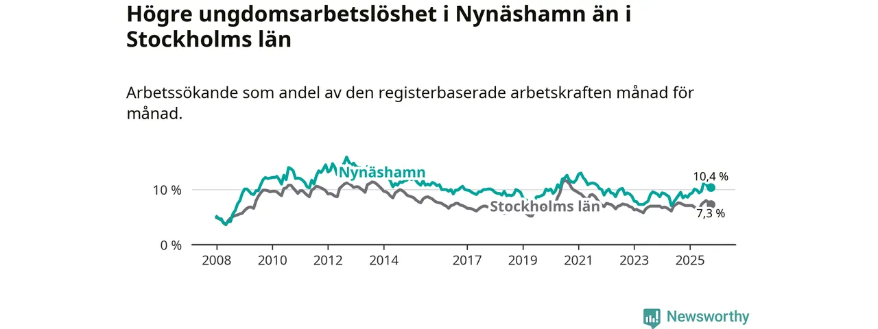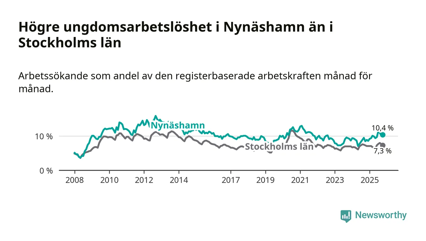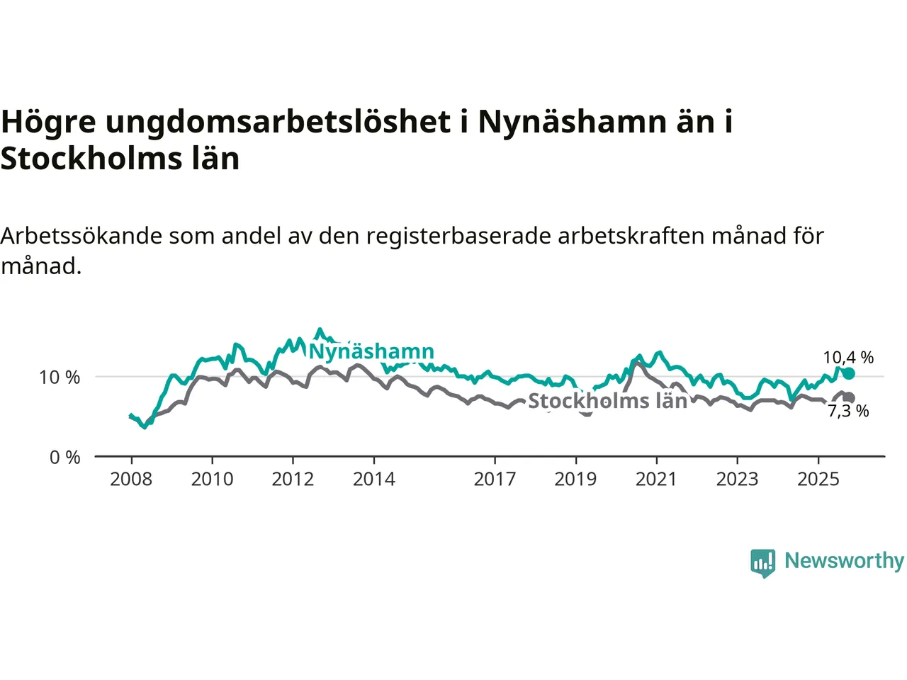 Precis som den totala arbetslösheten ligger ungdomsarbetslösheten i Nynäshamn högre än i Stockholms län som helhet. Skillnaden mellan kommunen och länet är 3,1 procentenheter.