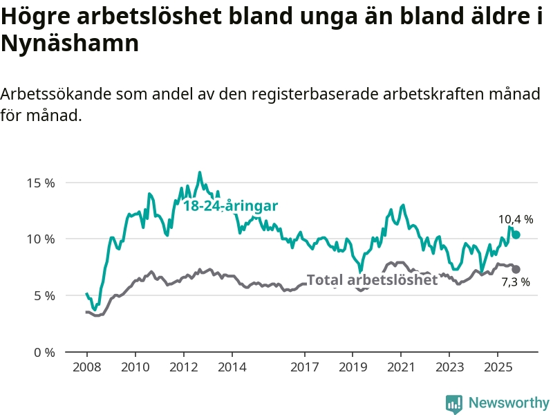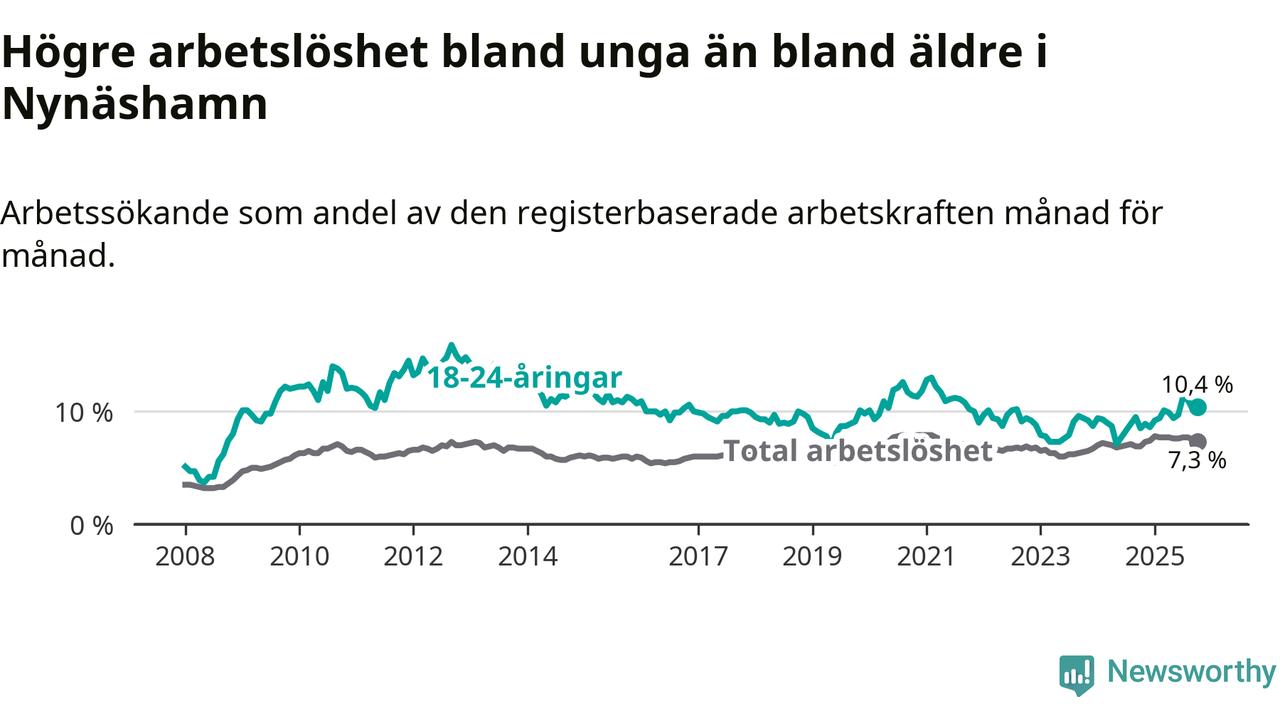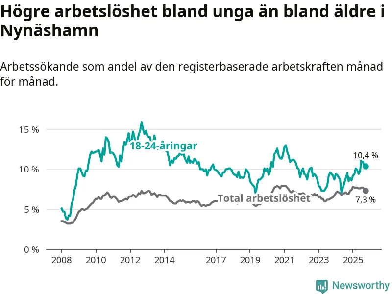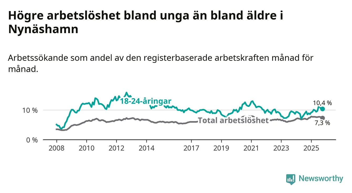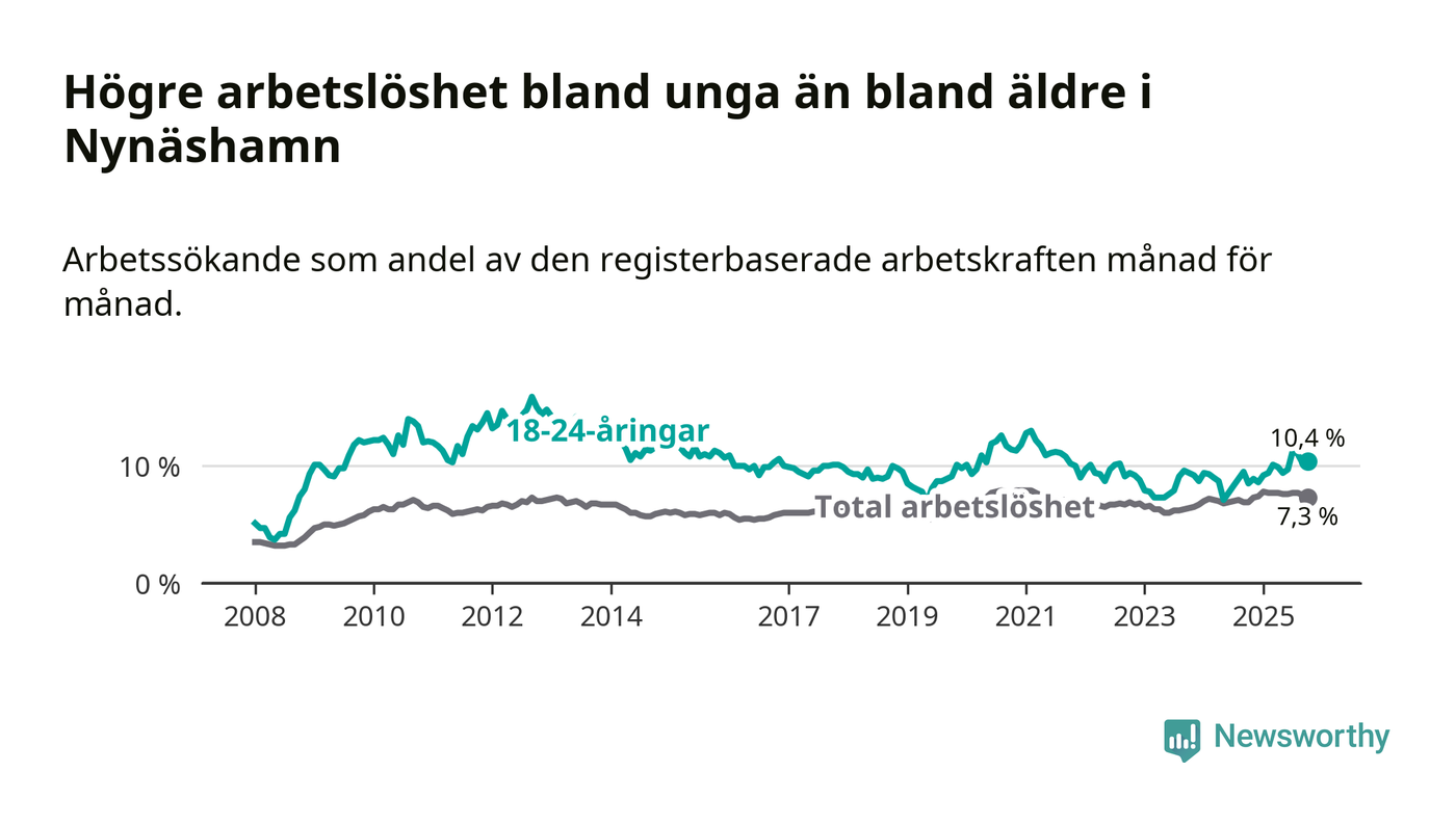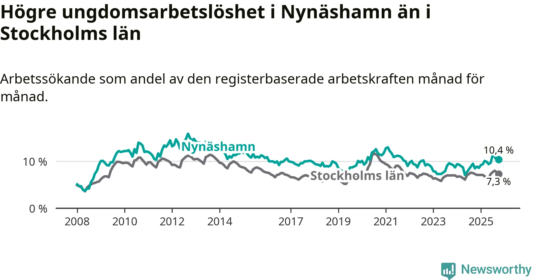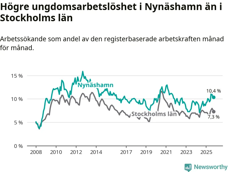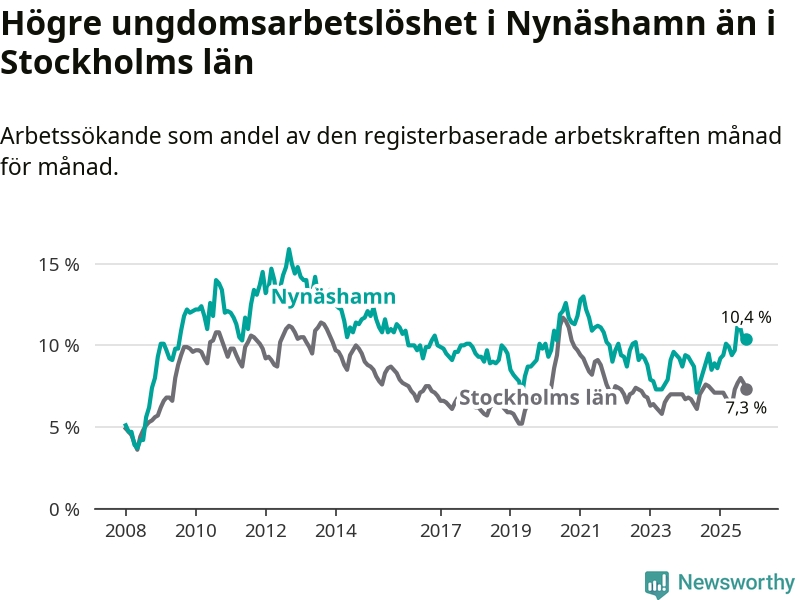 Precis som den totala arbetslösheten ligger ungdomsarbetslösheten i Nynäshamn högre än i Stockholms län som helhet. Skillnaden mellan kommunen och länet är 3,1 procentenheter.