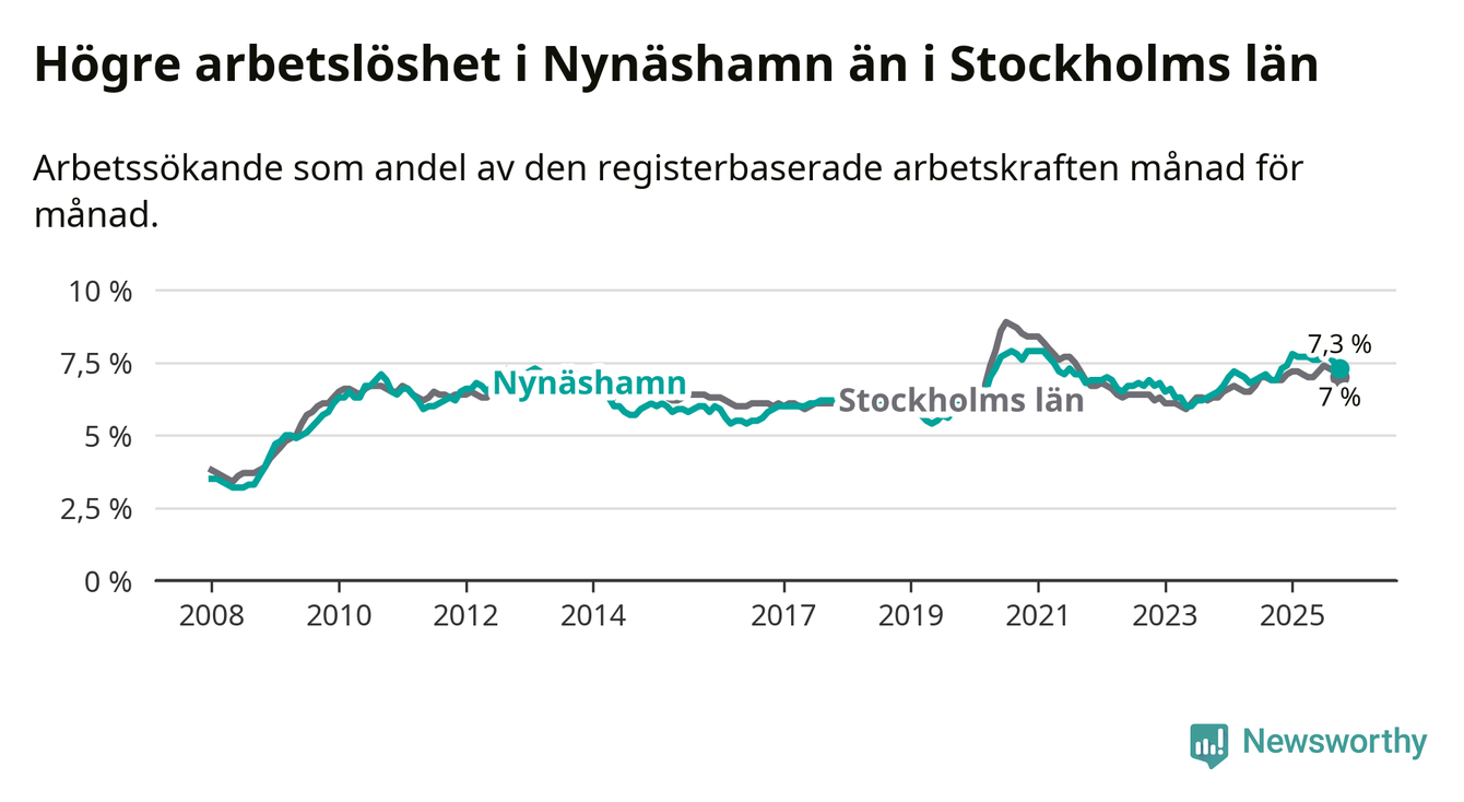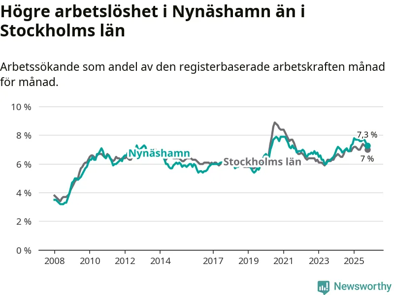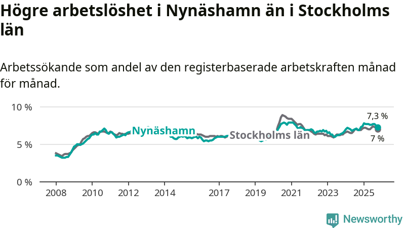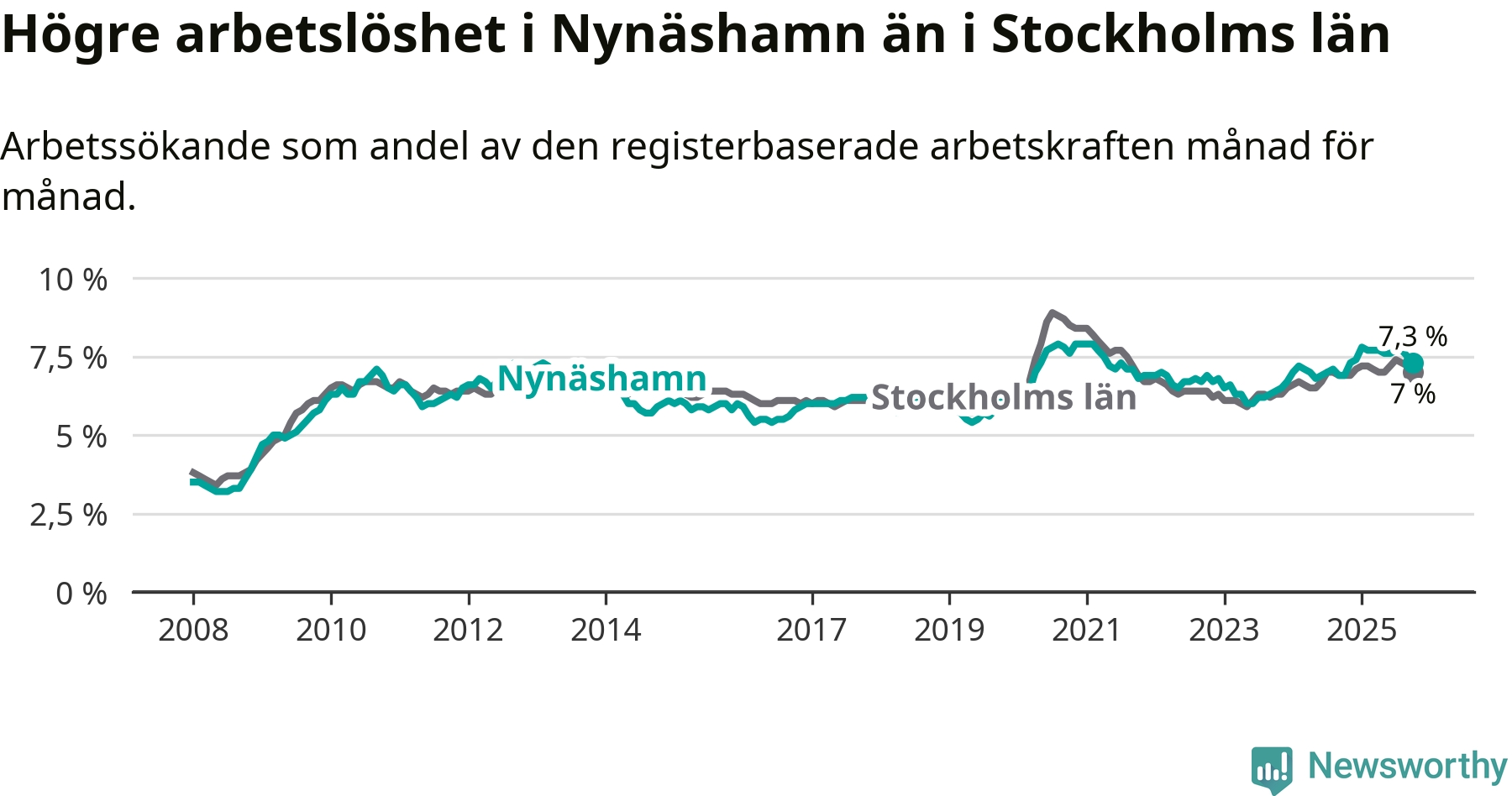 Under oktober månad rapporterade Nynäshamns kommun en total arbetslöshet på 7,3 procent. Det är en ökning jämfört med samma tidpunkt i fjol (+0,4 procentenheter). Även i Stockholms län stiger arbetslösheten något.