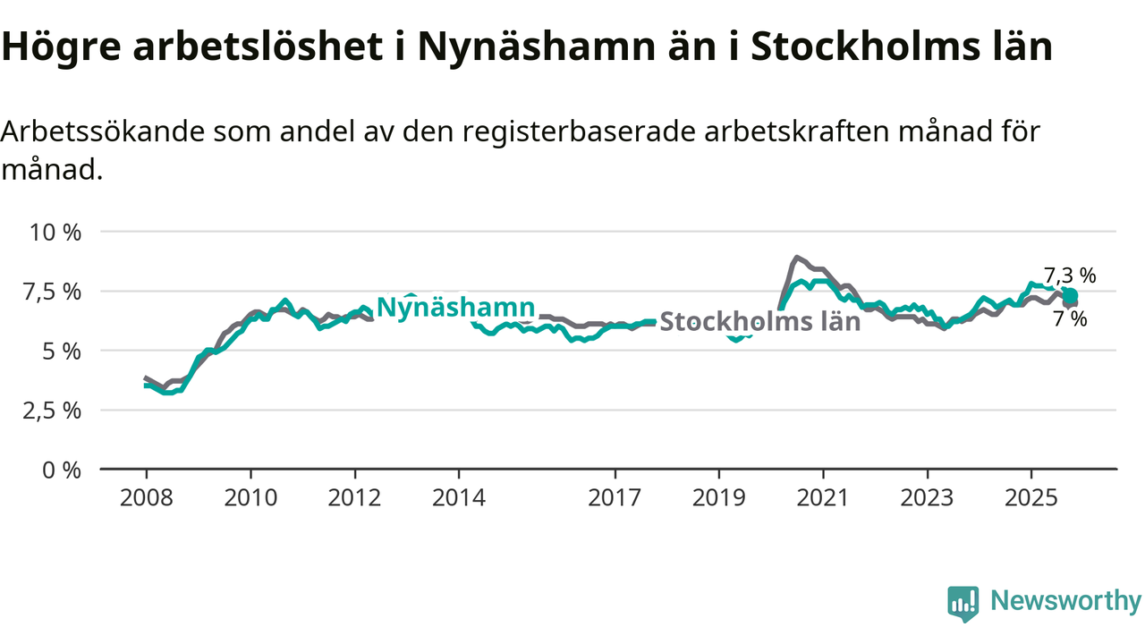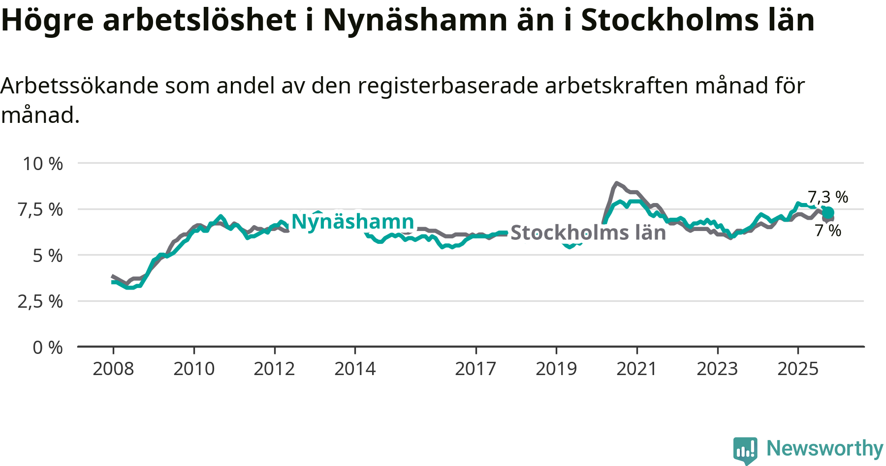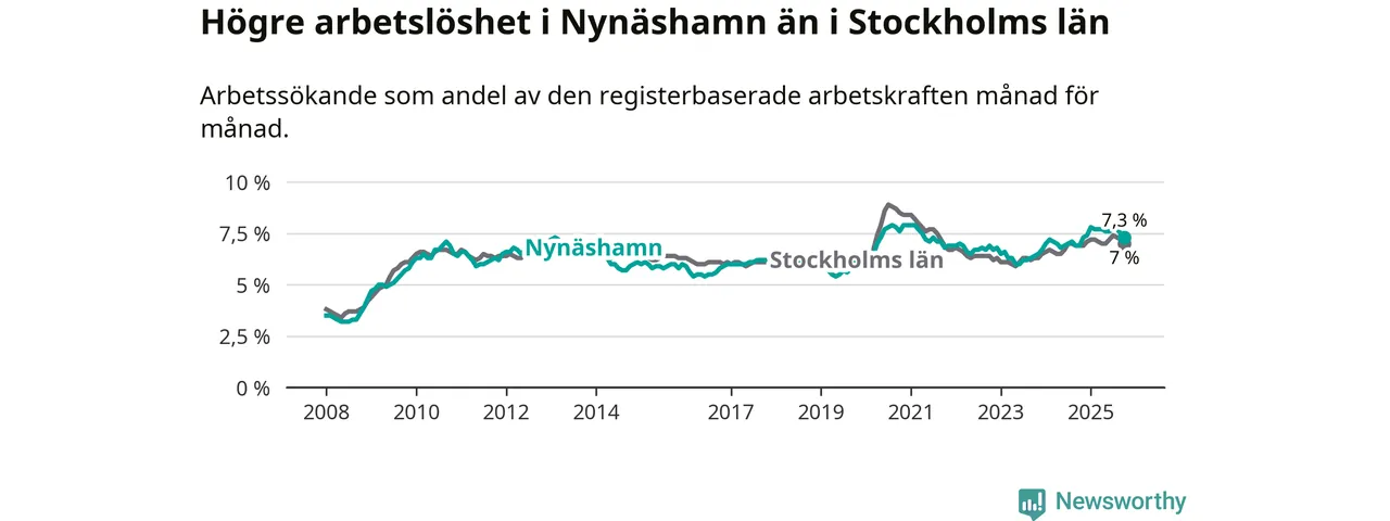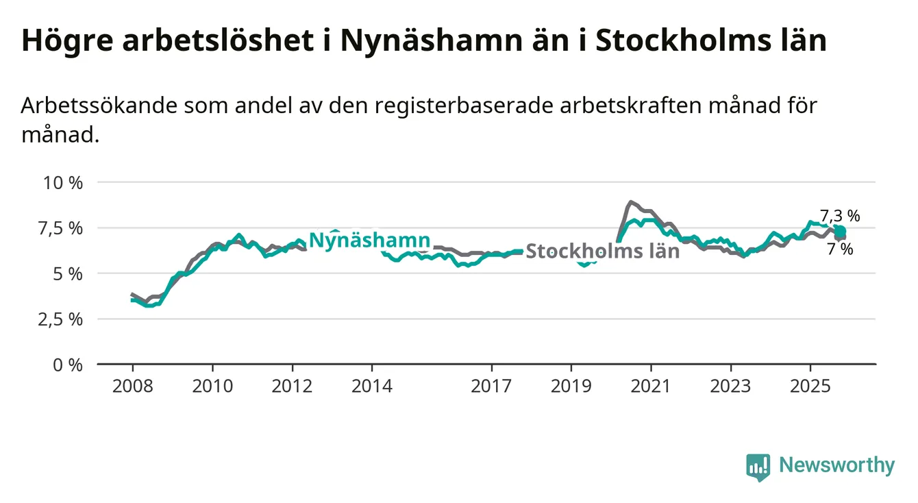 Nynäshamn hade redan tidigare högre arbetslöshet än snittet i hela Stockholms län och nu växer klyftan (7,3 procent i kommunen, jämfört med 7,0 procent i hela länet). Vaxholm och Värmdö har den lägsta arbetslösheten i länet (3,9 procent), medan Södertälje har den högsta (10,9 procent). För att Nynäshamn skulle komma ner i samma arbetslöshetsnivå som Vaxholm och Värmdö skulle 493 personer behöva sysselsättas.