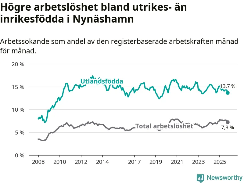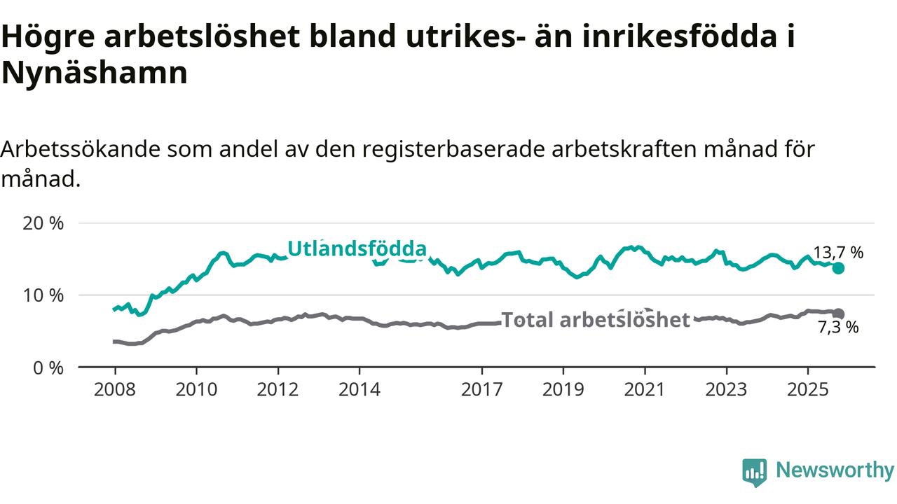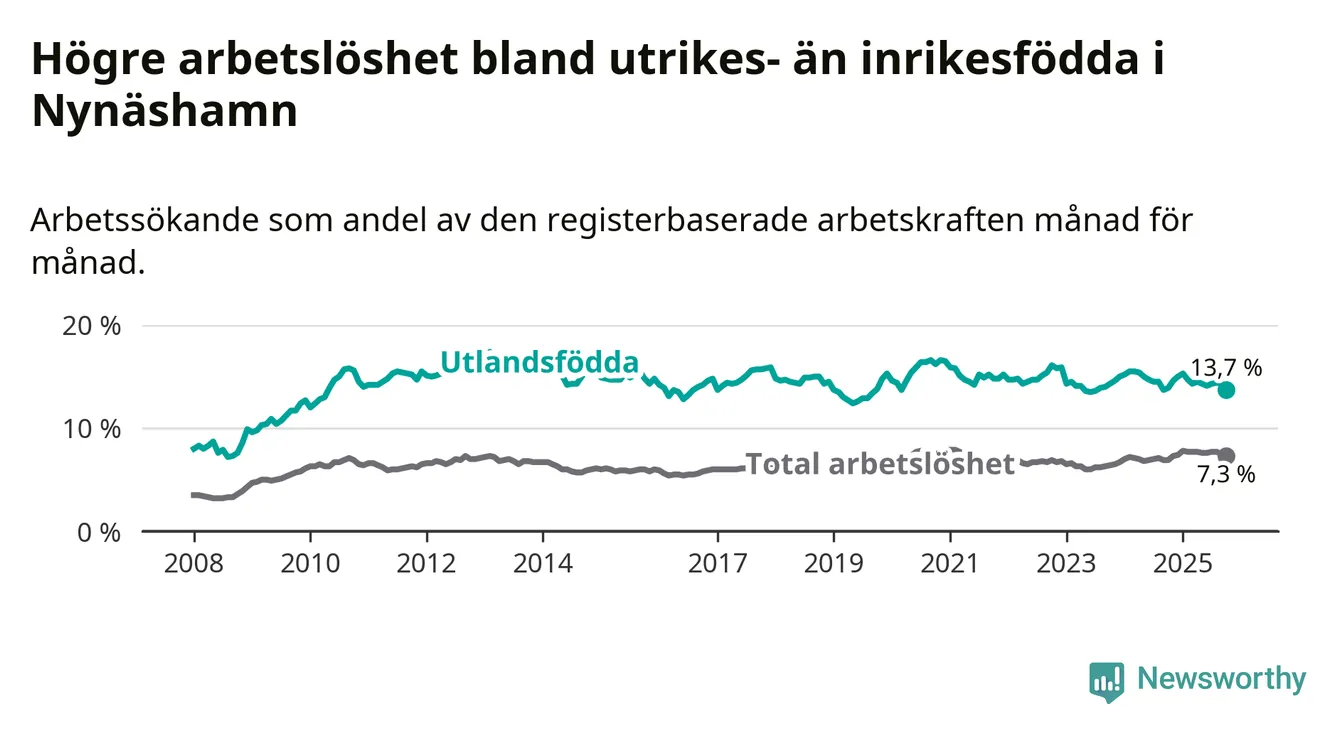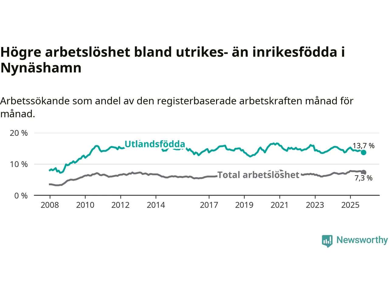 Skillnaden i arbetslöshet mellan utrikesfödda och hela befolkningen är 6,4 procentenheter i Nynäshamn. Det är en mindre skillnad än för ett år sedan (−0,6 procentenheter).