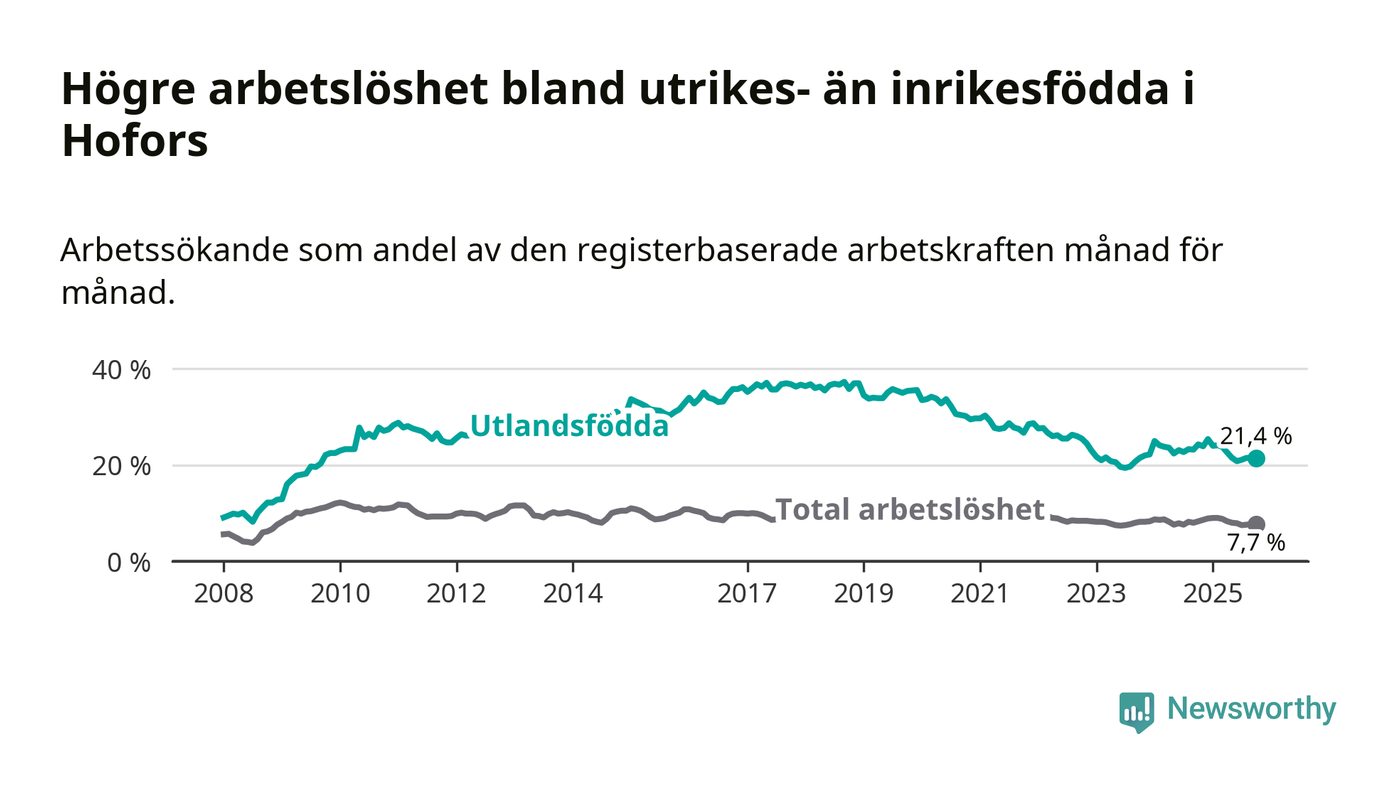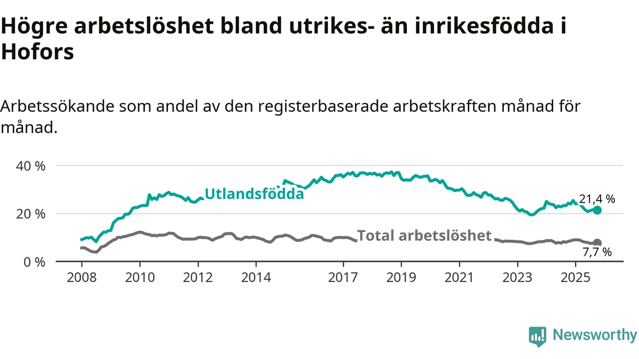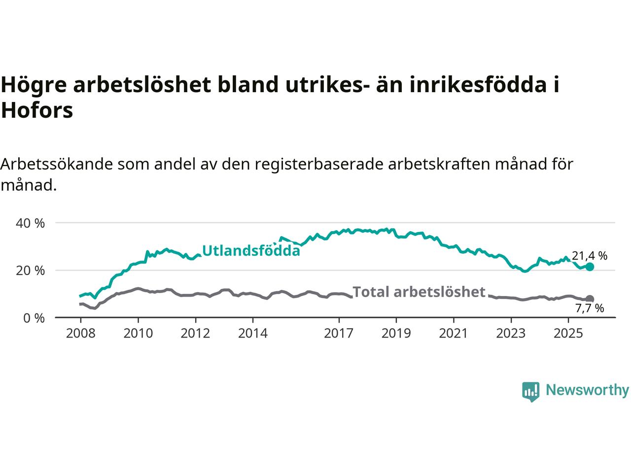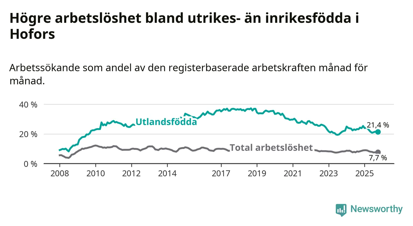 Skillnaden i arbetslöshet mellan utrikesfödda och hela befolkningen är 13,7 procentenheter i Hofors. Det är en betydligt mindre skillnad än för ett år sedan (−2,3 procentenheter).