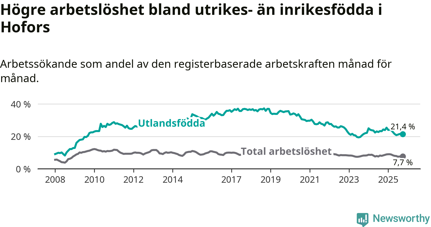 Arbetslösheten bland utlandsfödda var 21,4 procent i Hofors under oktober månad, motsvarande 141 av 659 personer. Det är 2,9 procentenheter färre än vid samma tidpunkt i fjol (−19 om man räknar personer). Därmed är de utlandsföddas arbetslöshet lägre än vid samma tidpunkt i fjol för sjunde månaden i följd. Sedan mars har arbetslösheten bland utlandsfödda minskat från 23,8 till 21,4 procent.