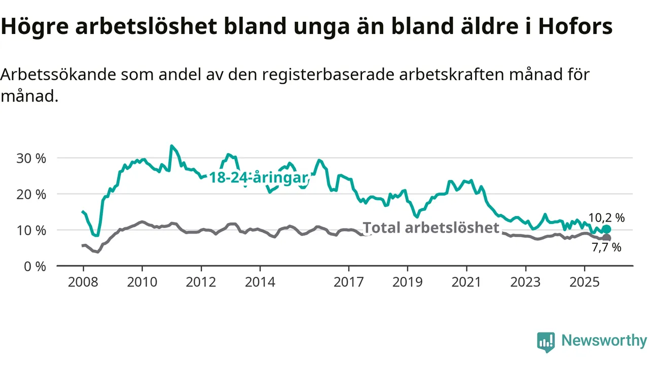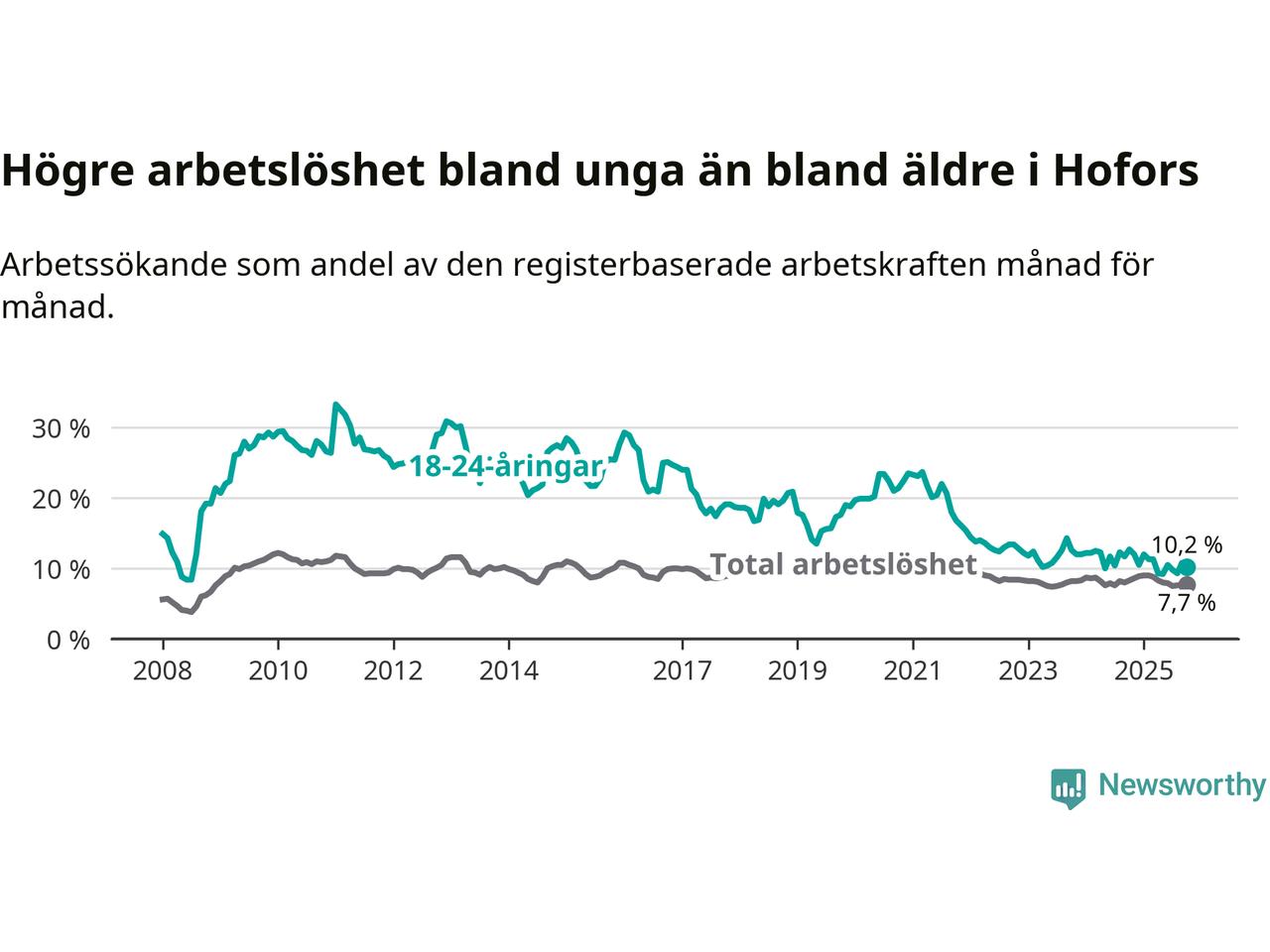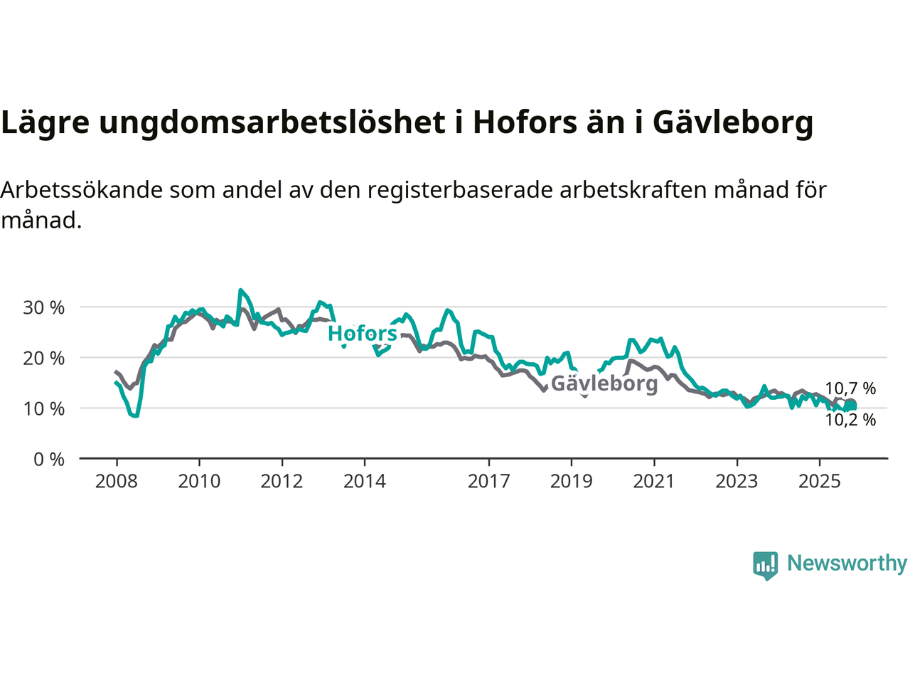 I och med den senaste månadens nedgång har de ungas arbetslöshet i Hofors sjunkit elva månader i följd (ner från 12,0 procent i november 2024 till 10,2 procent nu).