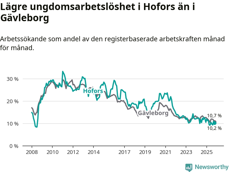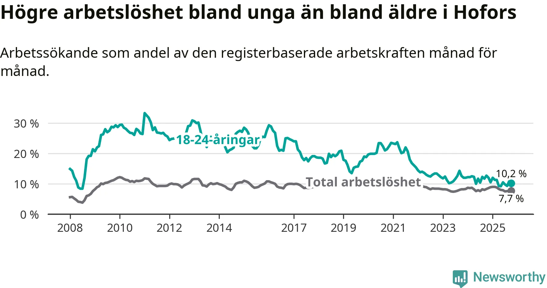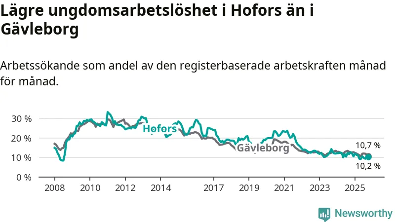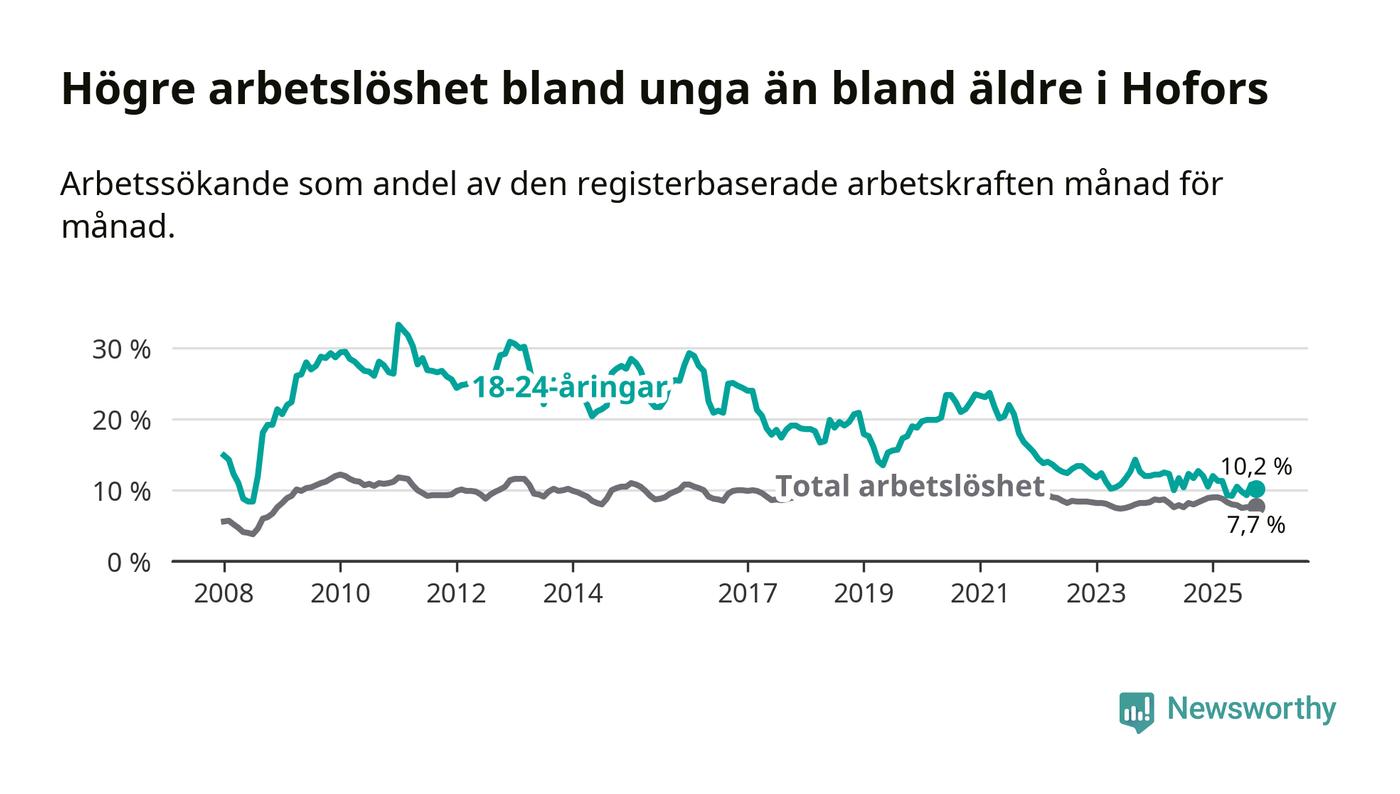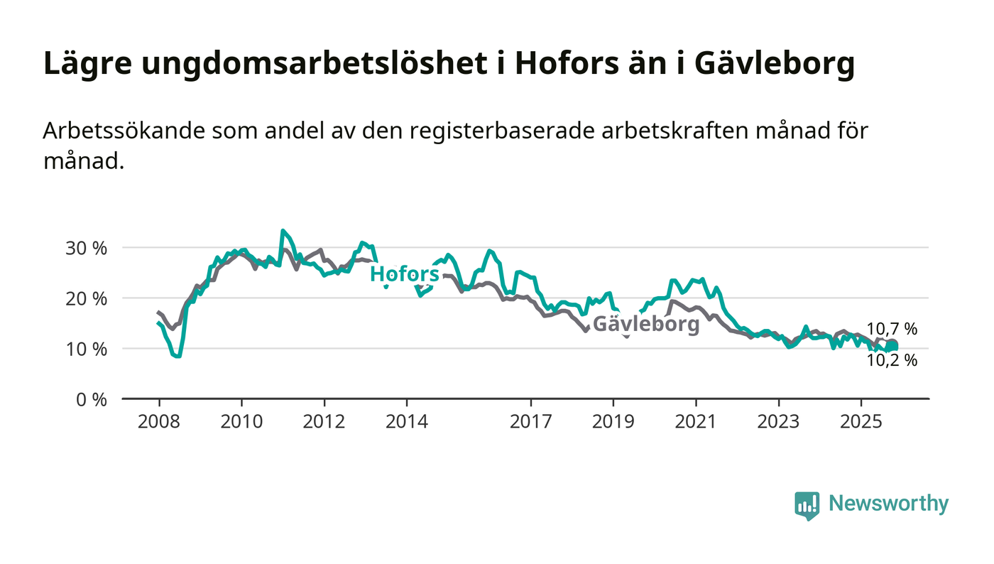 I och med den senaste månadens nedgång har de ungas arbetslöshet i Hofors sjunkit elva månader i följd (ner från 12,0 procent i november 2024 till 10,2 procent nu).