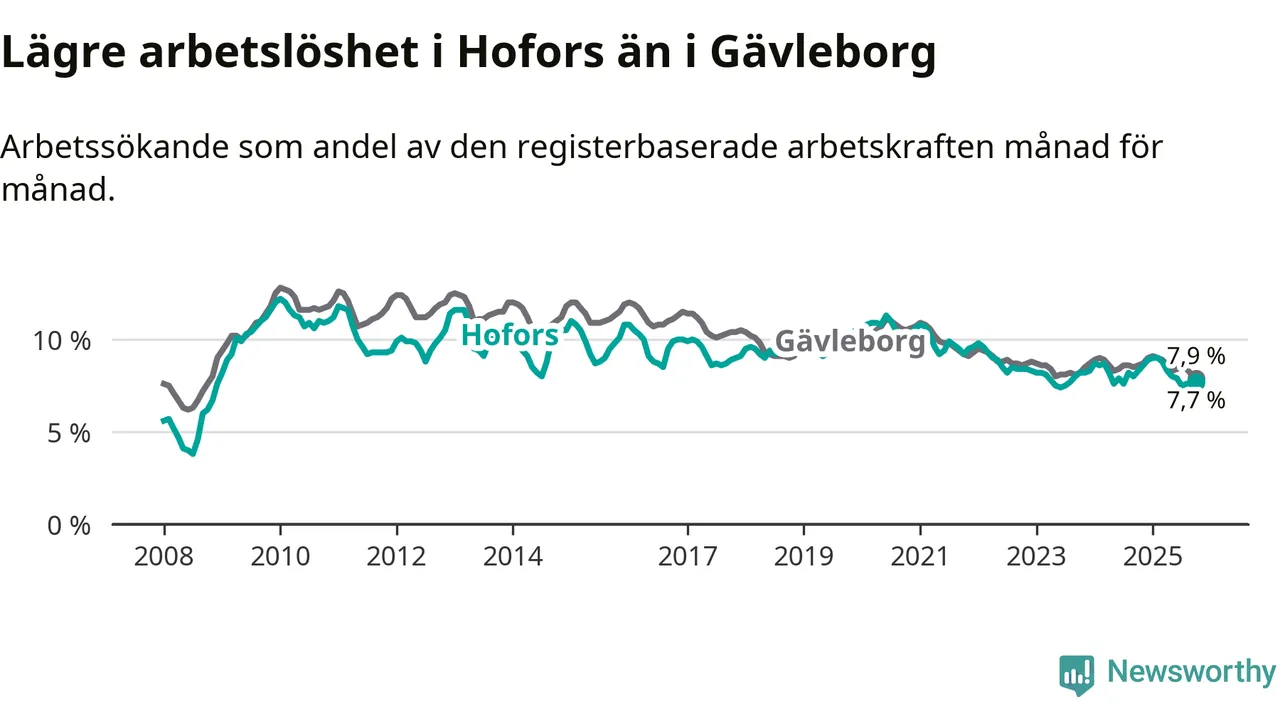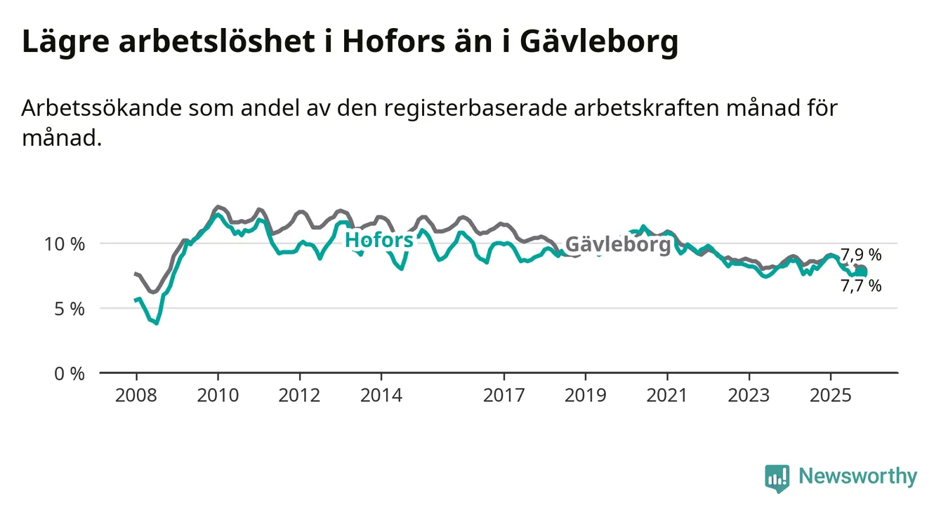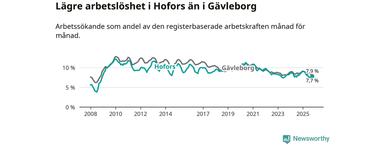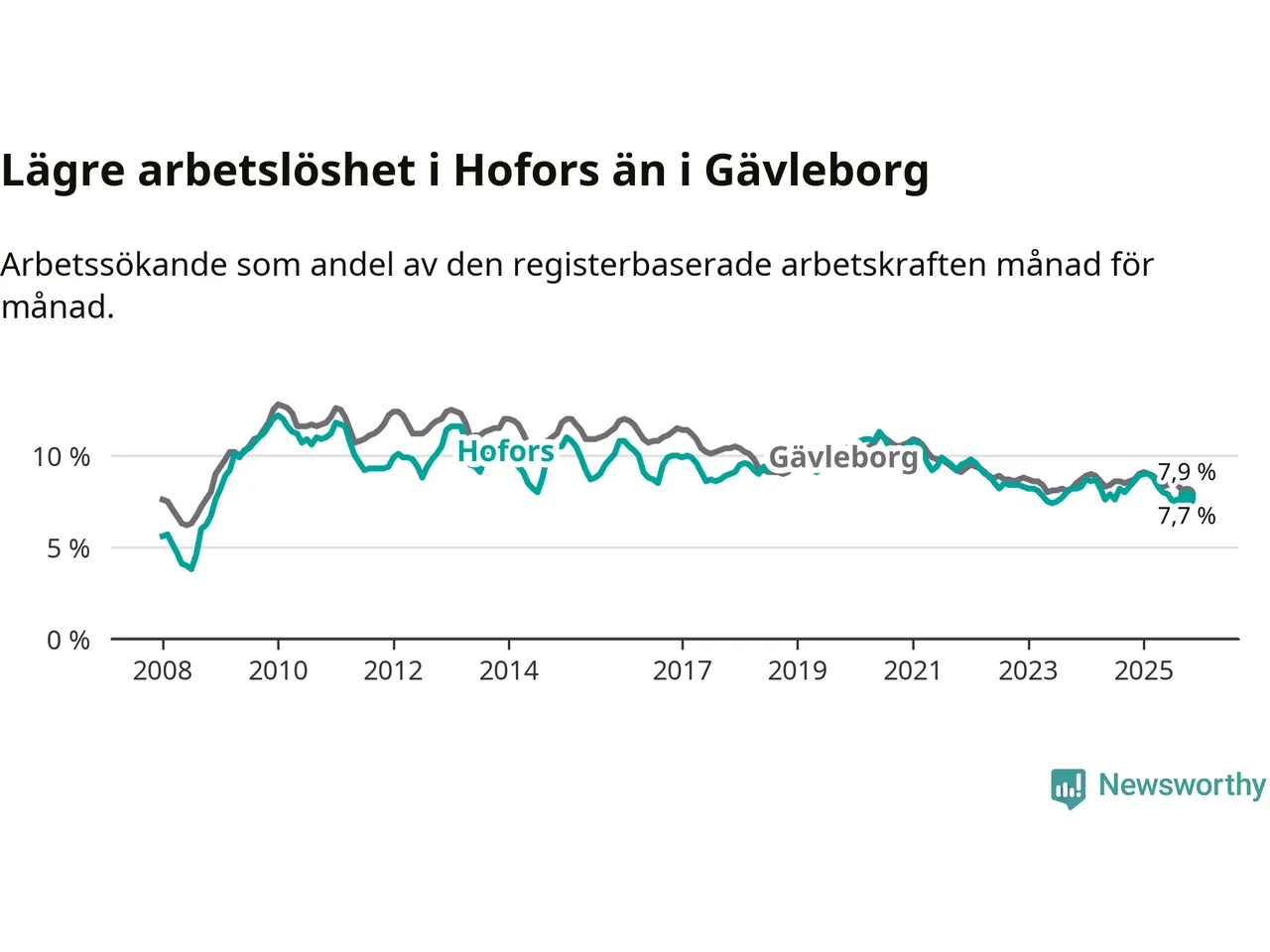 Under oktober månad rapporterade Hofors kommun en total arbetslöshet på 7,7 procent. Det är en minskning jämfört med samma tidpunkt i fjol (−0,6 procentenheter). Även i Gävleborgs län sjunker arbetslösheten .
