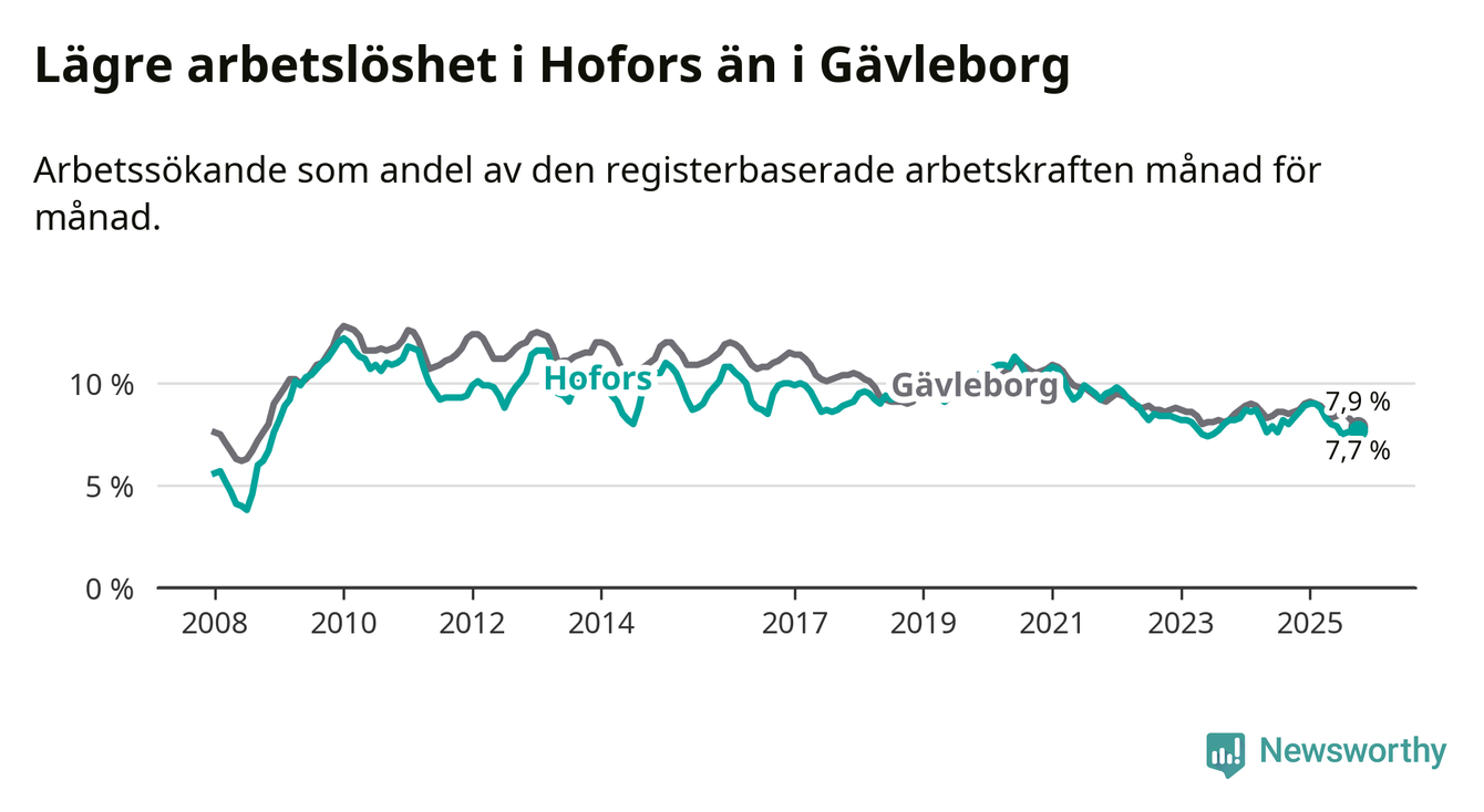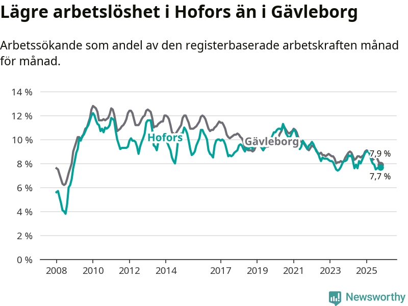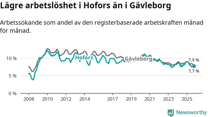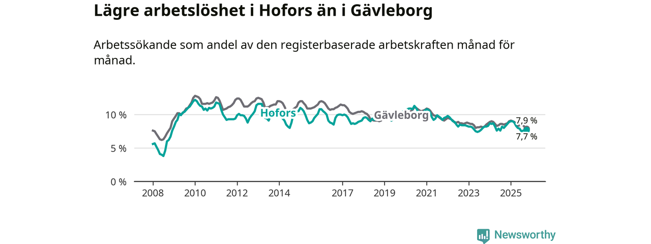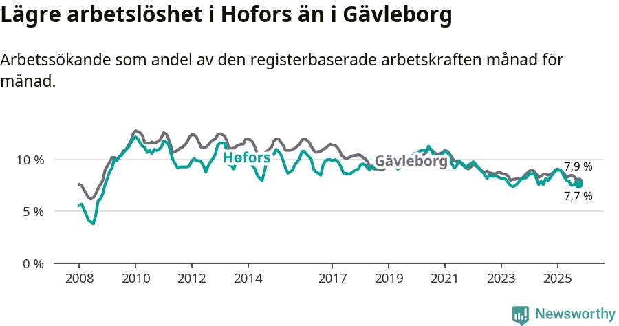 Under oktober månad rapporterade Hofors kommun en total arbetslöshet på 7,7 procent. Det är en minskning jämfört med samma tidpunkt i fjol (−0,6 procentenheter). Även i Gävleborgs län sjunker arbetslösheten .