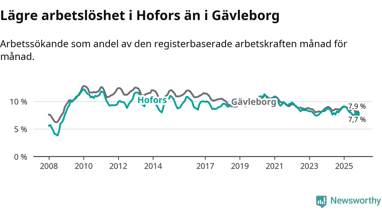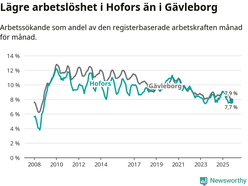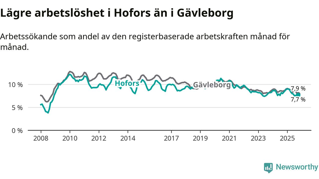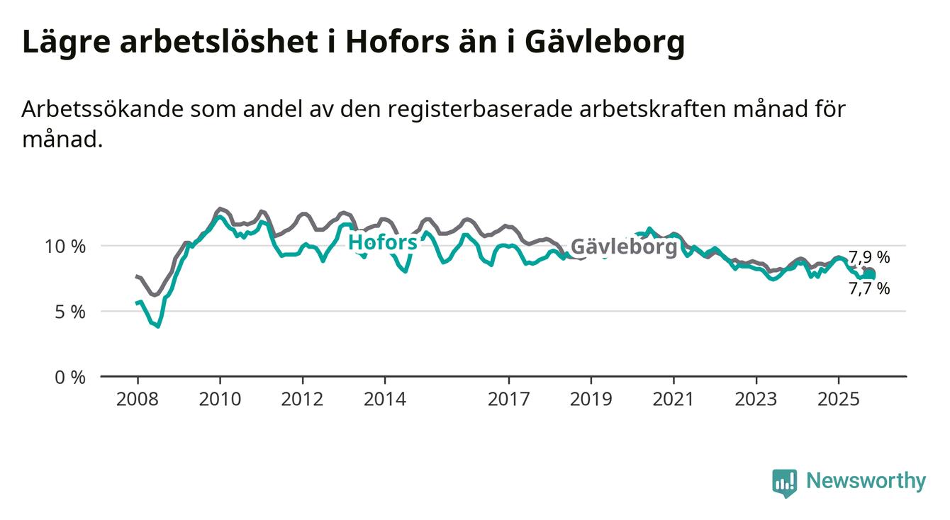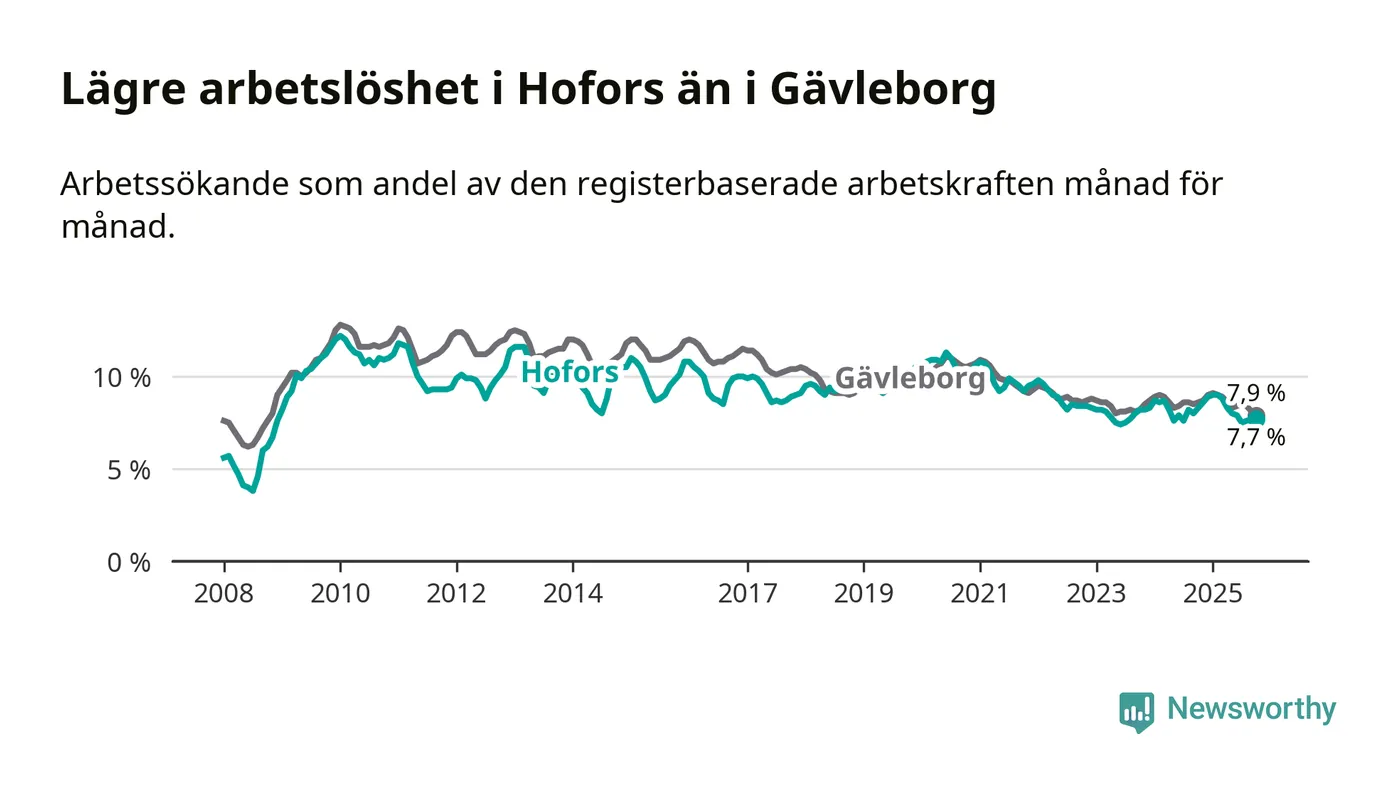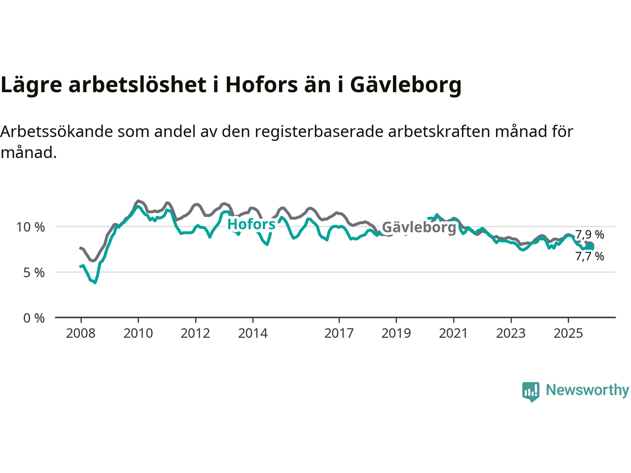 Hofors hade redan tidigare lägre arbetslöshet än snittet i hela Gävleborgs län och nu växer klyftan (7,7 procent i kommunen, jämfört med 7,9 procent i hela länet). Hudiksvall har den lägsta arbetslösheten i länet (5,5 procent), medan Söderhamn har den högsta (9,0 procent). För att Hofors skulle komma ner i samma arbetslöshetsnivå som Hudiksvall skulle 95 personer behöva sysselsättas.
