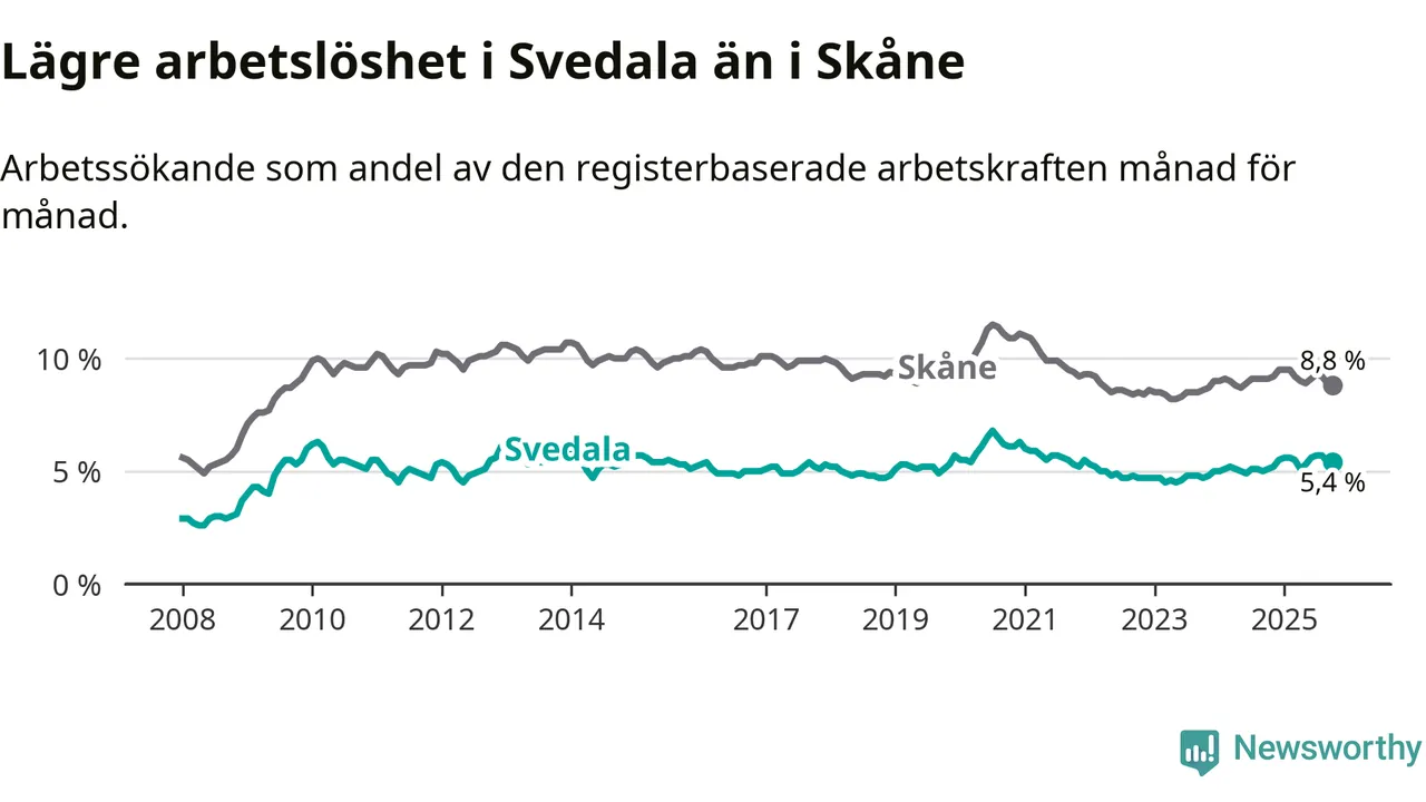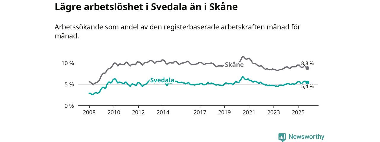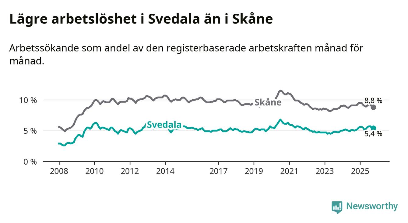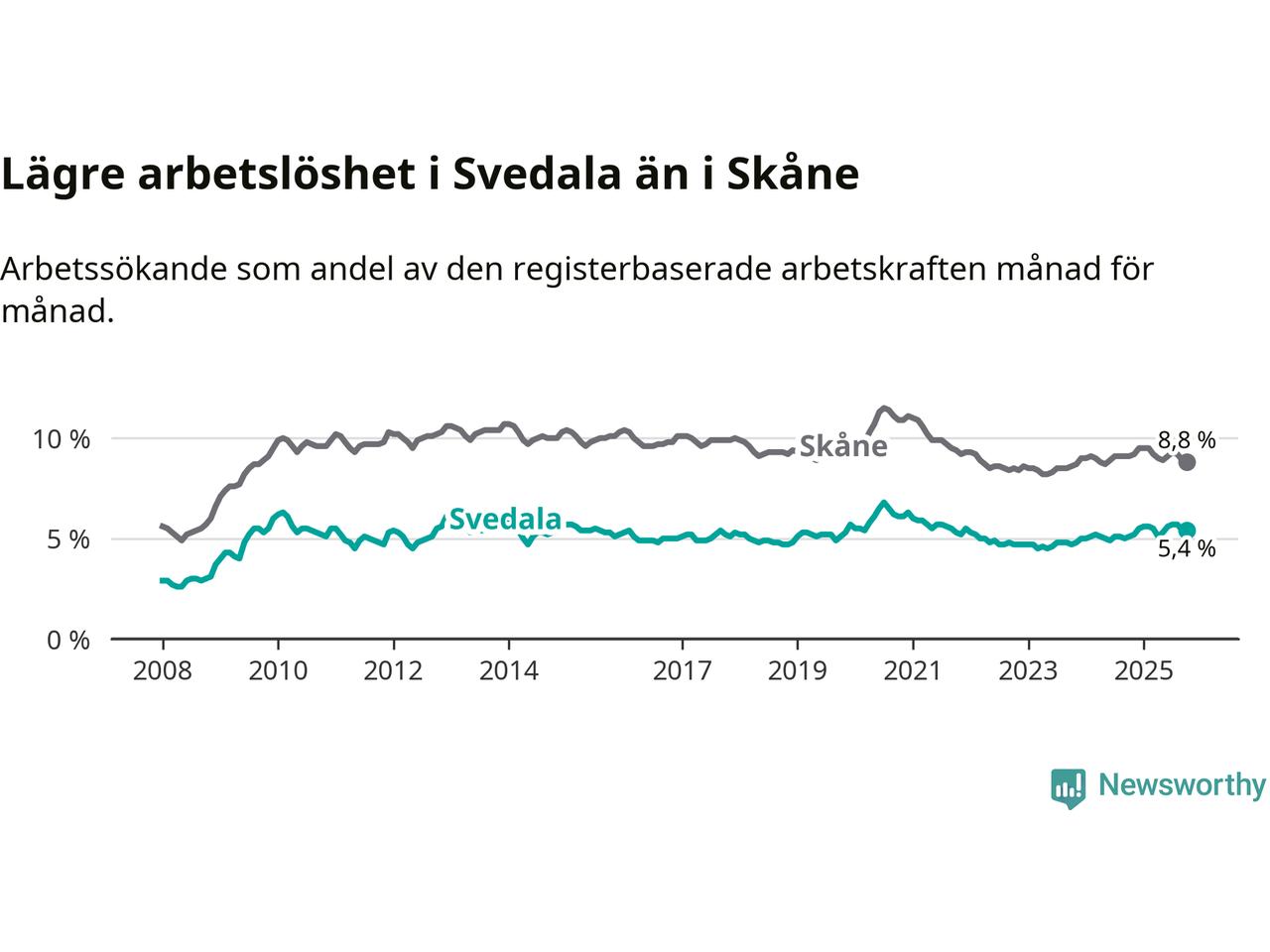 Även om arbetslösheten i Svedala alltså ökar, så ligger den fortfarande under snittet i hela Skåne län (5,4 procent i kommunen, jämfört med 8,8 procent i hela länet). Lomma har den lägsta arbetslösheten i länet (4,1 procent), medan Perstorp har den högsta (13,6 procent). För att Svedala skulle komma ner i samma arbetslöshetsnivå som Lomma skulle 153 personer behöva sysselsättas.