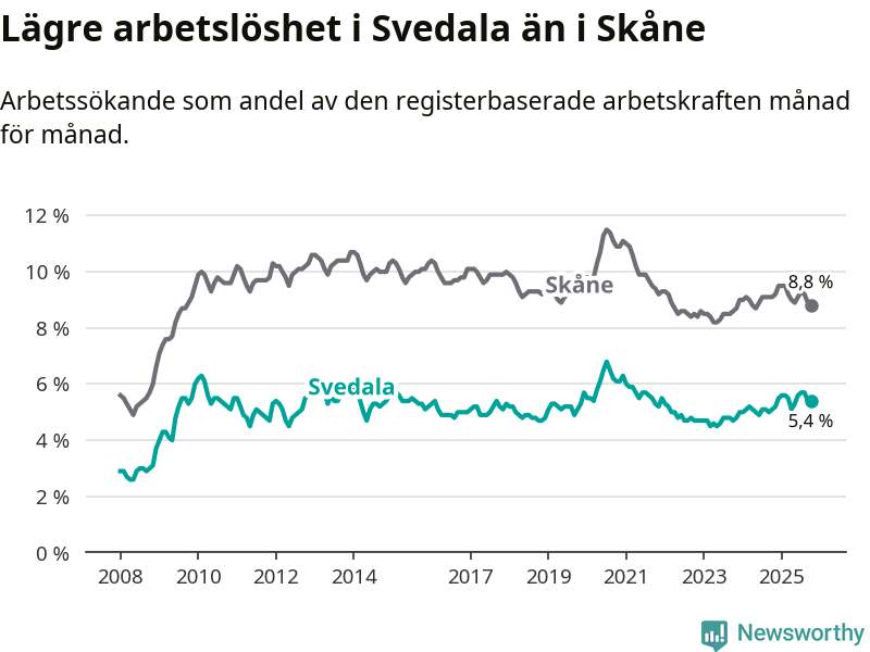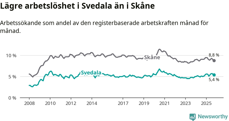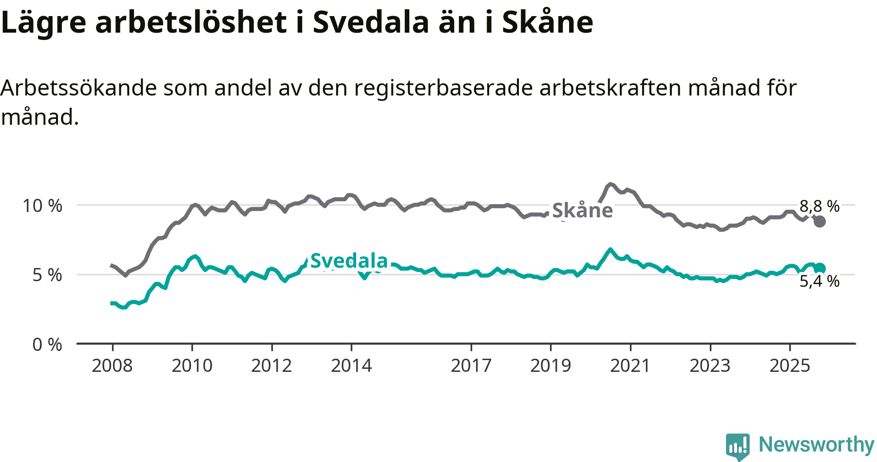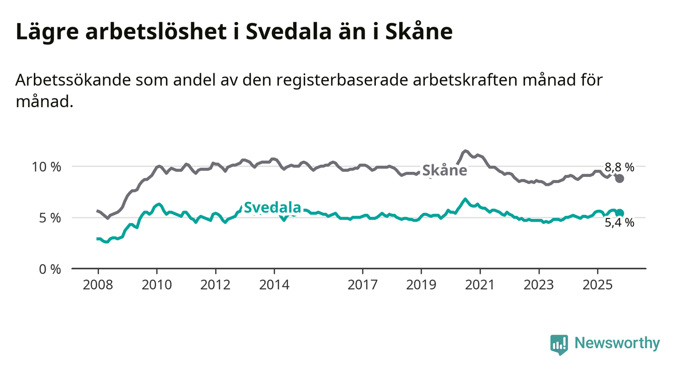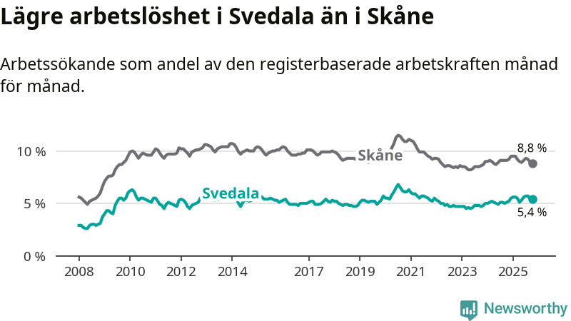 Även om arbetslösheten i Svedala alltså ökar, så ligger den fortfarande under snittet i hela Skåne län (5,4 procent i kommunen, jämfört med 8,8 procent i hela länet). Lomma har den lägsta arbetslösheten i länet (4,1 procent), medan Perstorp har den högsta (13,6 procent). För att Svedala skulle komma ner i samma arbetslöshetsnivå som Lomma skulle 153 personer behöva sysselsättas.