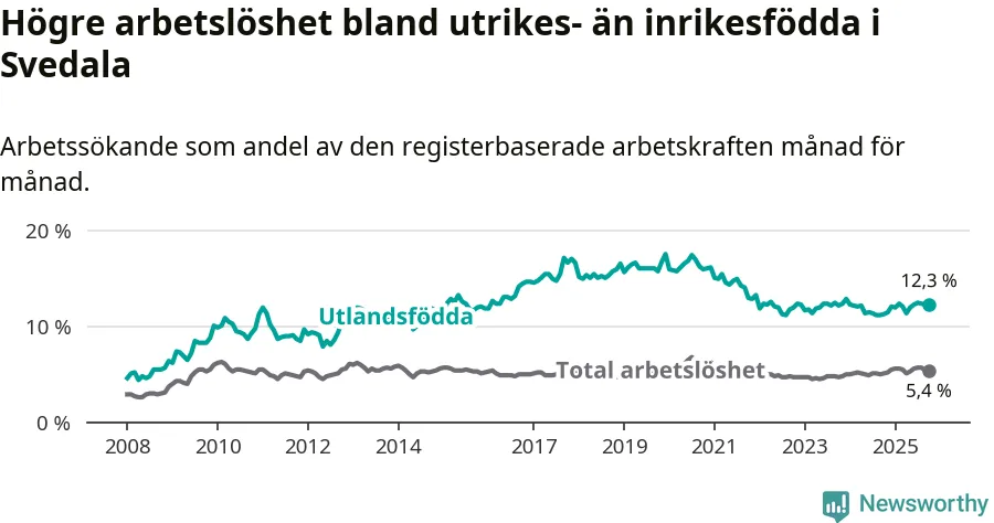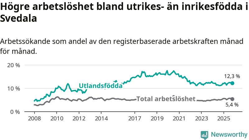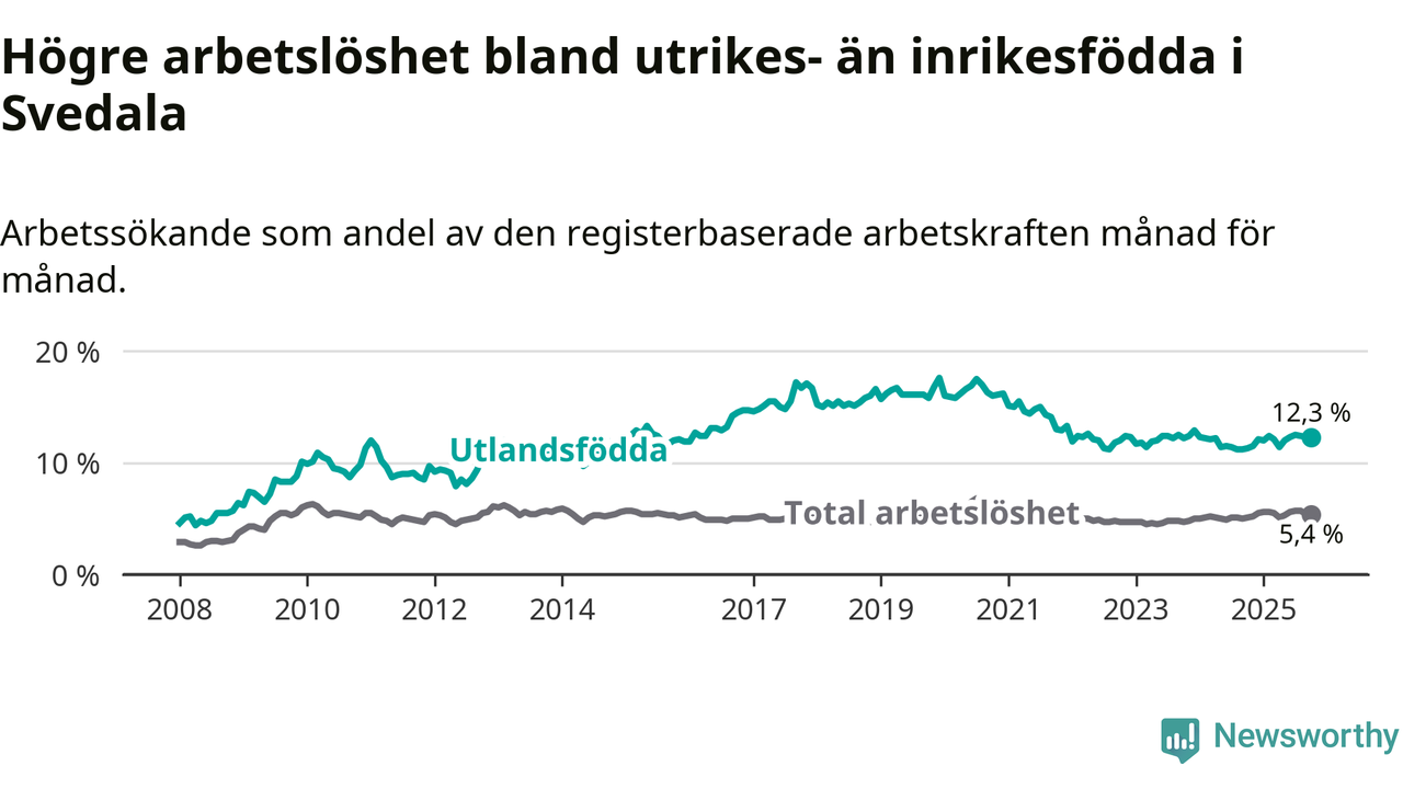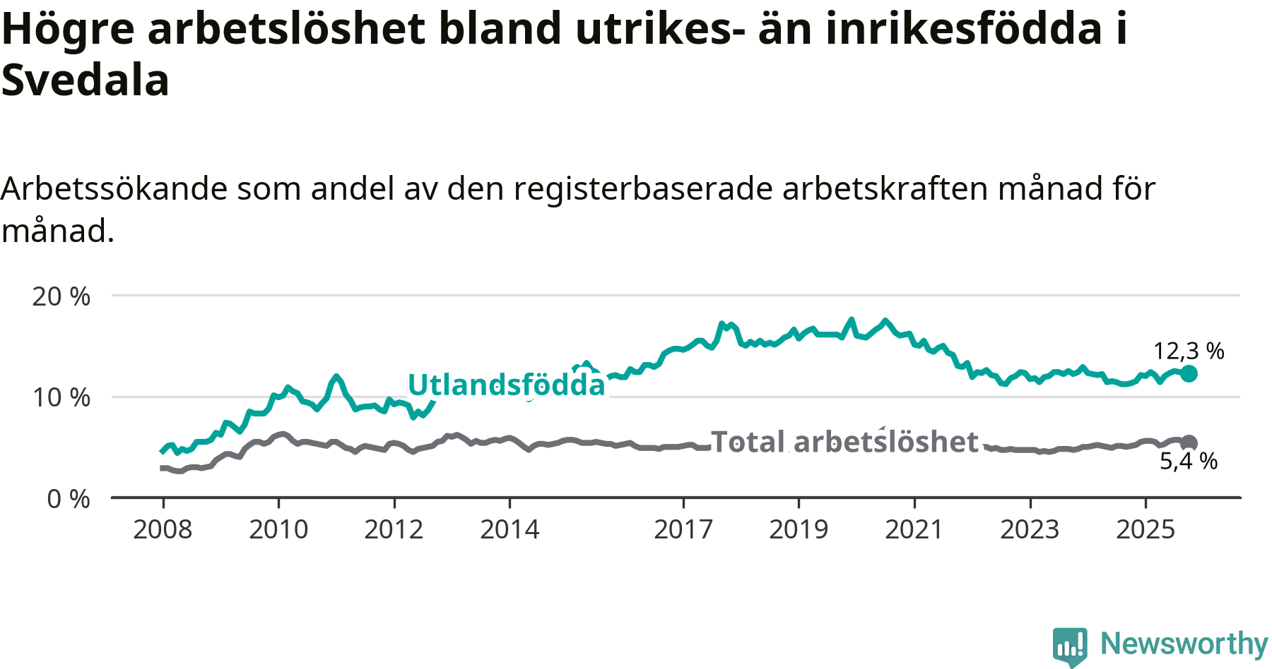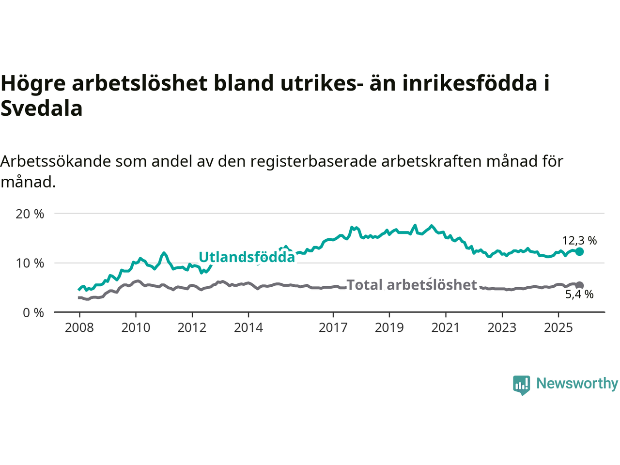 Arbetslösheten bland utlandsfödda var 12,3 procent i Svedala under oktober månad, motsvarande 236 av 1 919 personer. Det är 1,0 procentenheter fler än vid samma tidpunkt i fjol (+24 om man räknar personer). Därmed är de utlandsföddas arbetslöshet högre än vid samma tidpunkt i fjol för sjätte månaden i följd.