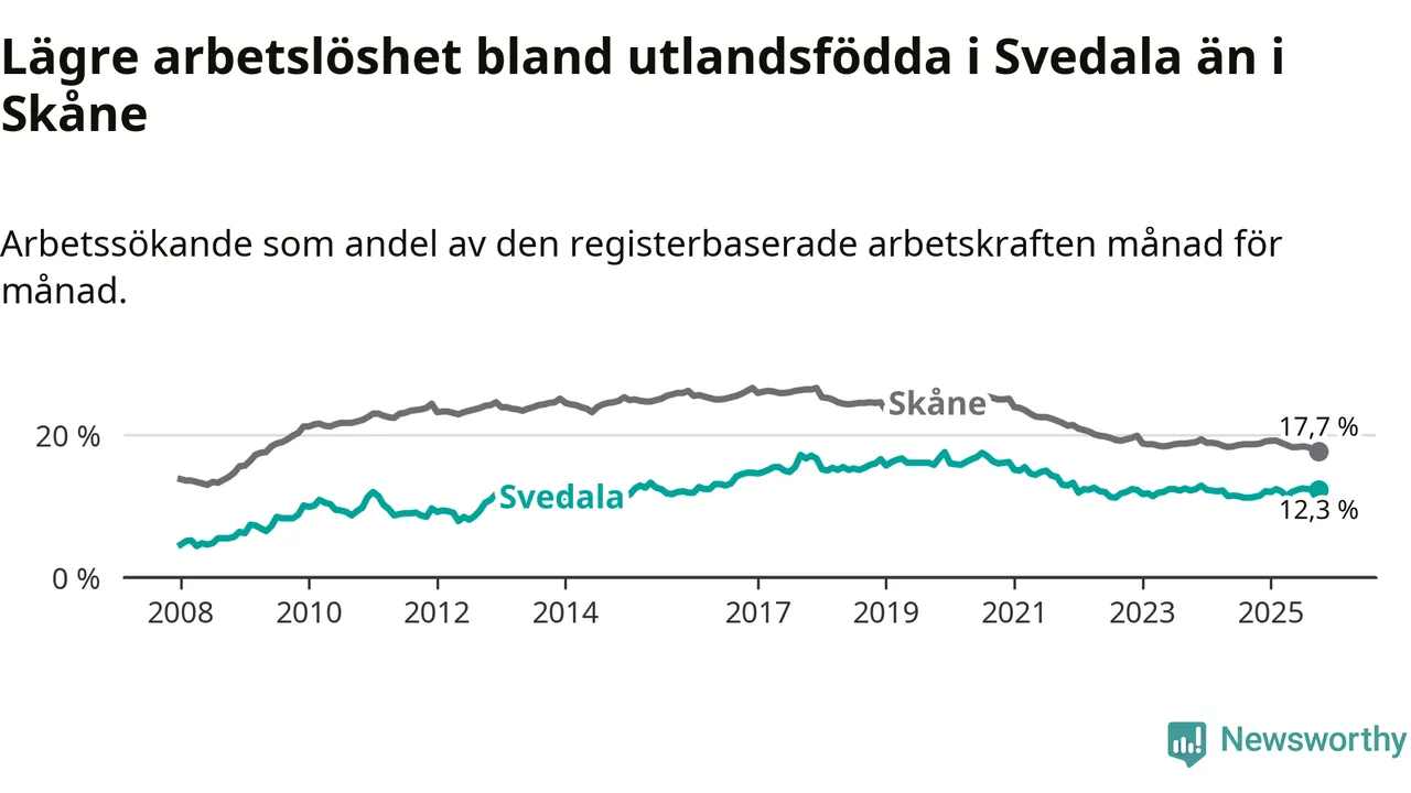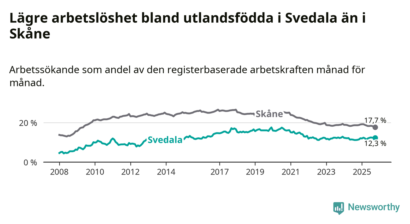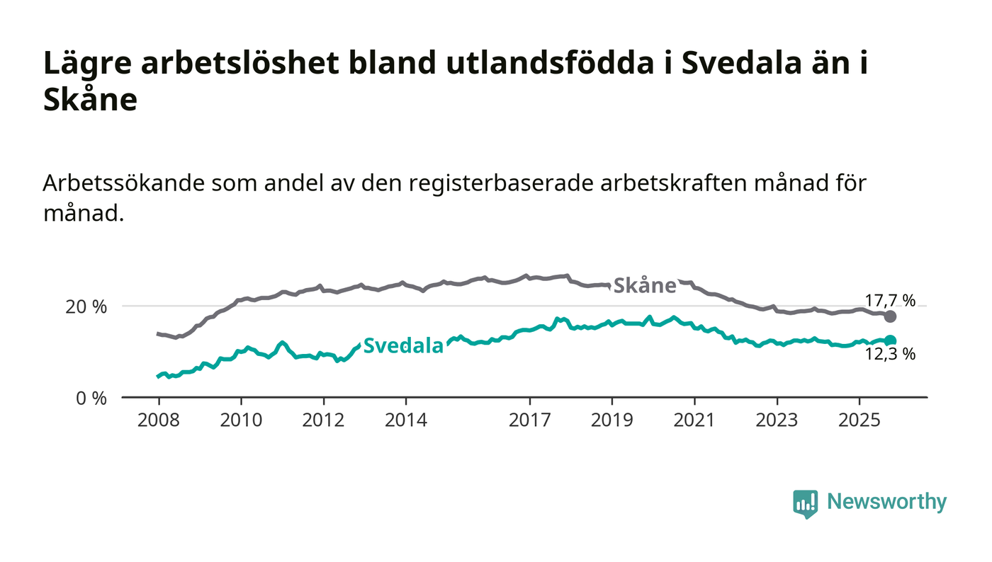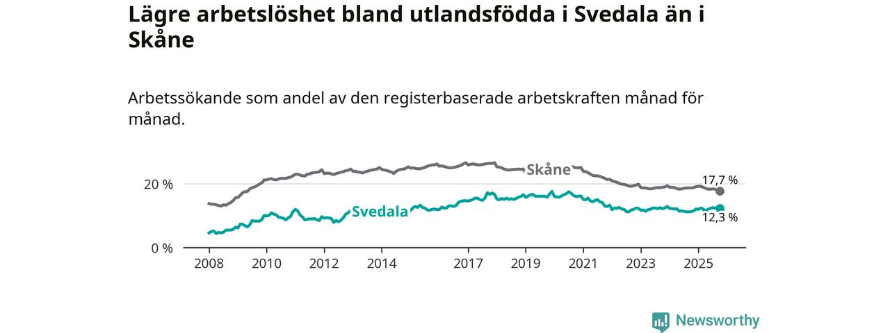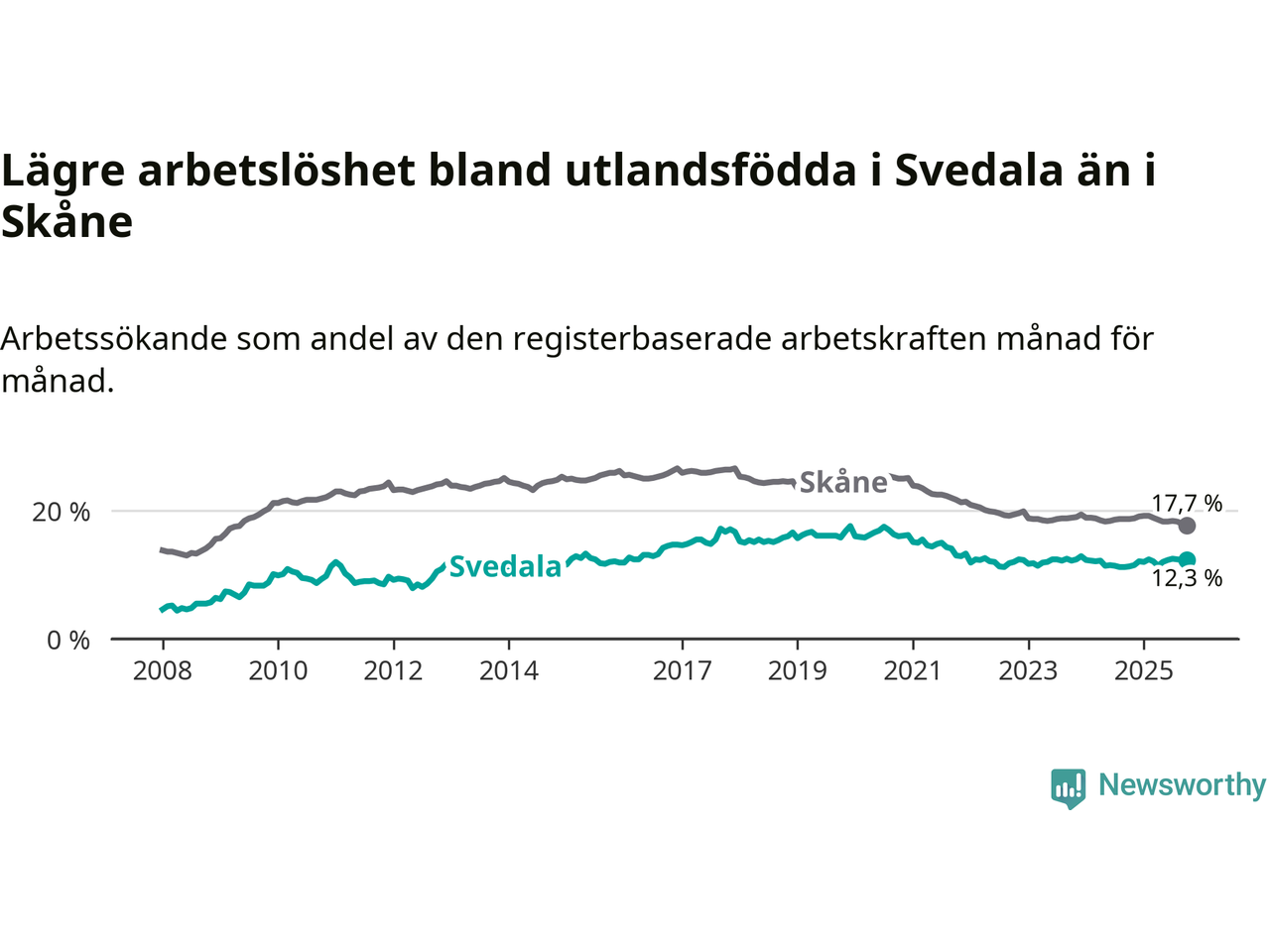 Medan arbetslösheten bland utlandsfödda alltså ökar i Svedala så minskar den i Skåne. Jämfört med oktober förra året har andelen arbetslösa utlandsfödda i länet minskat med 1,0 procentenheter (till 17,7 procent). Trots den senaste uppgången har Svedala med andra ord fortfarande lägre arbetslöshet bland utlandsfödda än Skåne.