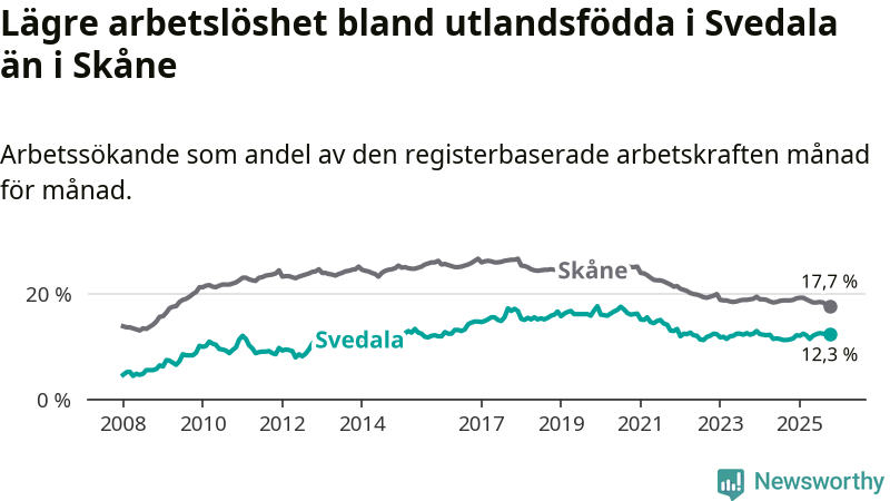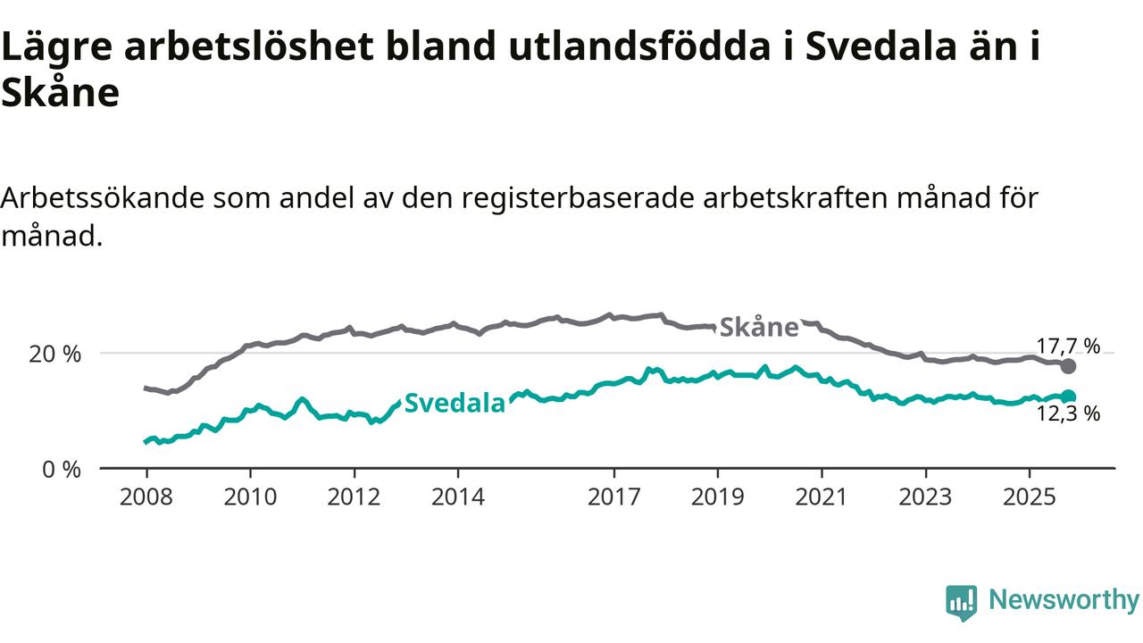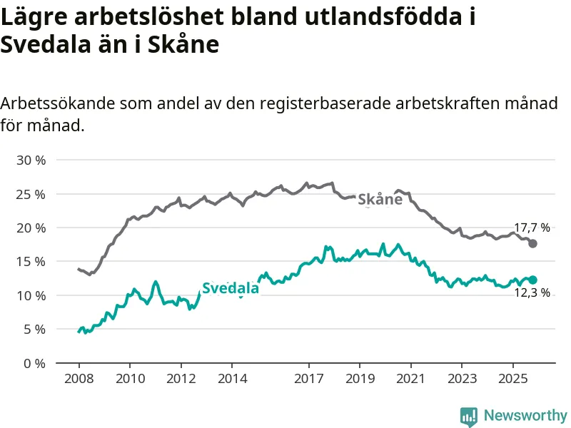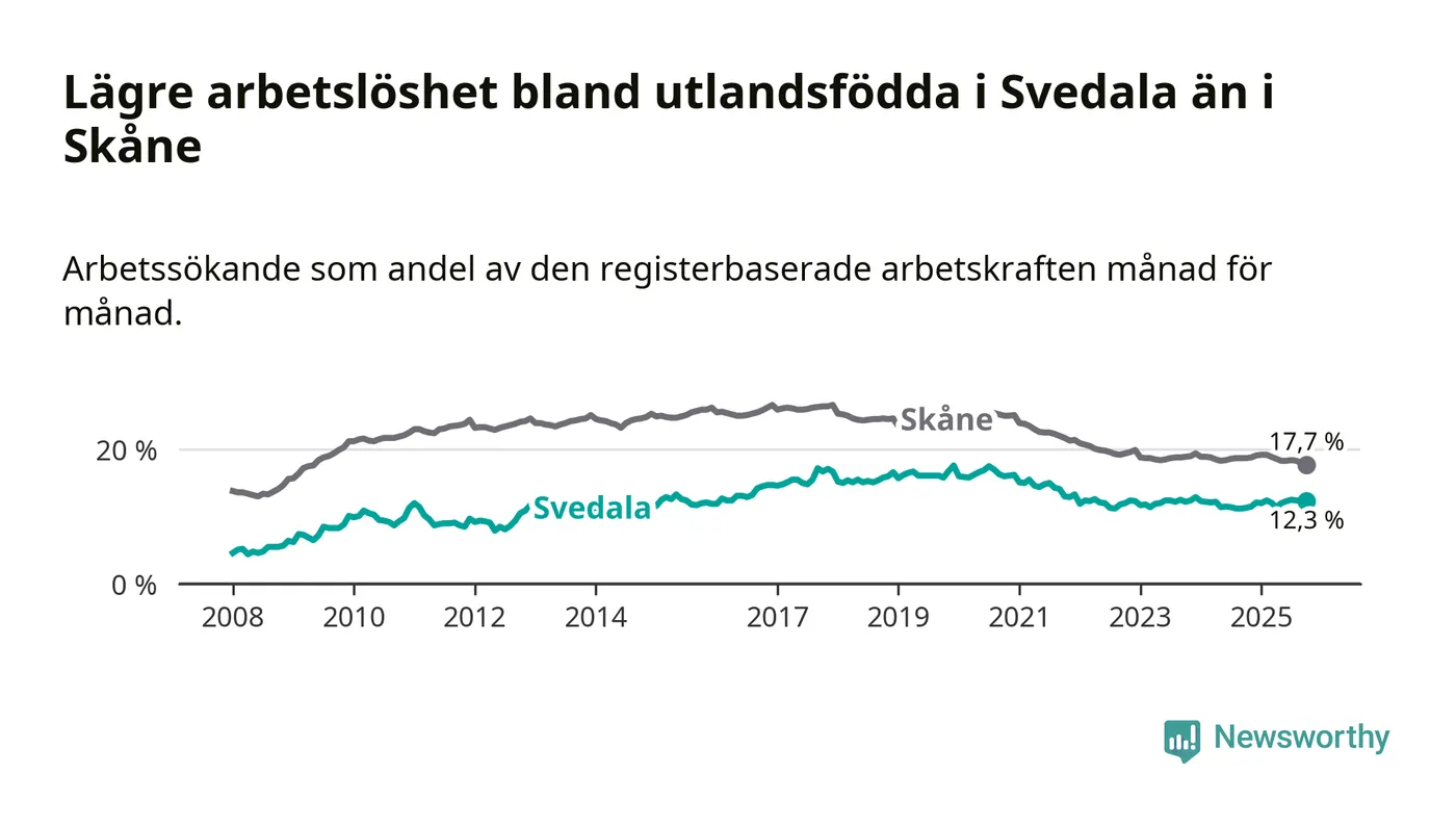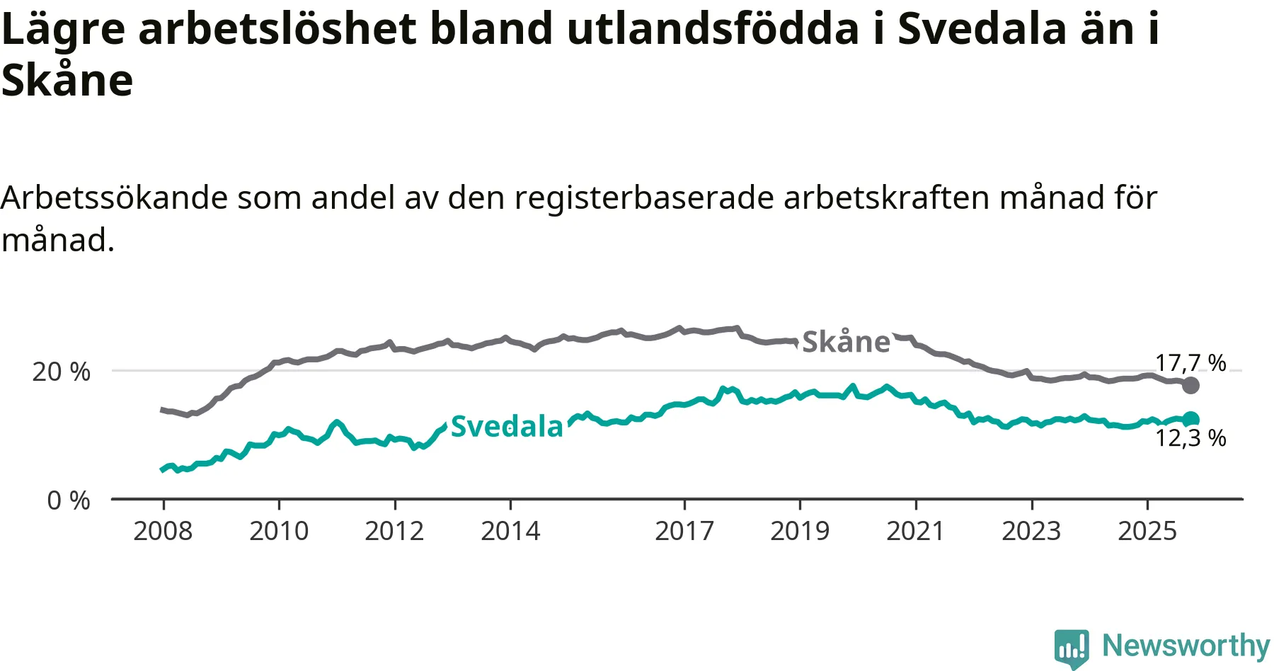 Medan arbetslösheten bland utlandsfödda alltså ökar i Svedala så minskar den i Skåne. Jämfört med oktober förra året har andelen arbetslösa utlandsfödda i länet minskat med 1,0 procentenheter (till 17,7 procent). Trots den senaste uppgången har Svedala med andra ord fortfarande lägre arbetslöshet bland utlandsfödda än Skåne.