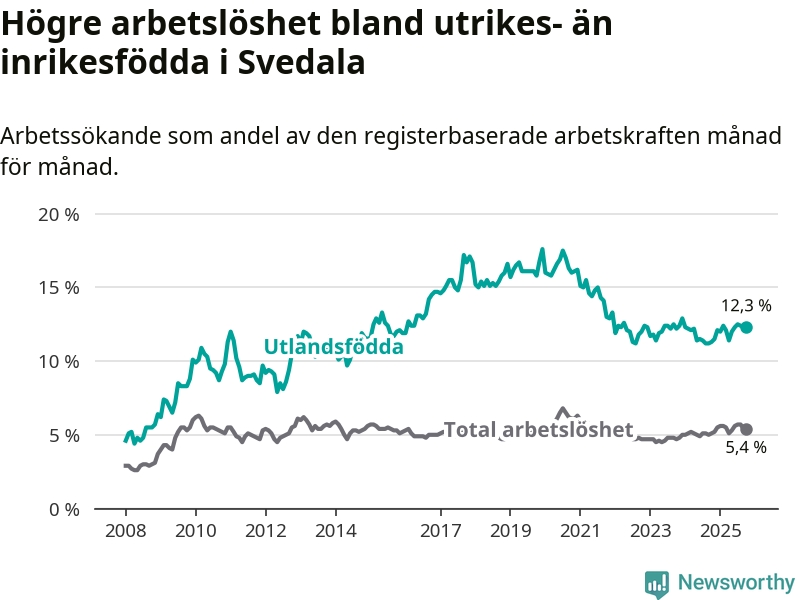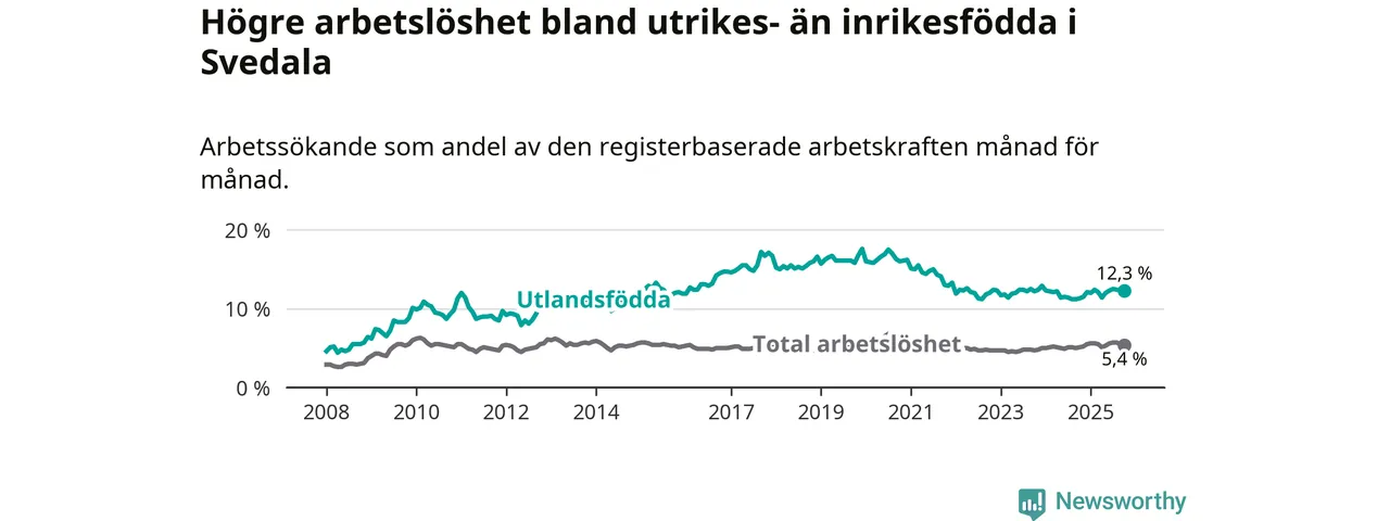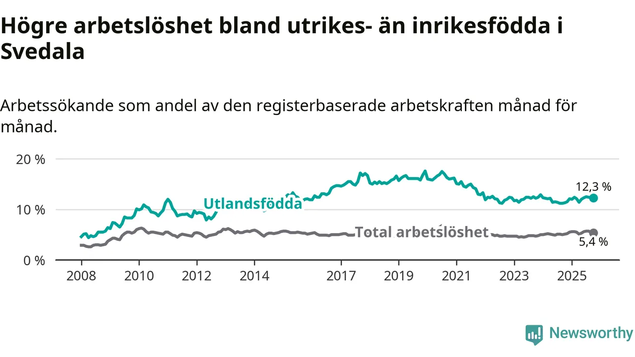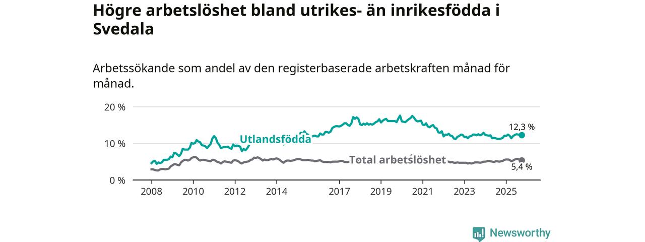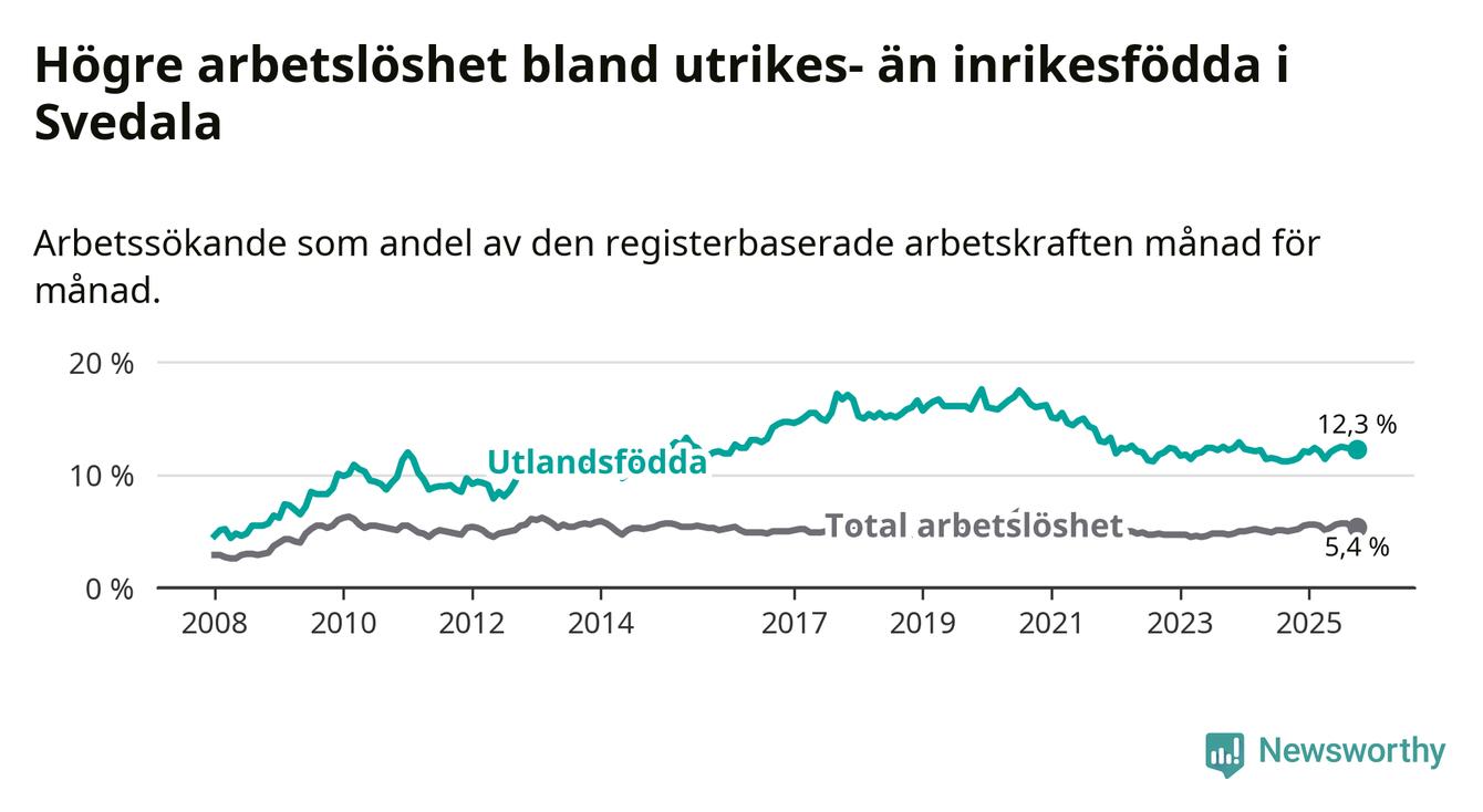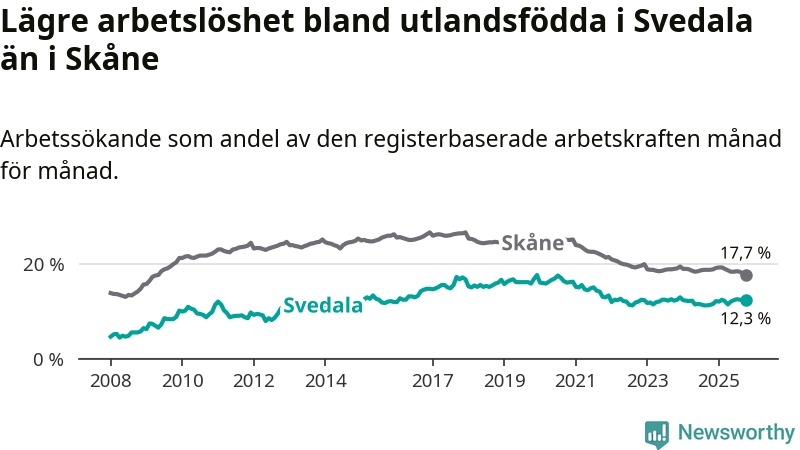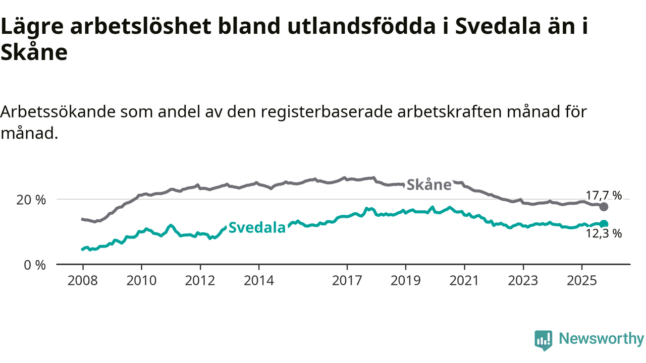 Medan arbetslösheten bland utlandsfödda alltså ökar i Svedala så minskar den i Skåne. Jämfört med oktober förra året har andelen arbetslösa utlandsfödda i länet minskat med 1,0 procentenheter (till 17,7 procent). Trots den senaste uppgången har Svedala med andra ord fortfarande lägre arbetslöshet bland utlandsfödda än Skåne.