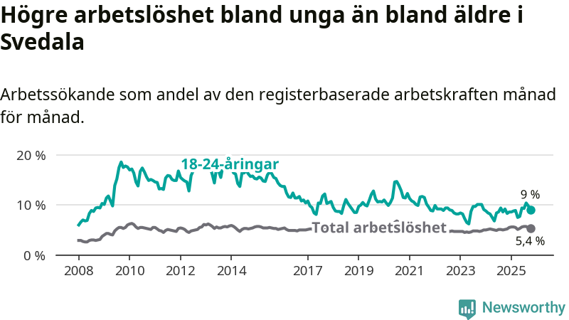 Till skillnad från den totala arbetslösheten sjunker arbetslösheten bland unga (−0,2 procentenheter). I oktober var 9,0 procent av 18–24-åringarna inskrivna som arbetssökande (motsvarande 85 personer). Mäter vi antalet inskrivna ser vi en minskning med två personer på ett års sikt.