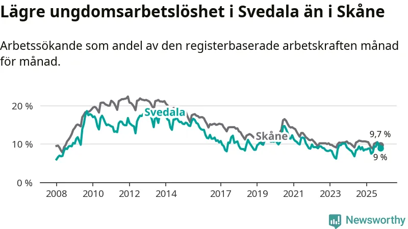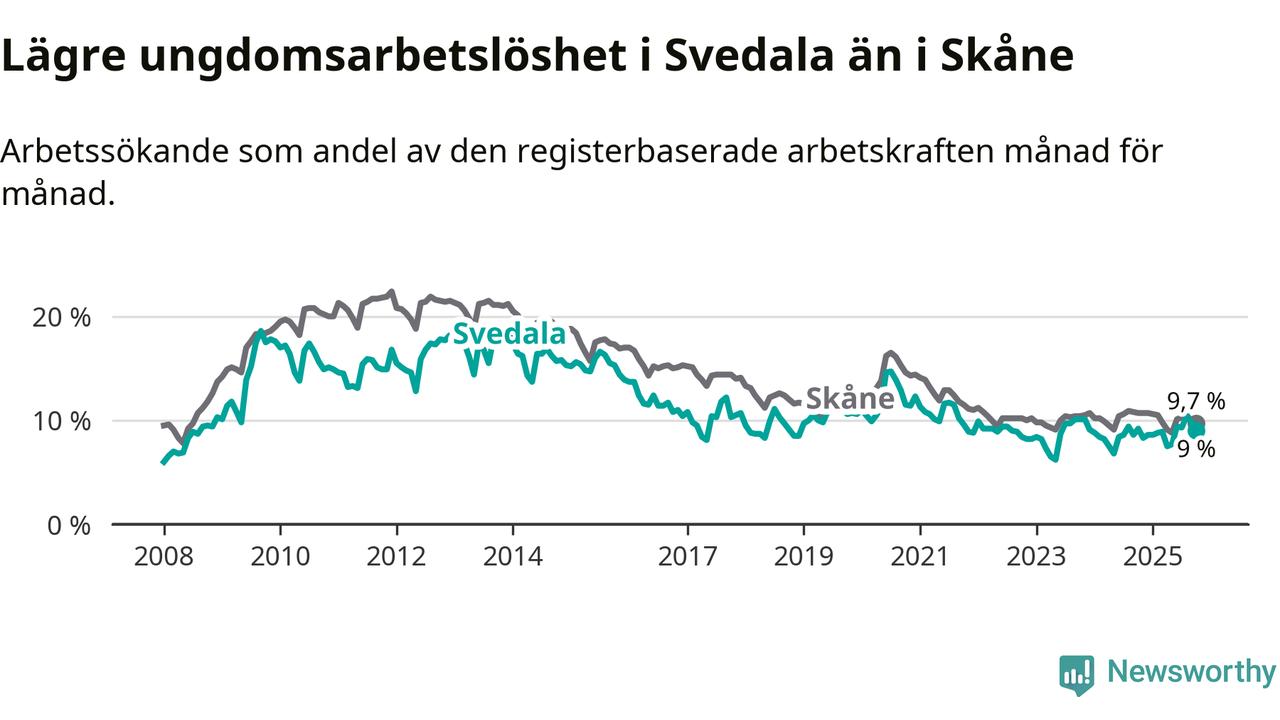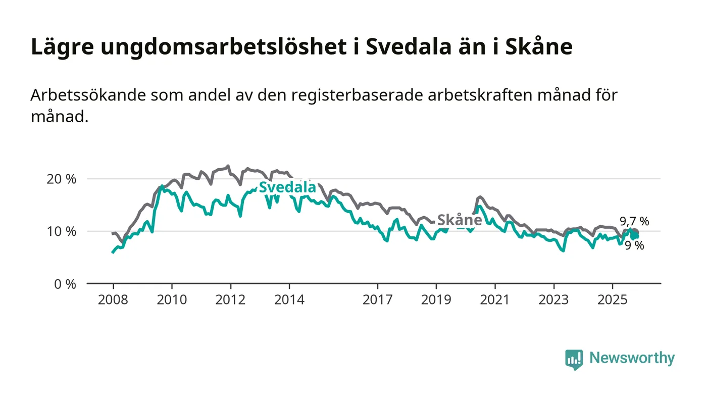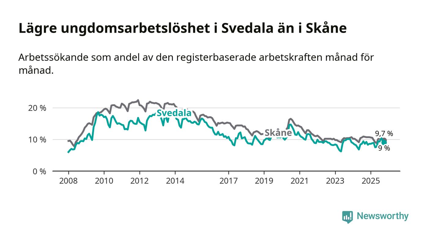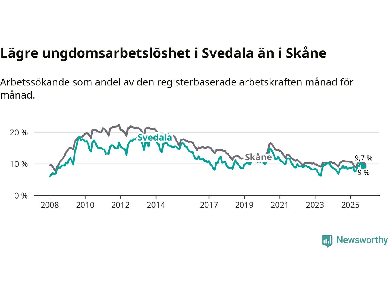 Precis som den totala arbetslösheten ligger ungdomsarbetslösheten i Svedala lägre än i Skåne som helhet. Skillnaden mellan kommunen och länet är 0,7 procentenheter.