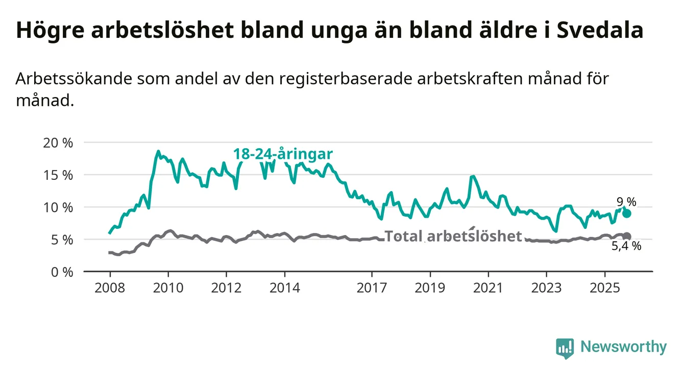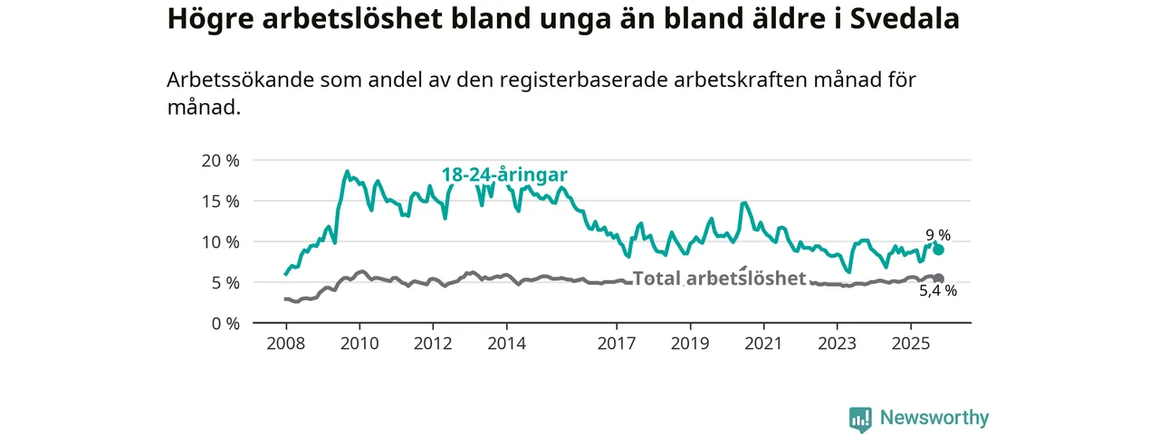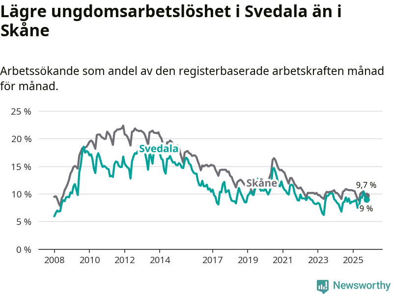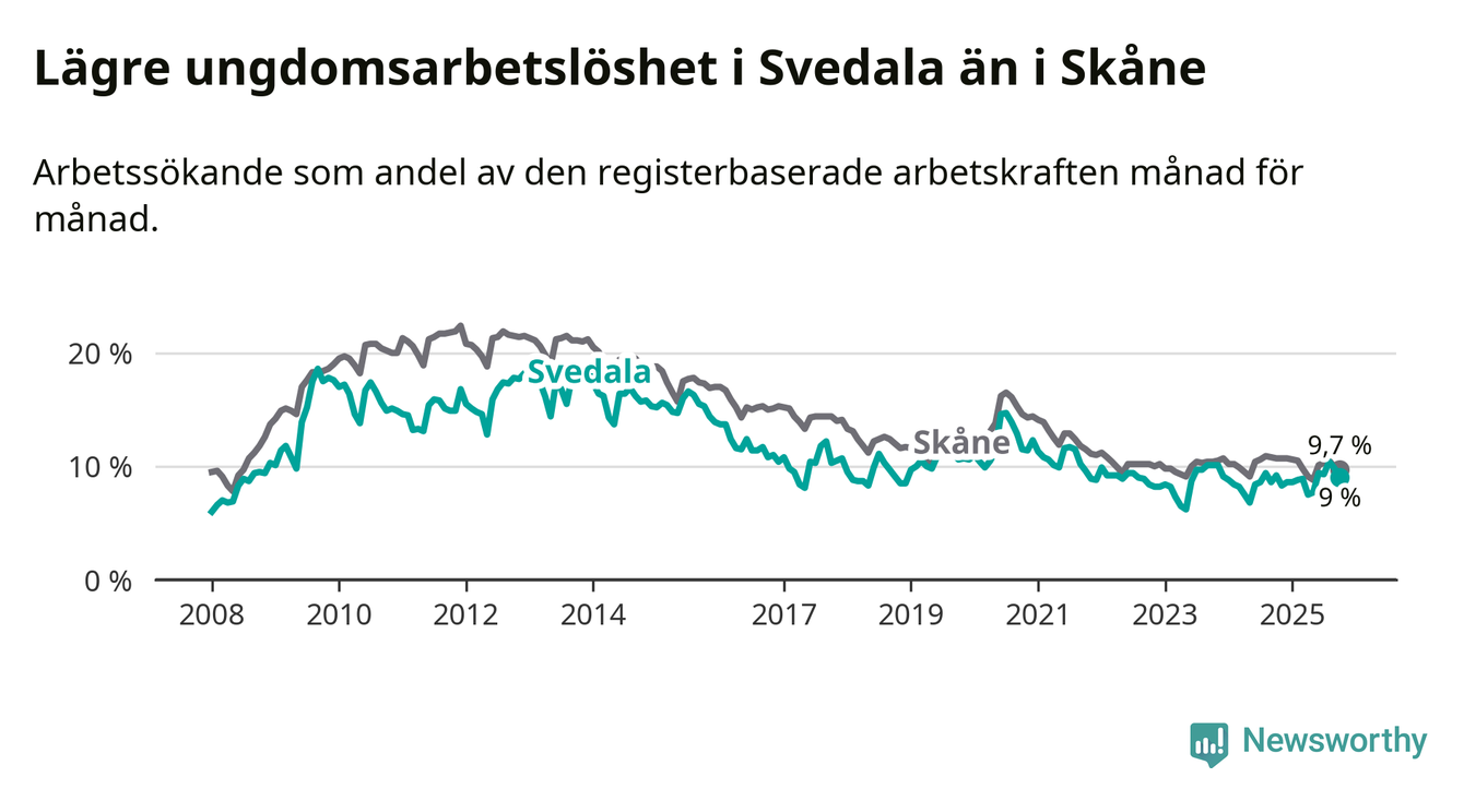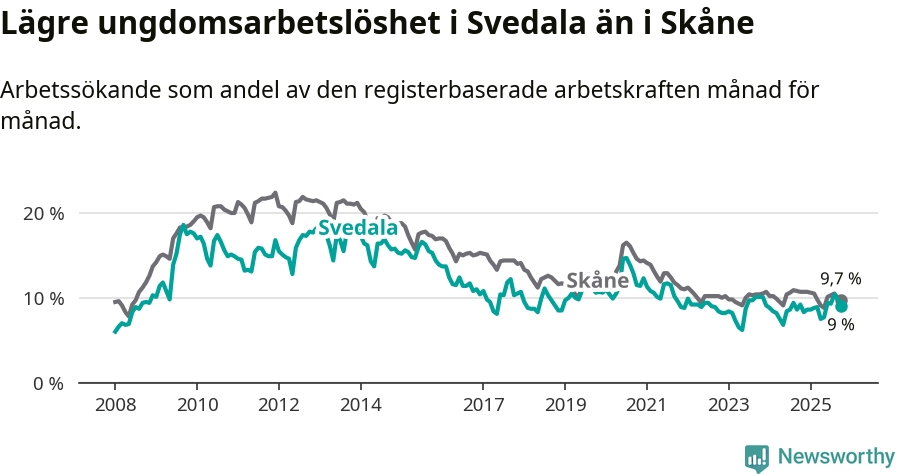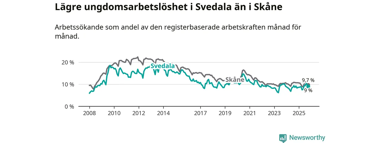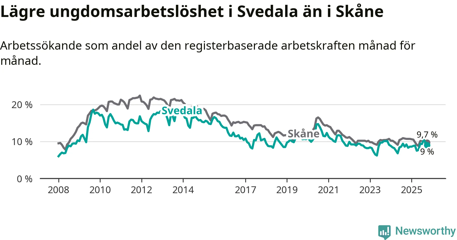 Precis som den totala arbetslösheten ligger ungdomsarbetslösheten i Svedala lägre än i Skåne som helhet. Skillnaden mellan kommunen och länet är 0,7 procentenheter.