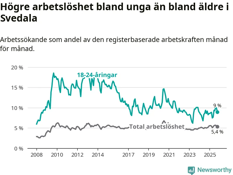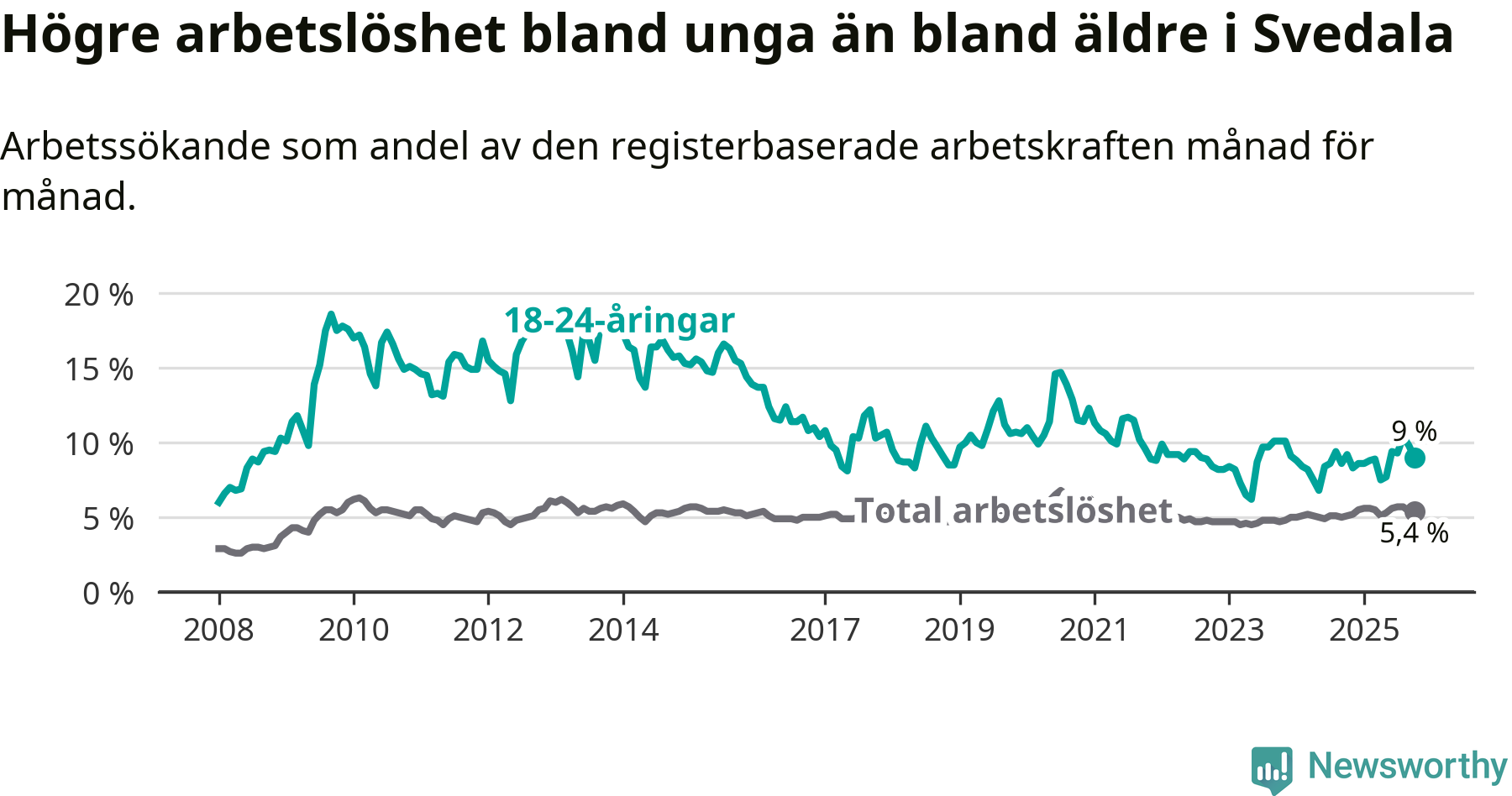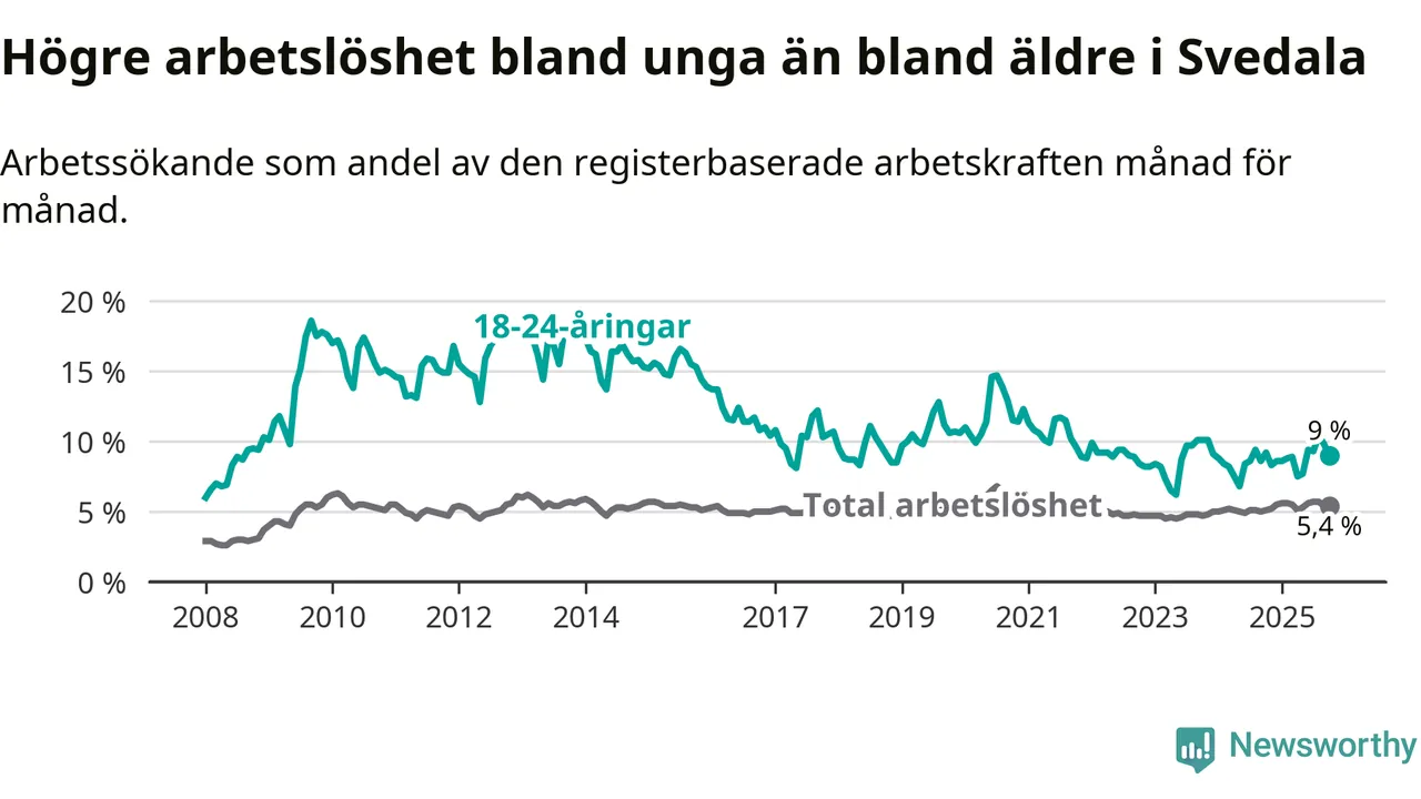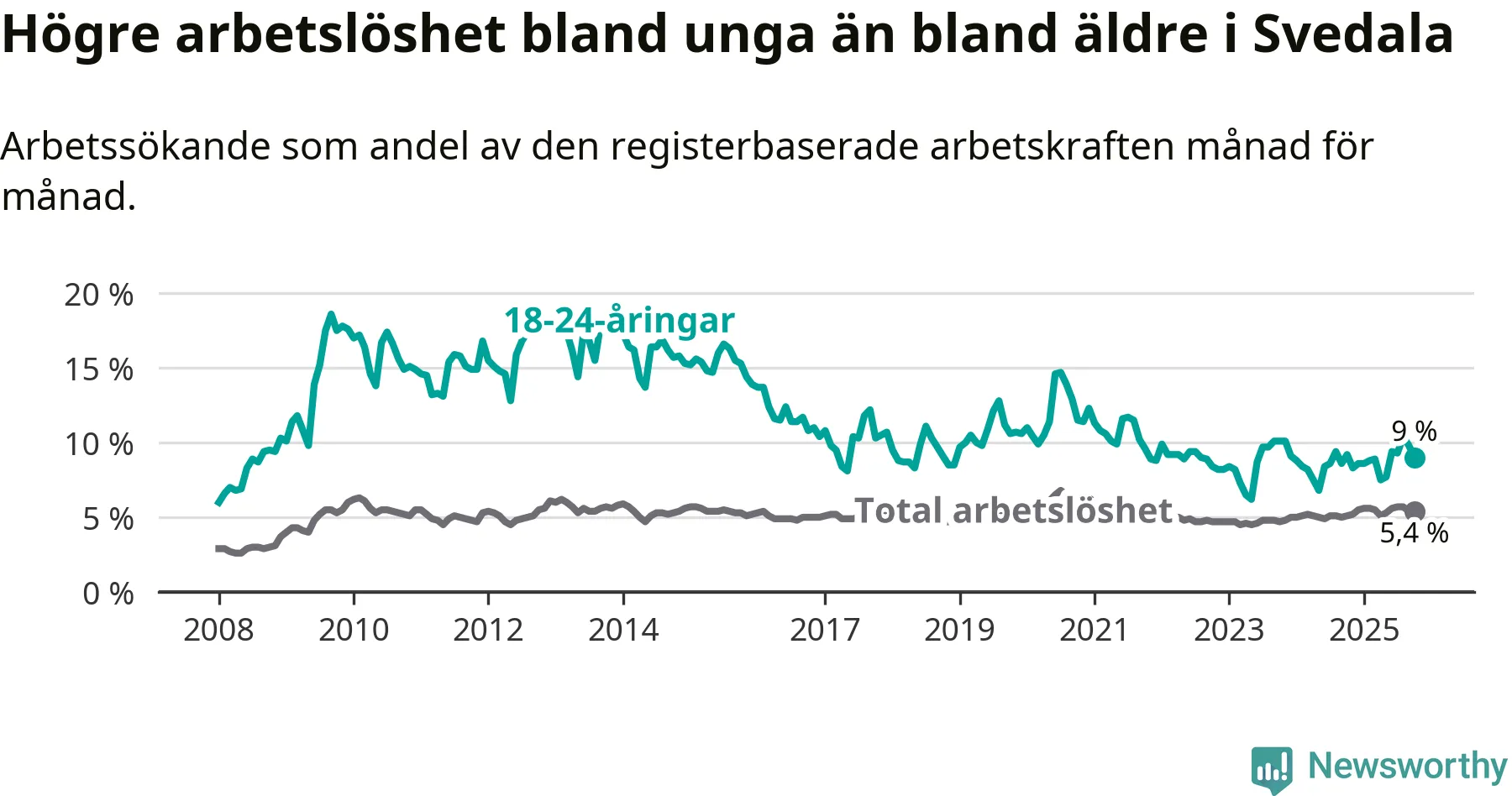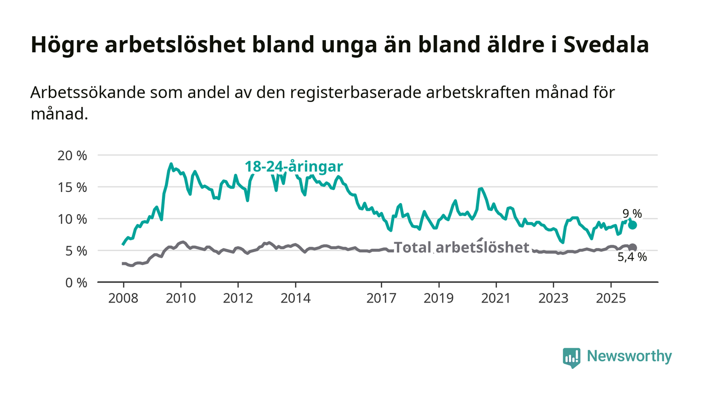Precis som den totala arbetslösheten ligger ungdomsarbetslösheten i Svedala lägre än i Skåne som helhet. Skillnaden mellan kommunen och länet är 0,7 procentenheter.