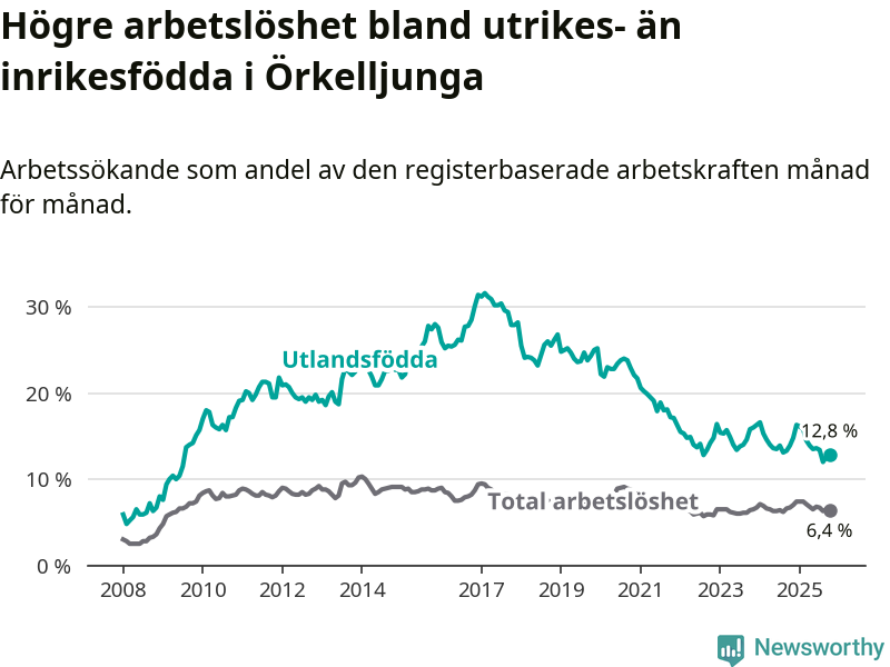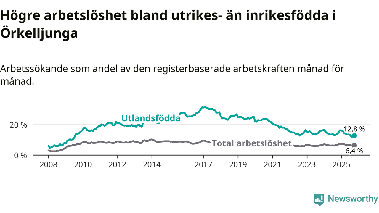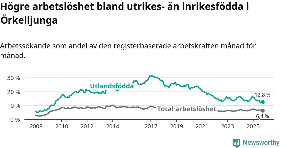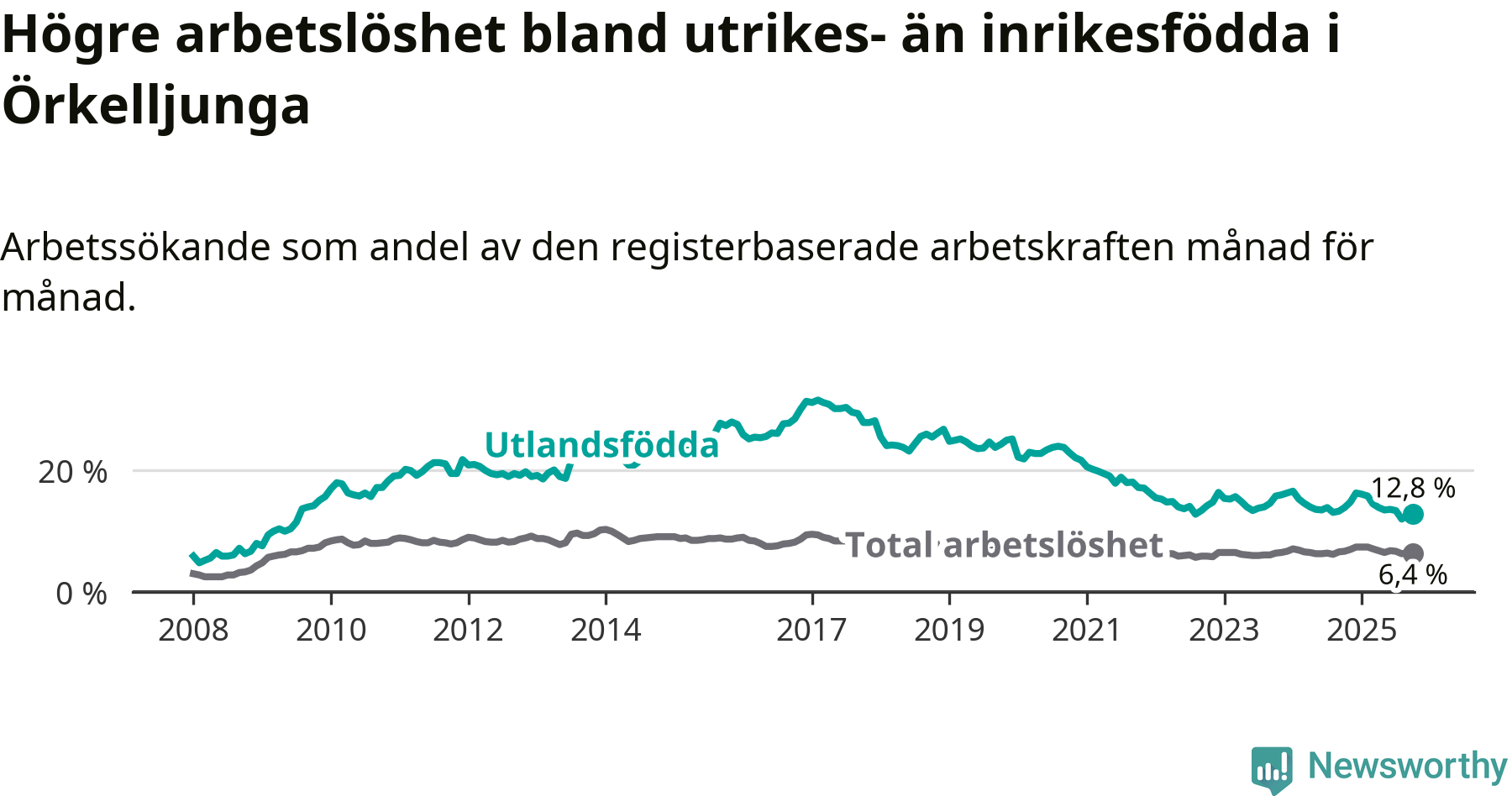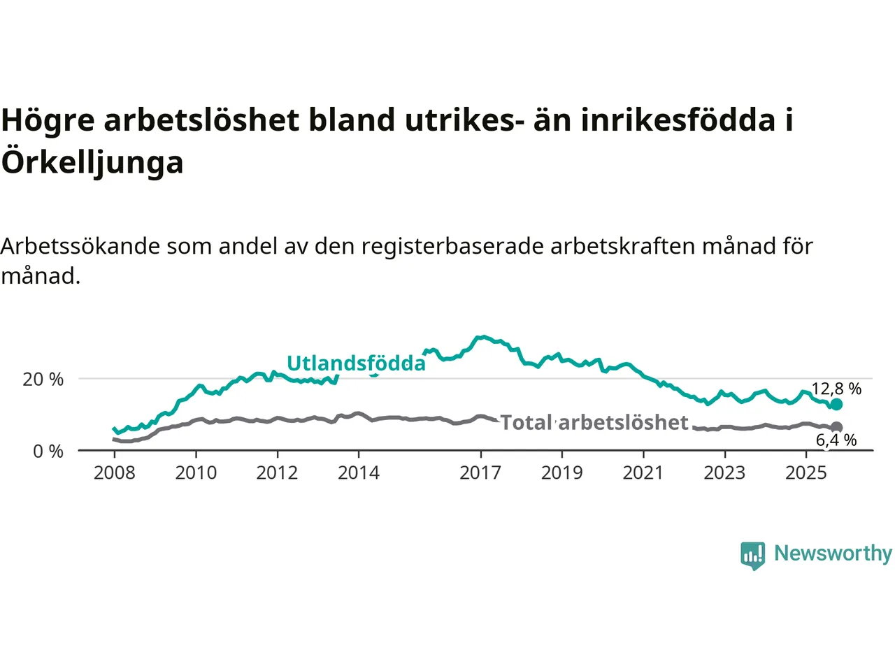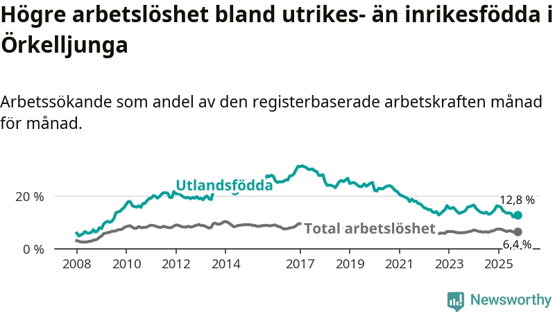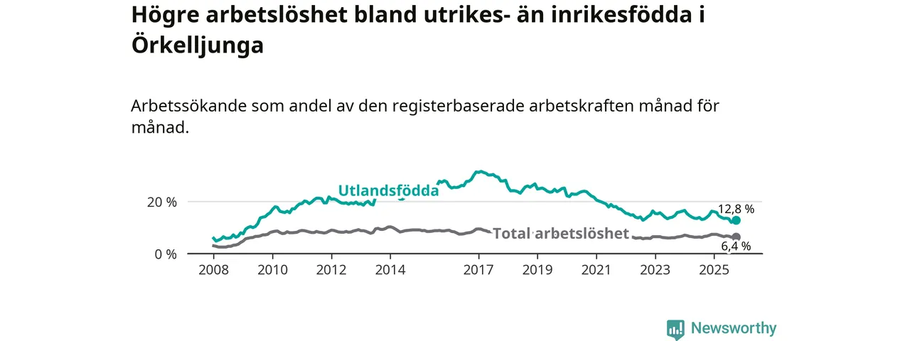Skillnaden i arbetslöshet mellan utrikesfödda och hela befolkningen är 6,4 procentenheter i Örkelljunga. Det är en mindre skillnad än för ett år sedan (−0,8 procentenheter).