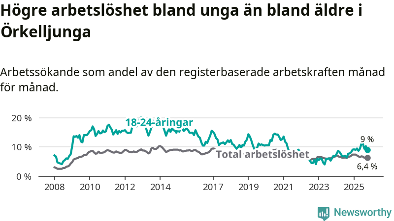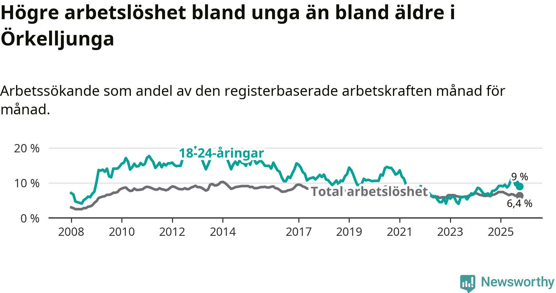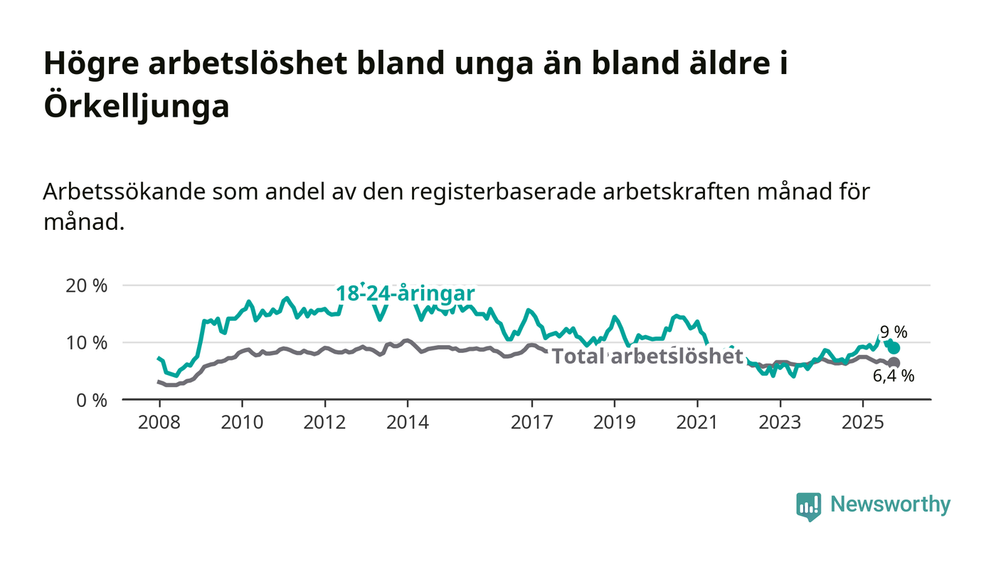 I och med den senaste månadens uppgång har de ungas arbetslöshet i Örkelljunga stigit över två år i sträck (upp från 5,9 procent i juni 2023 till 9,0 procent nu).