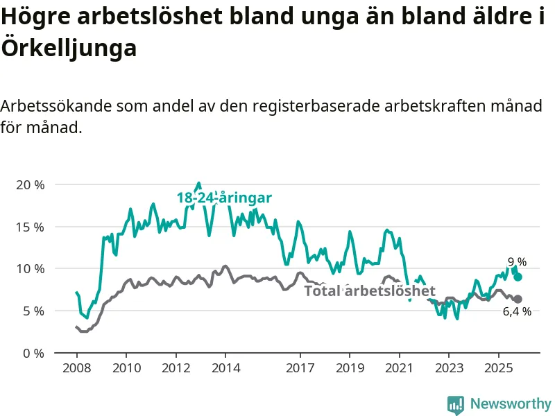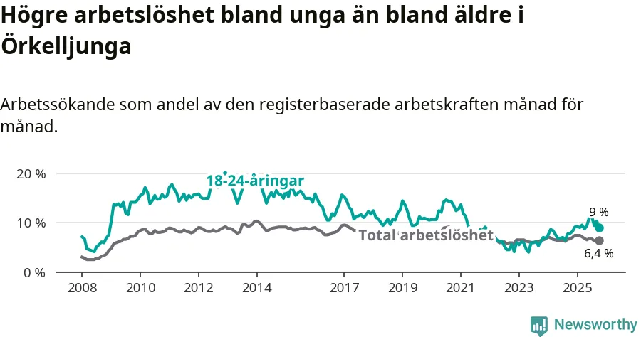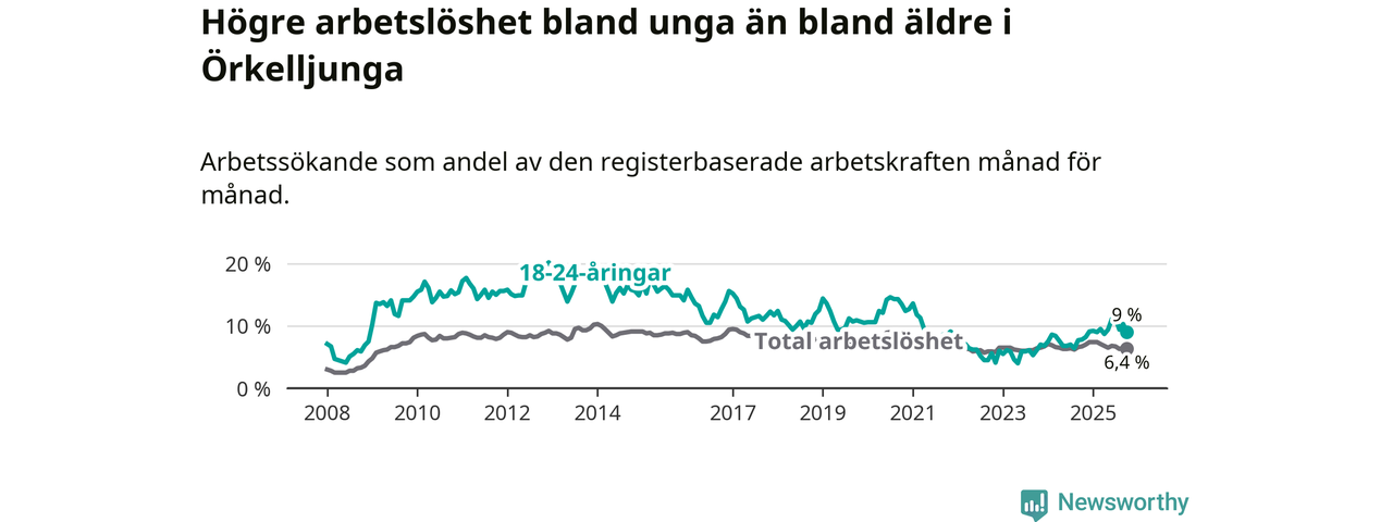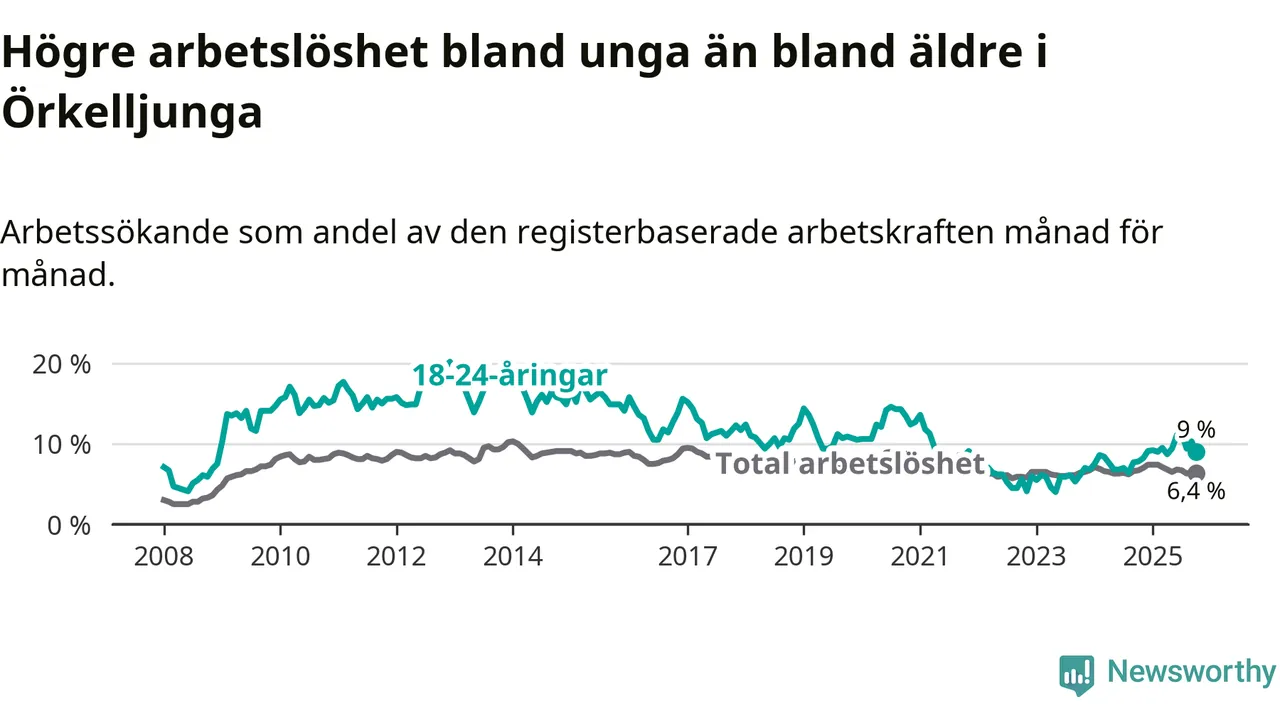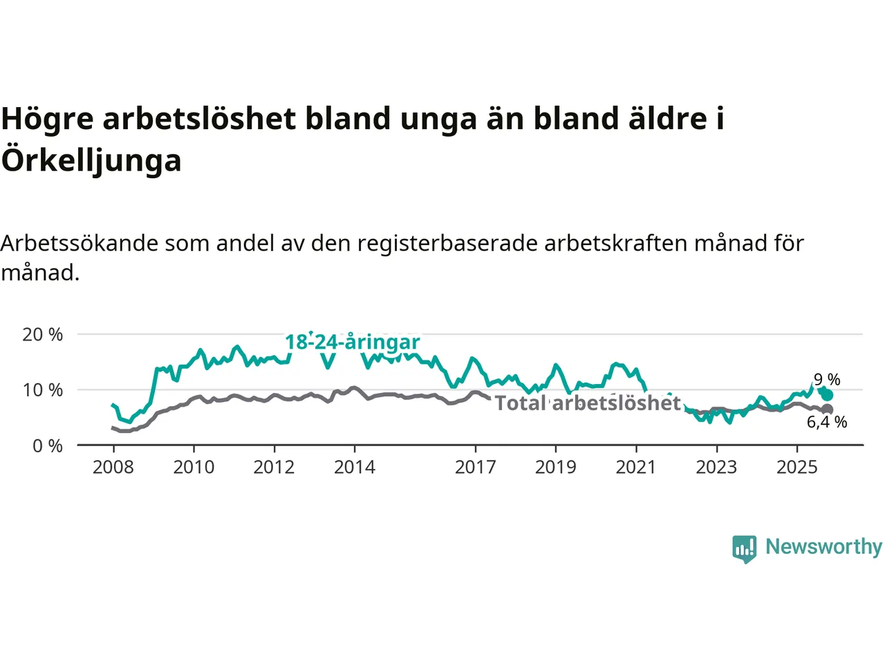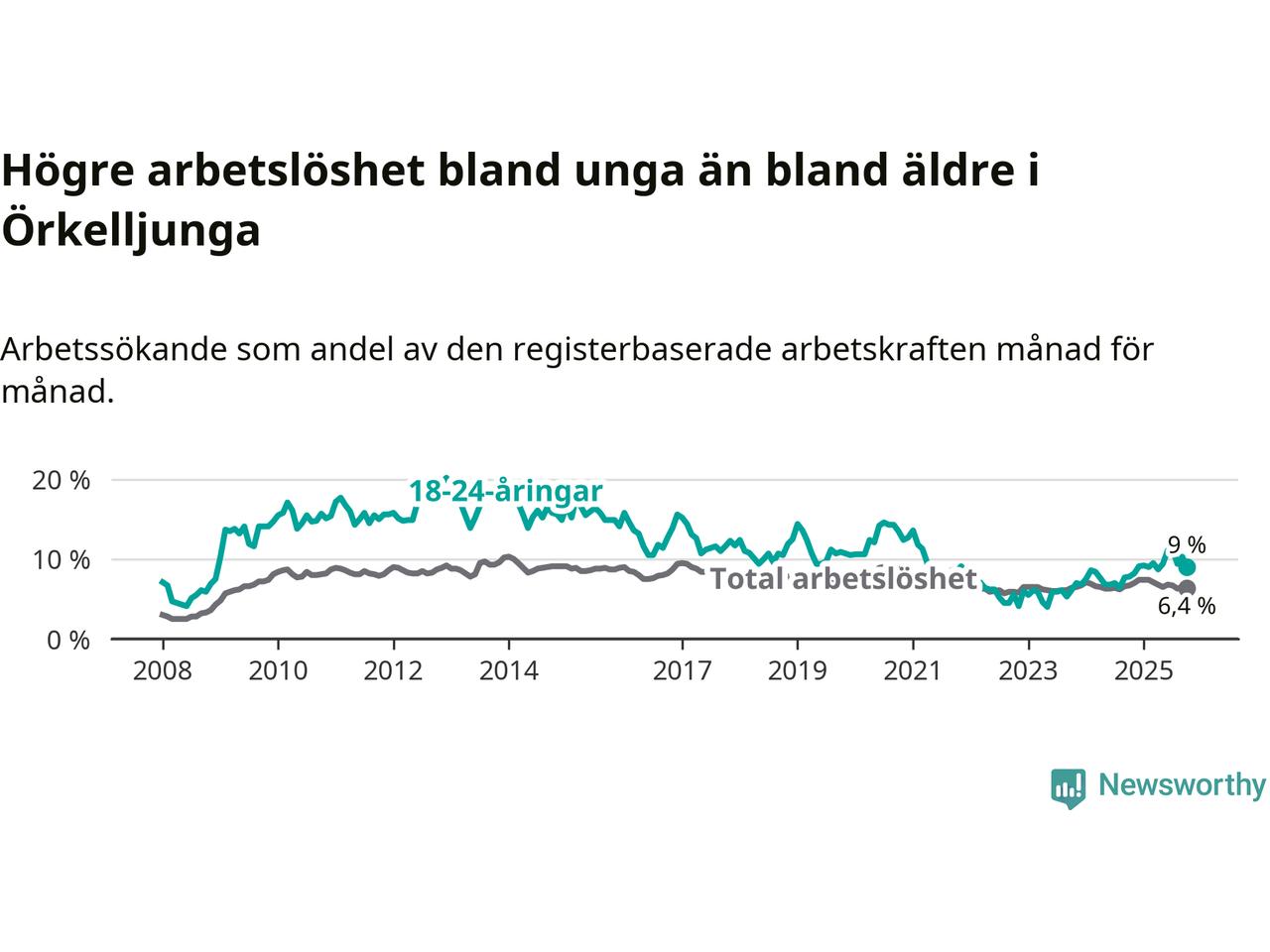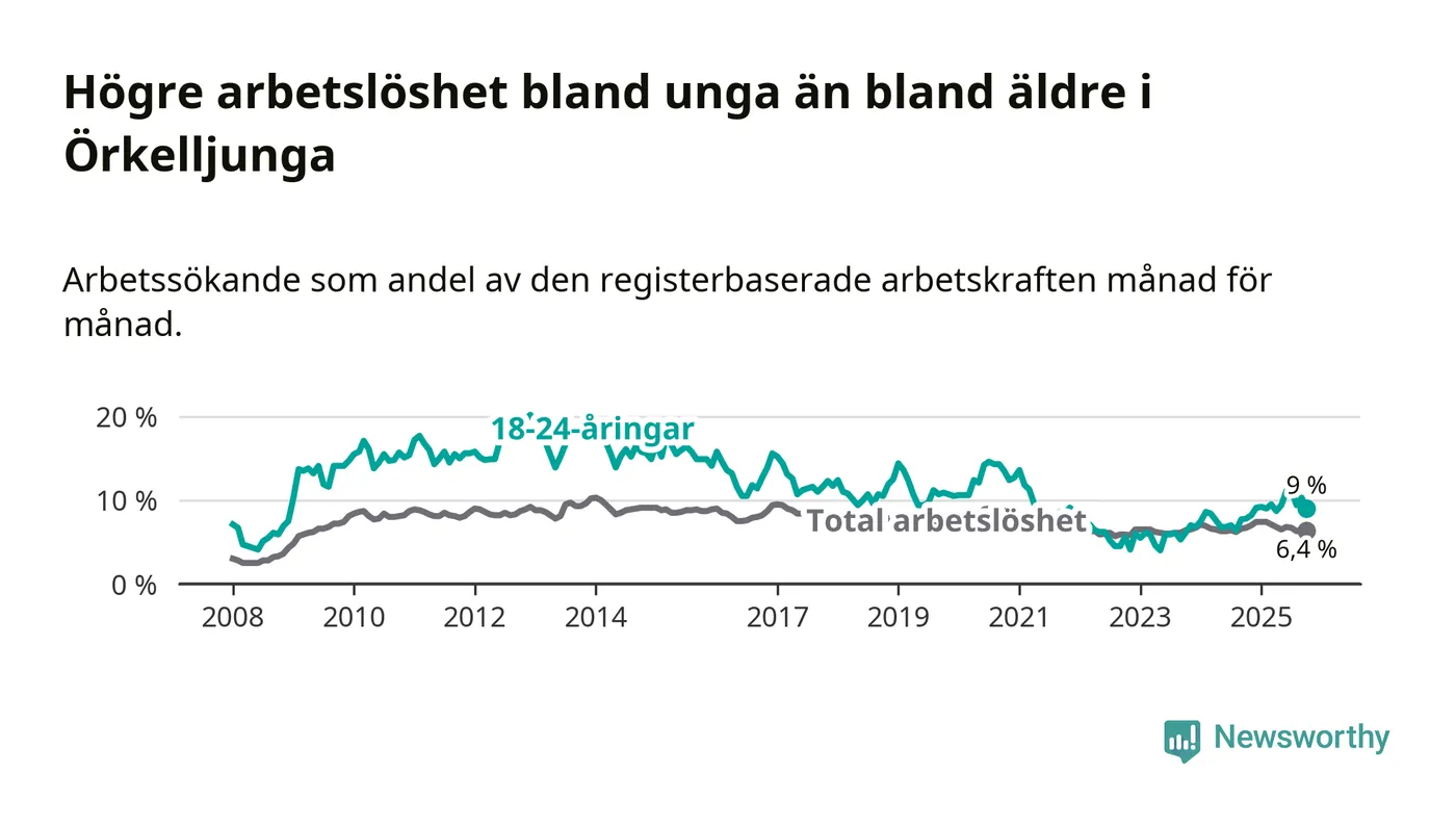 Den senaste månadsstatistiken från Arbetsförmedlingen visar på en uppgång i ungdomsarbetslöshet i Örkelljunga kommun med 1,2 procentenheter. Arbetslösheten bland personer i åldern 18–24 år låg i oktober på 9,0 procent.