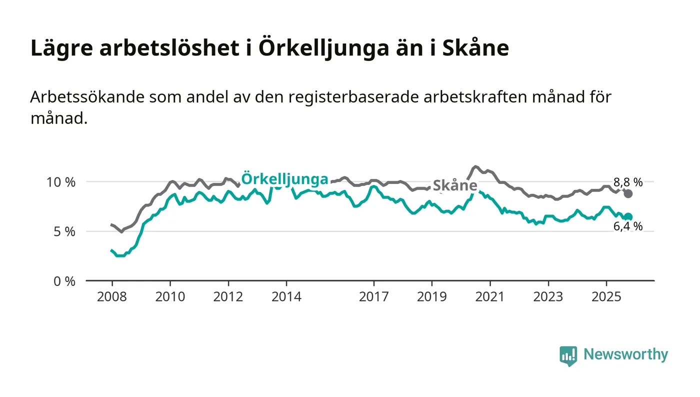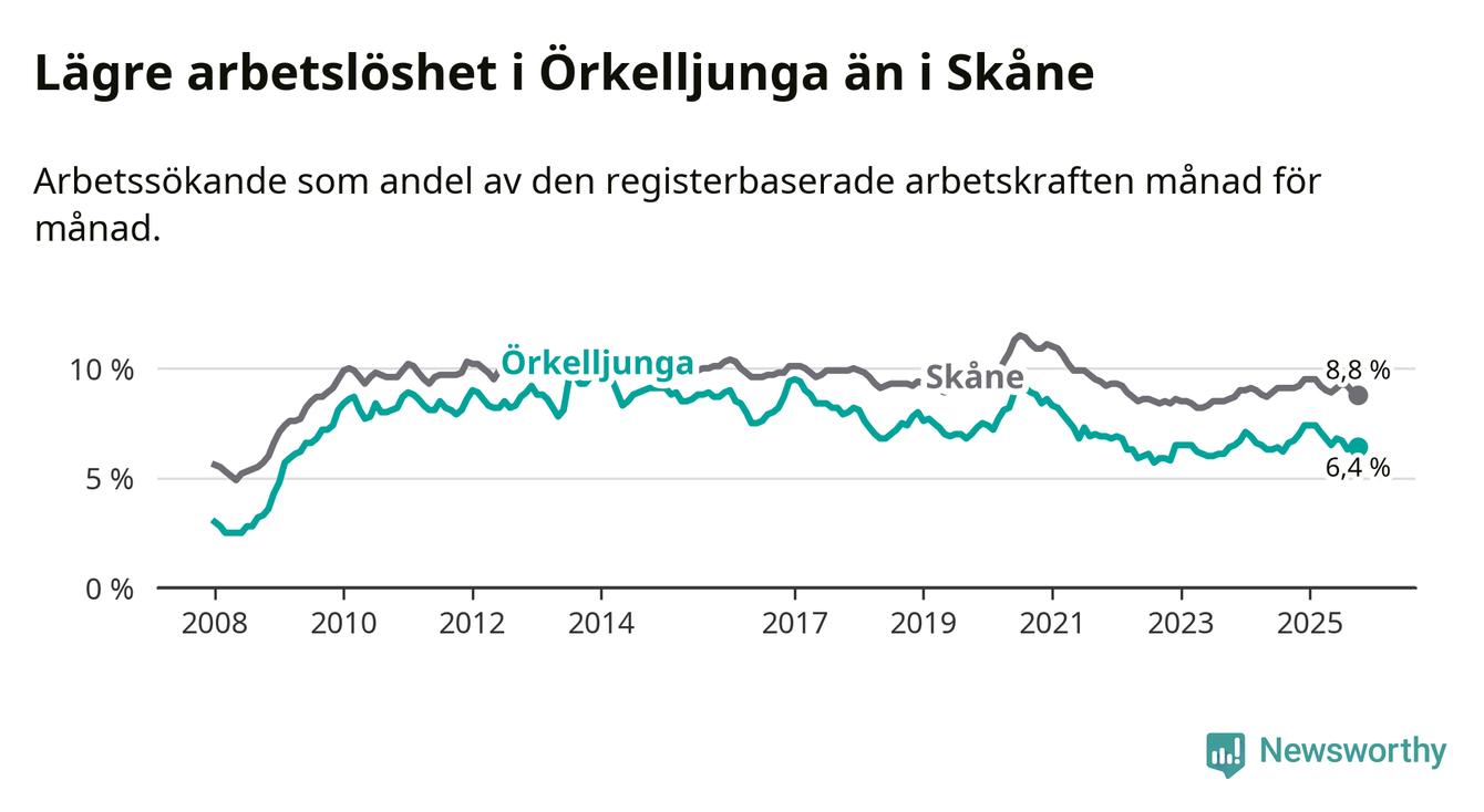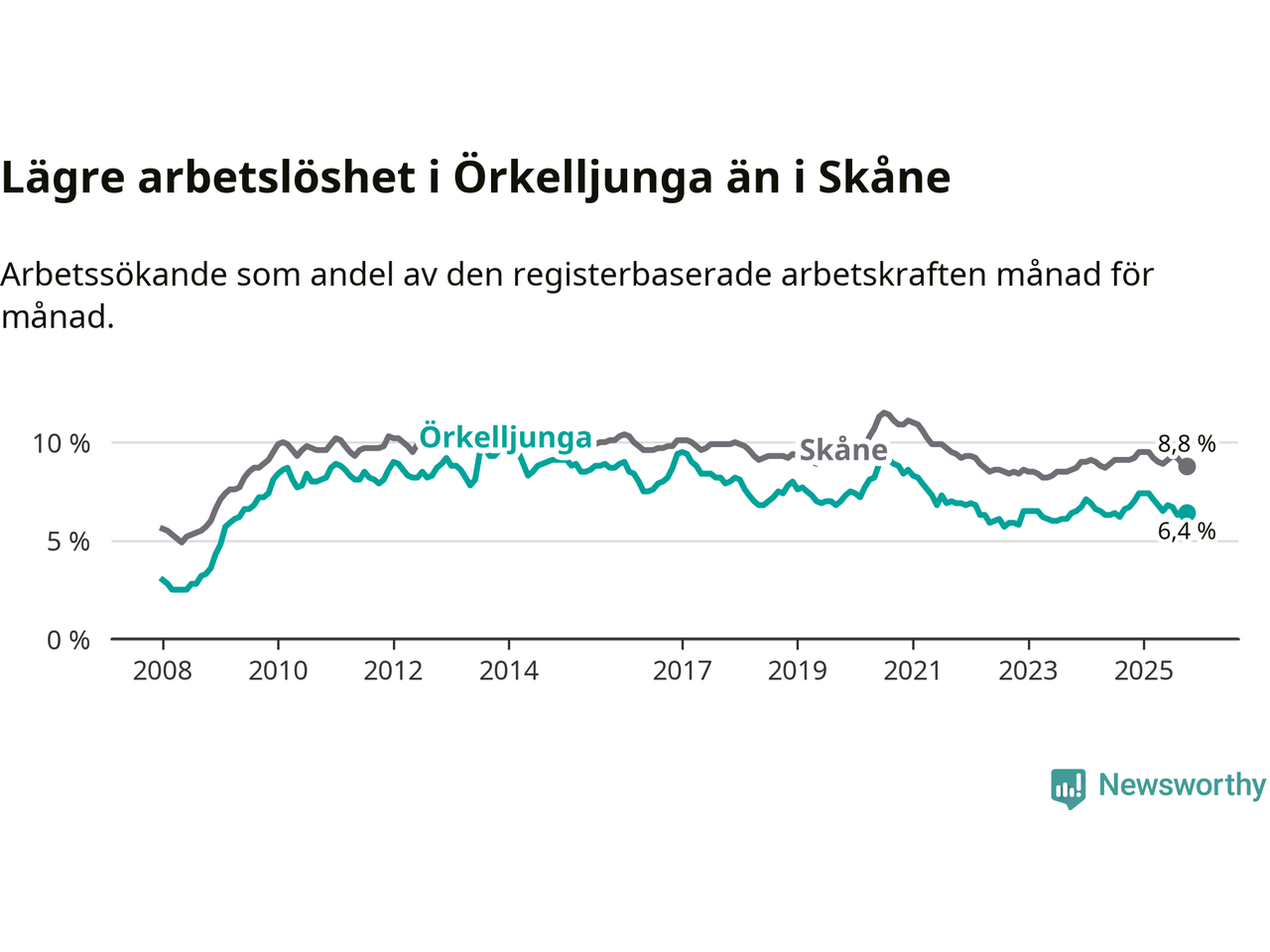 Under oktober månad rapporterade Örkelljunga kommun en total arbetslöshet på 6,4 procent. Det är en minskning jämfört med samma tidpunkt i fjol (−0,3 procentenheter). Även i Skåne län sjunker arbetslösheten .