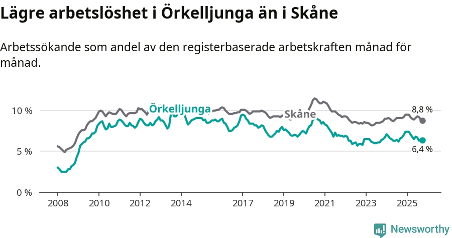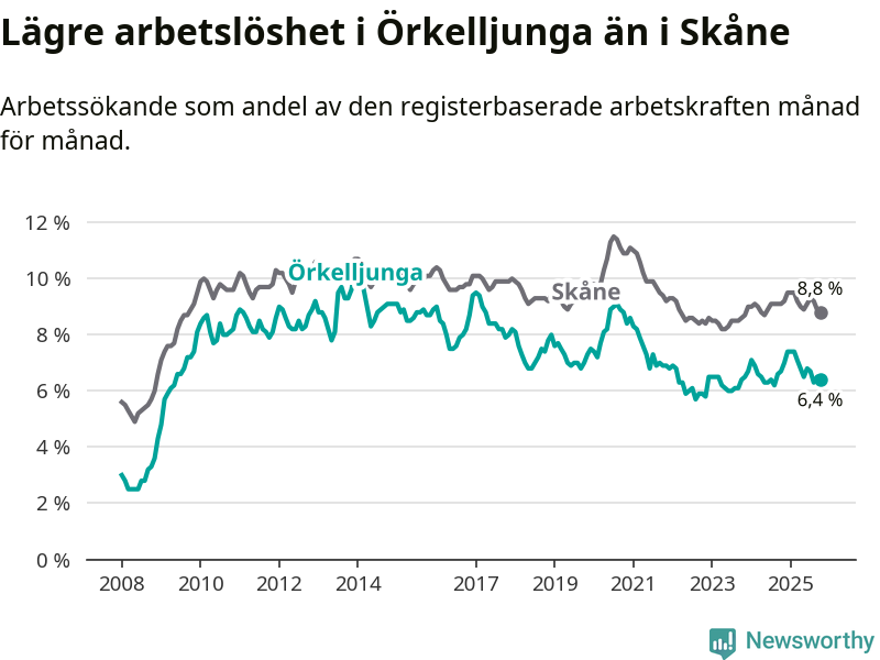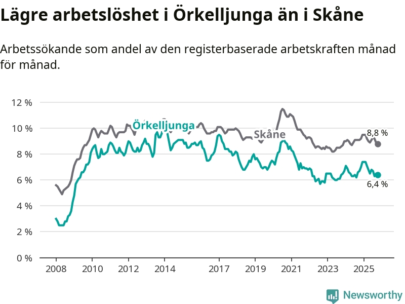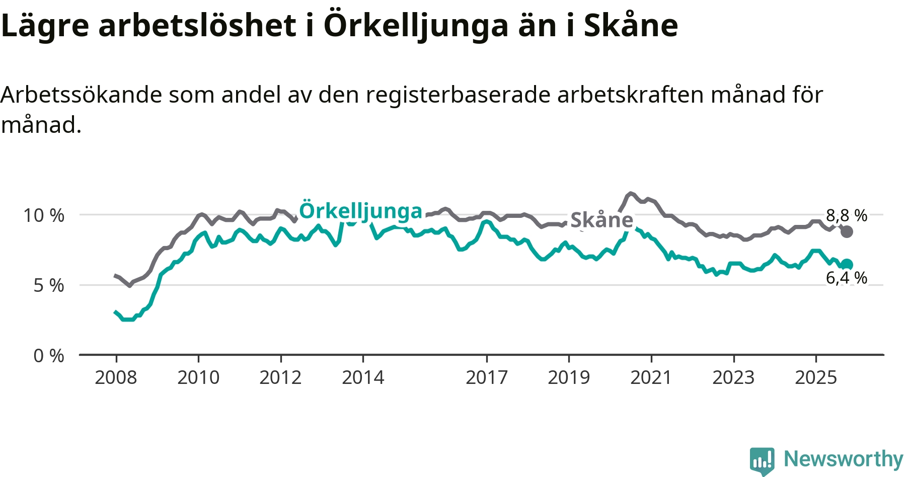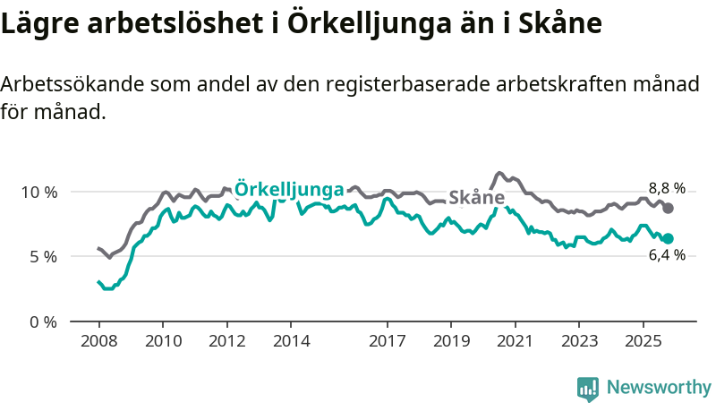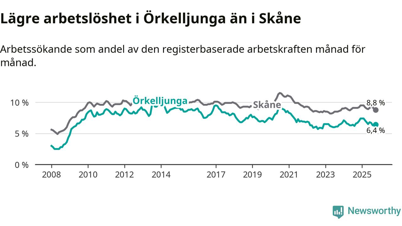 Under oktober månad rapporterade Örkelljunga kommun en total arbetslöshet på 6,4 procent. Det är en minskning jämfört med samma tidpunkt i fjol (−0,3 procentenheter). Även i Skåne län sjunker arbetslösheten .