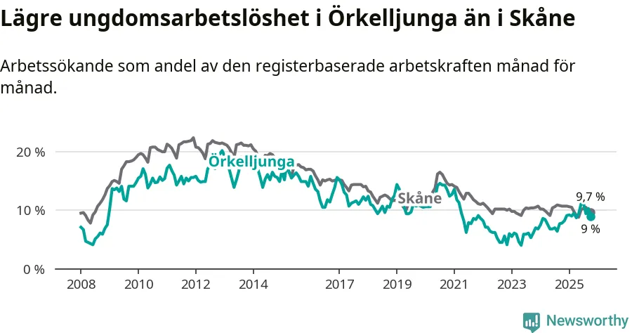 Precis som den totala arbetslösheten ligger ungdomsarbetslösheten i Örkelljunga lägre än i Skåne som helhet. Skillnaden mellan kommunen och länet är 0,7 procentenheter.