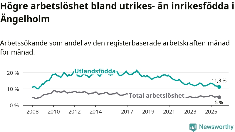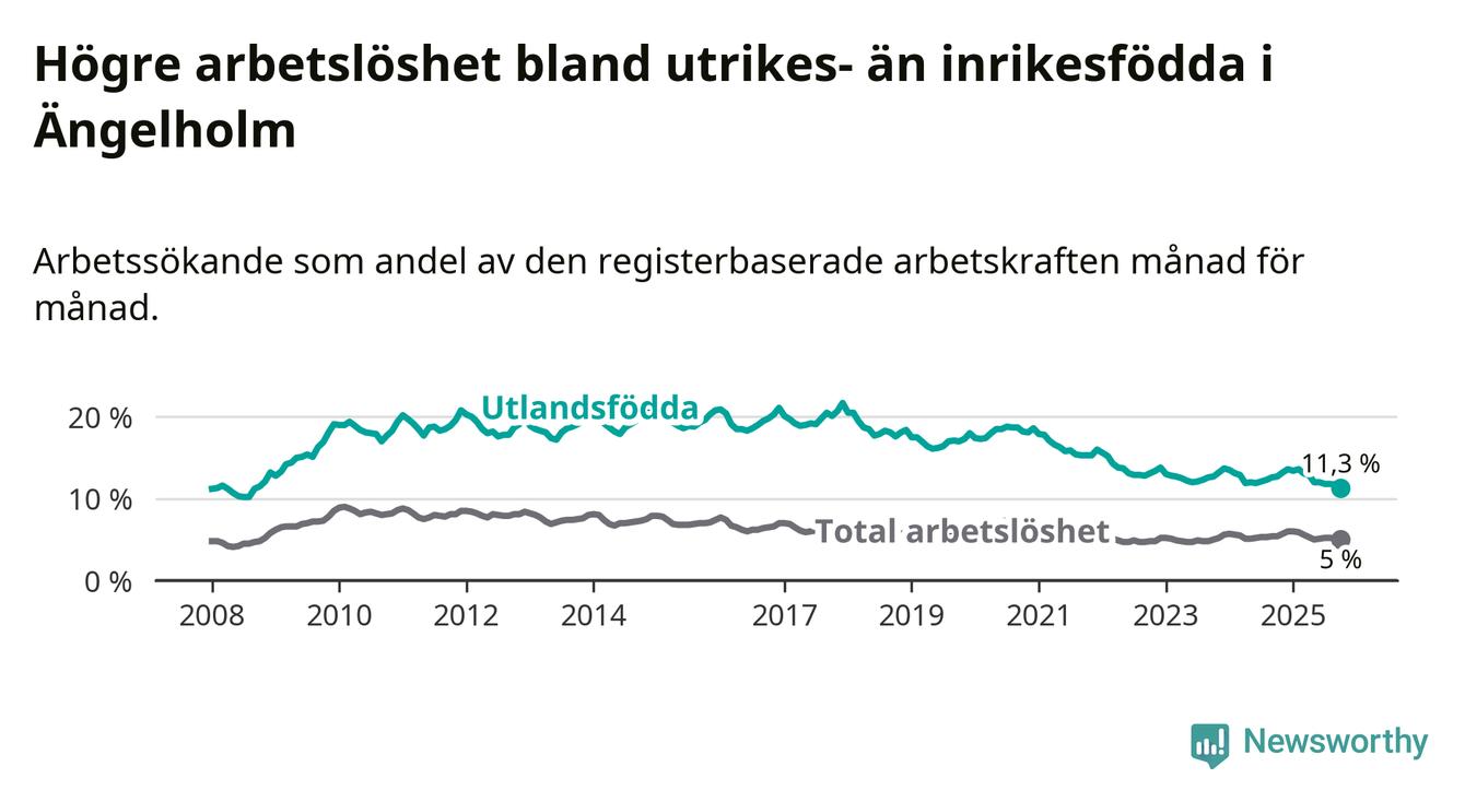 Arbetslösheten bland utlandsfödda var 11,3 procent i Ängelholm under oktober månad, motsvarande 415 av 3 673 personer. Det är 1,4 procentenheter färre än vid samma tidpunkt i fjol (−35 om man räknar personer). Den nuvarande arbetslöshetsnivån är den lägsta sedan september 2008.