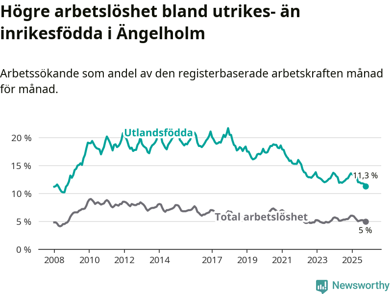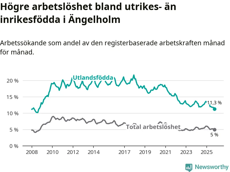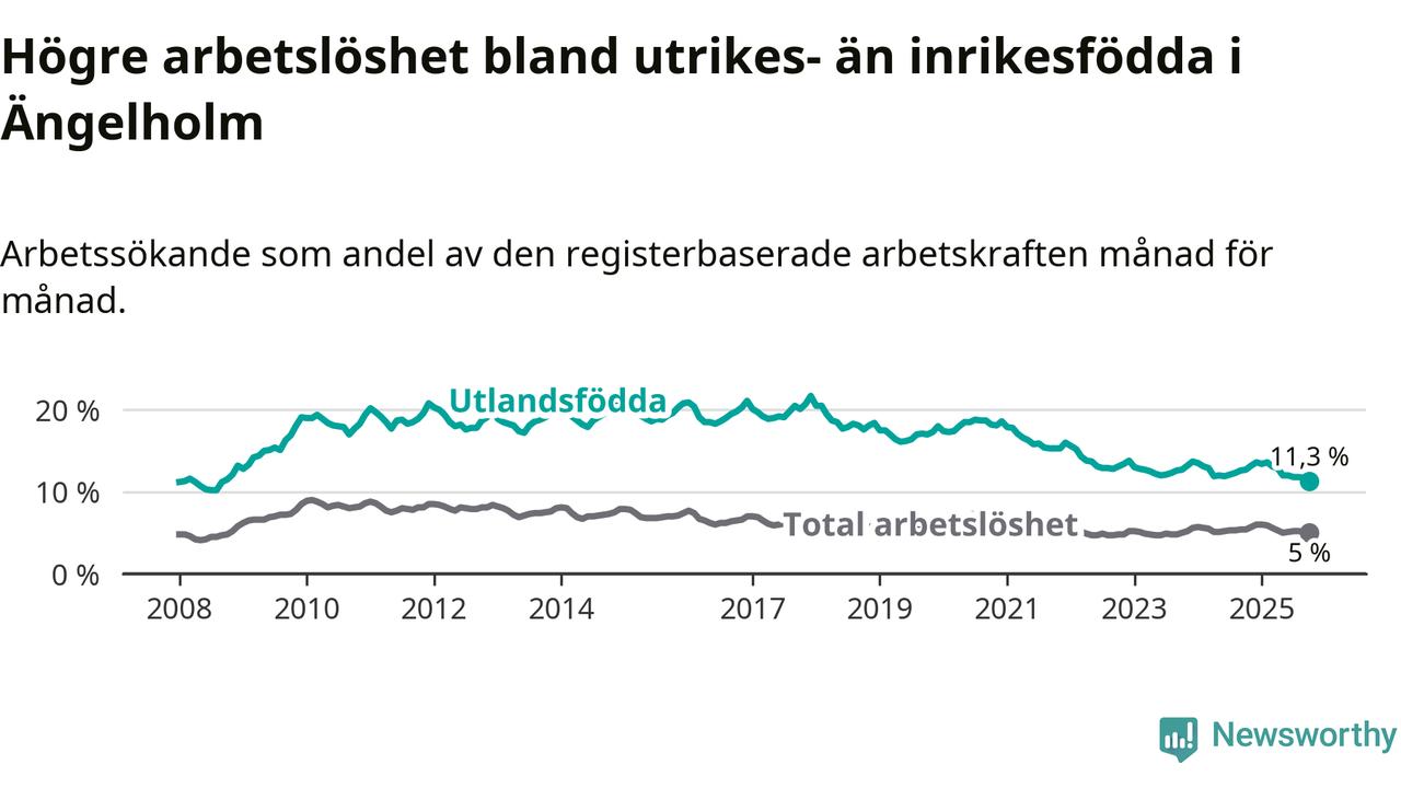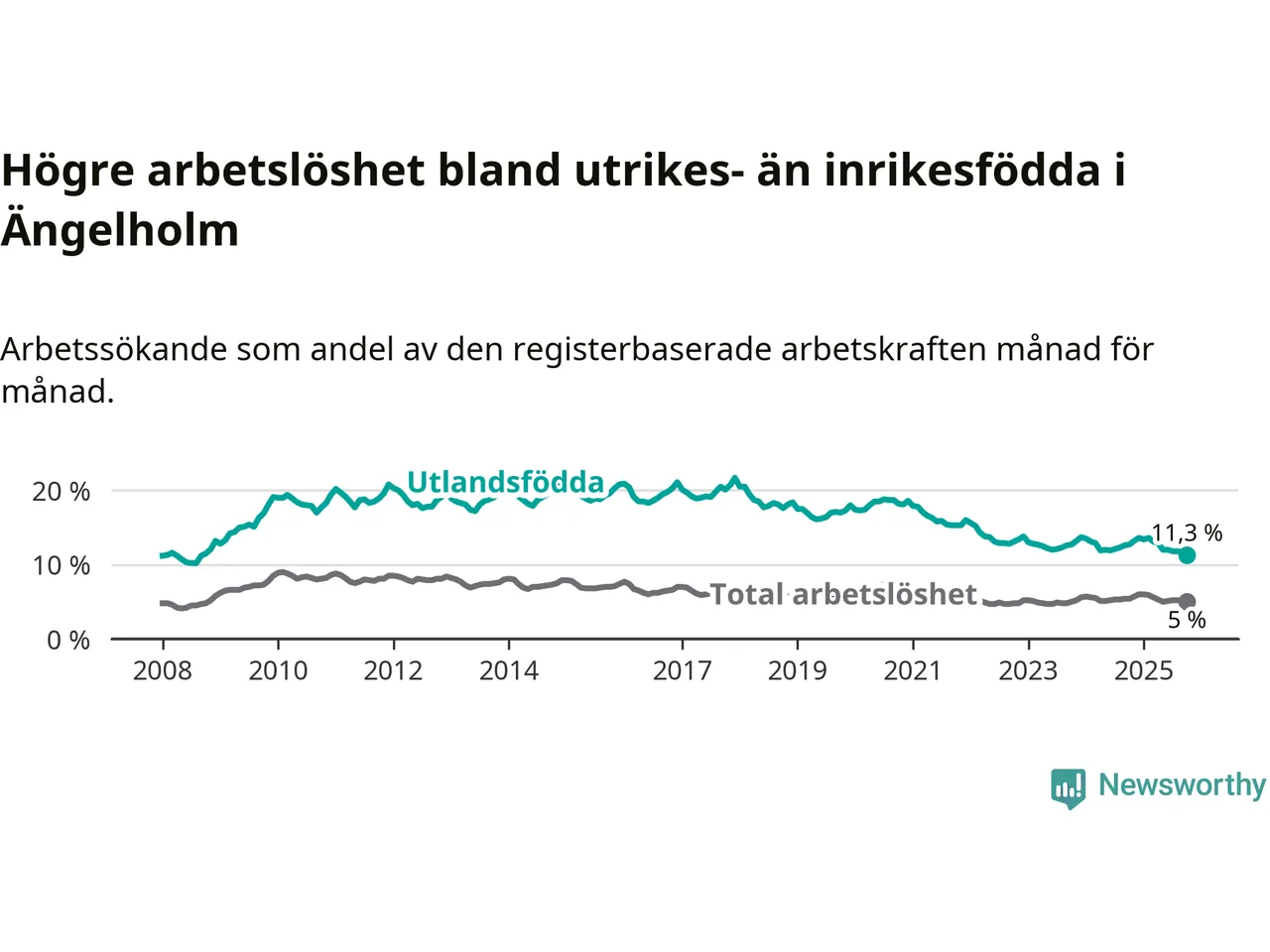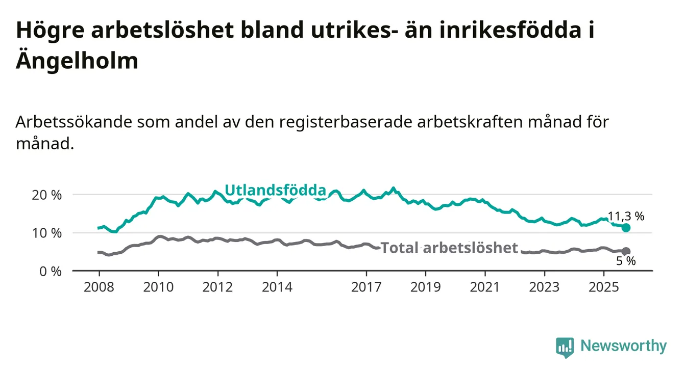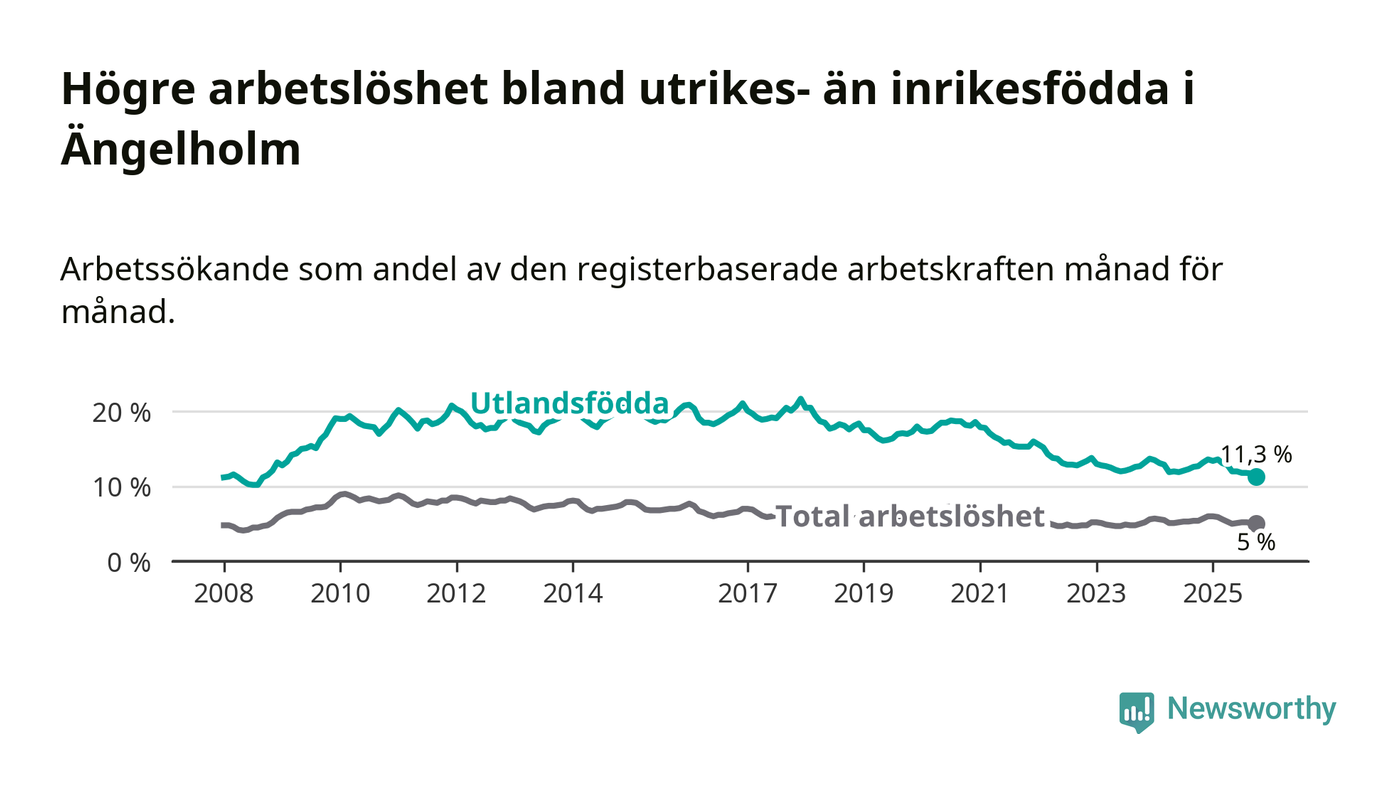 Skillnaden i arbetslöshet mellan utrikesfödda och hela befolkningen är 6,3 procentenheter i Ängelholm. Det är en mindre skillnad än för ett år sedan (−1,0 procentenheter).