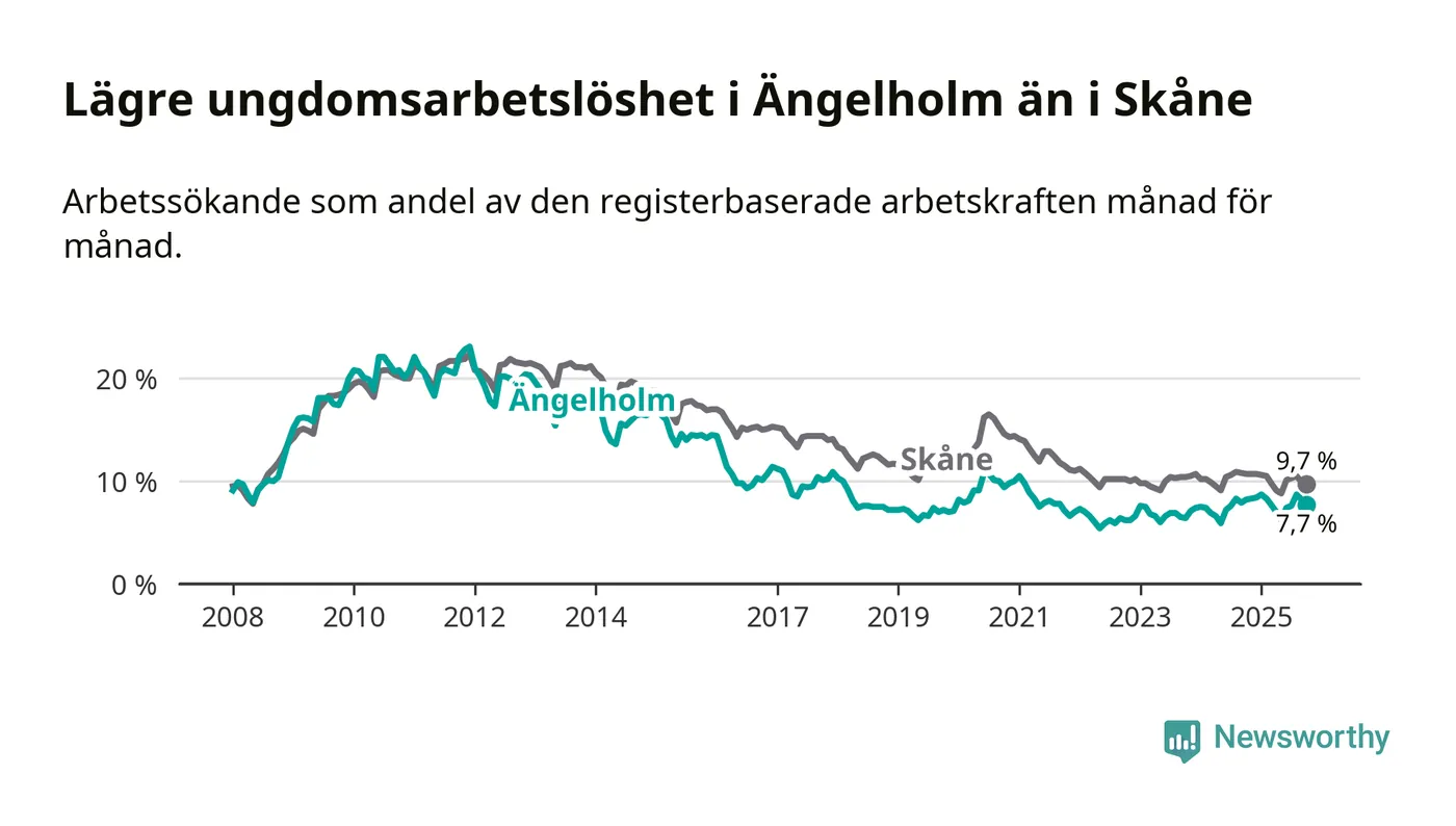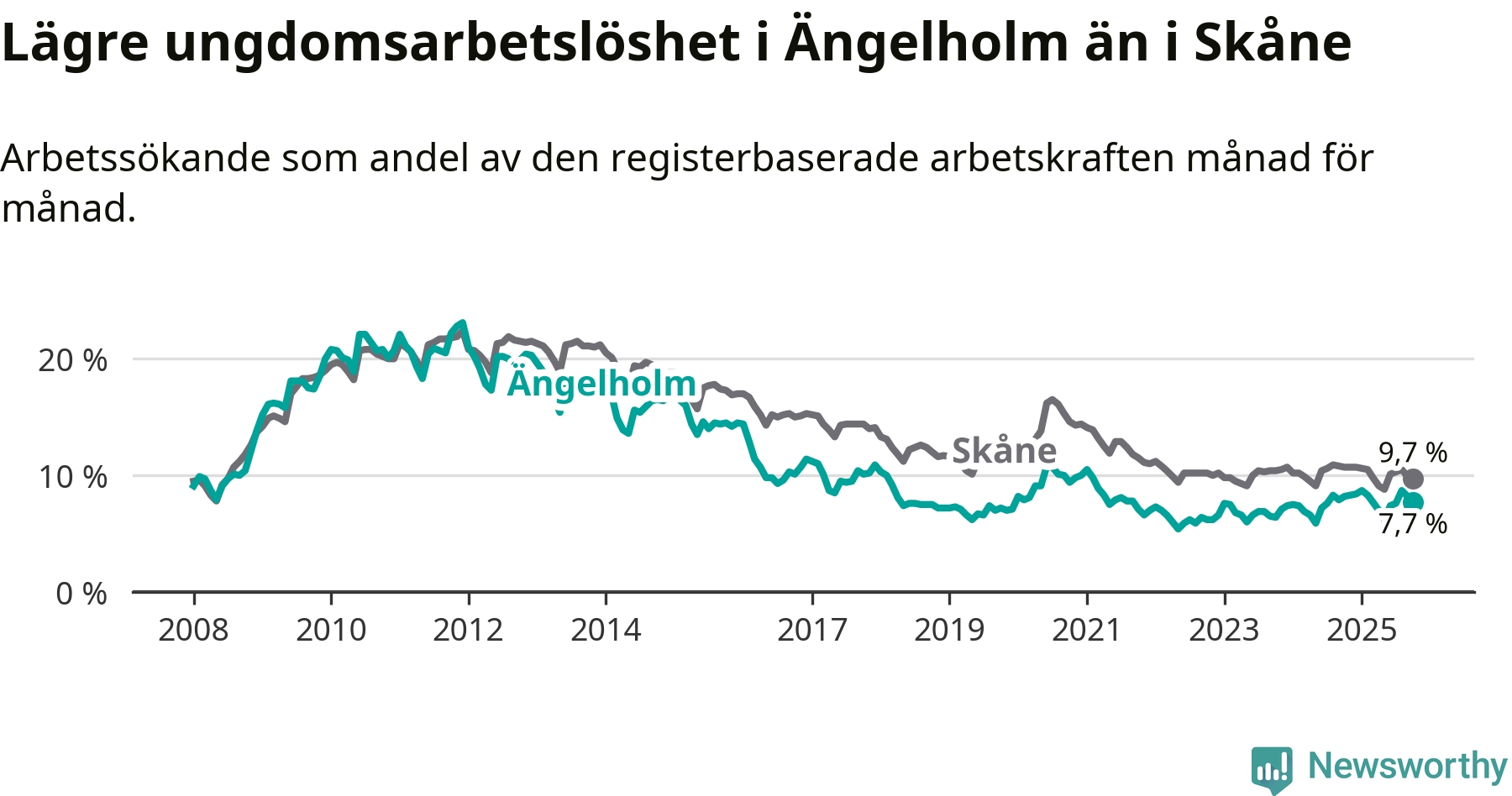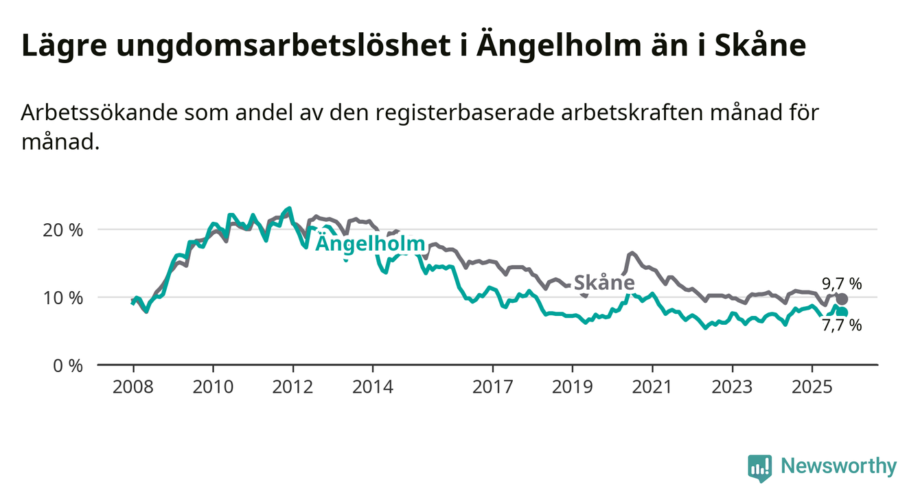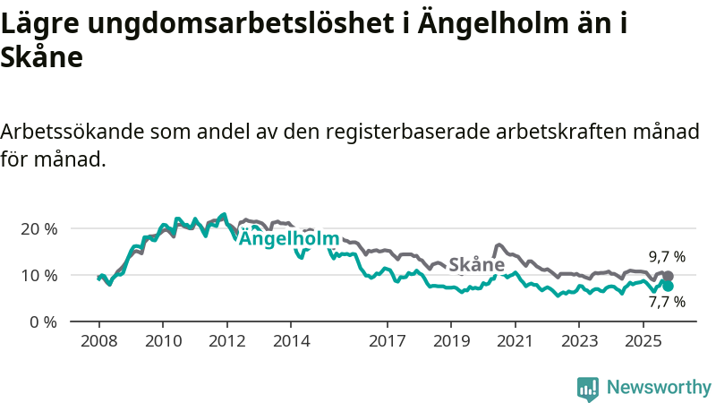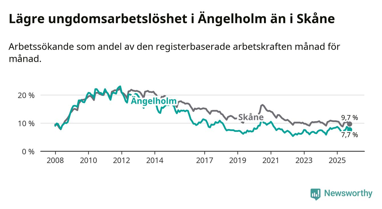 Precis som den totala arbetslösheten ligger ungdomsarbetslösheten i Ängelholm lägre än i Skåne som helhet. Skillnaden mellan kommunen och länet är 2,0 procentenheter.