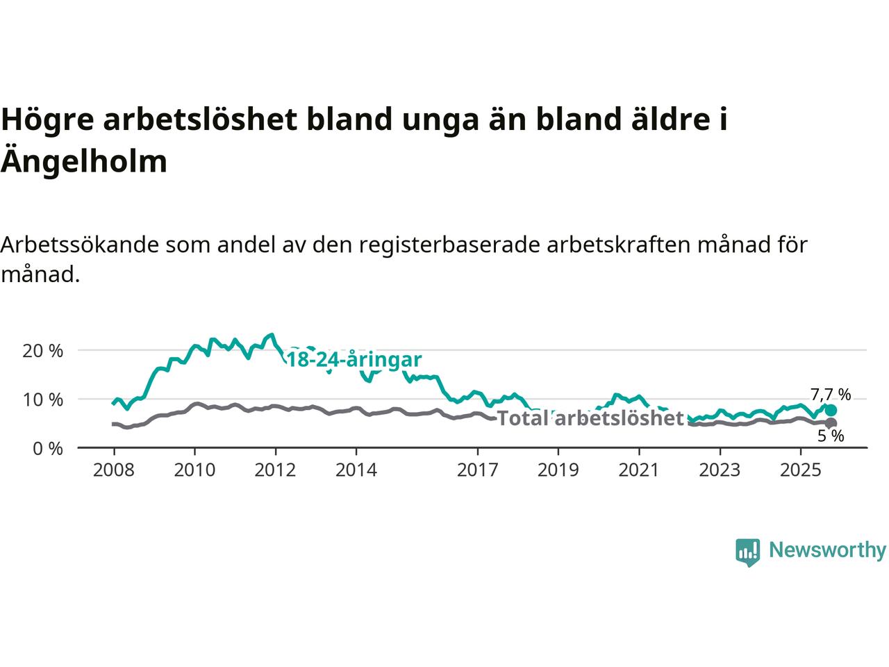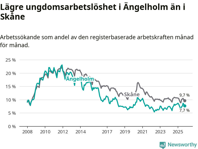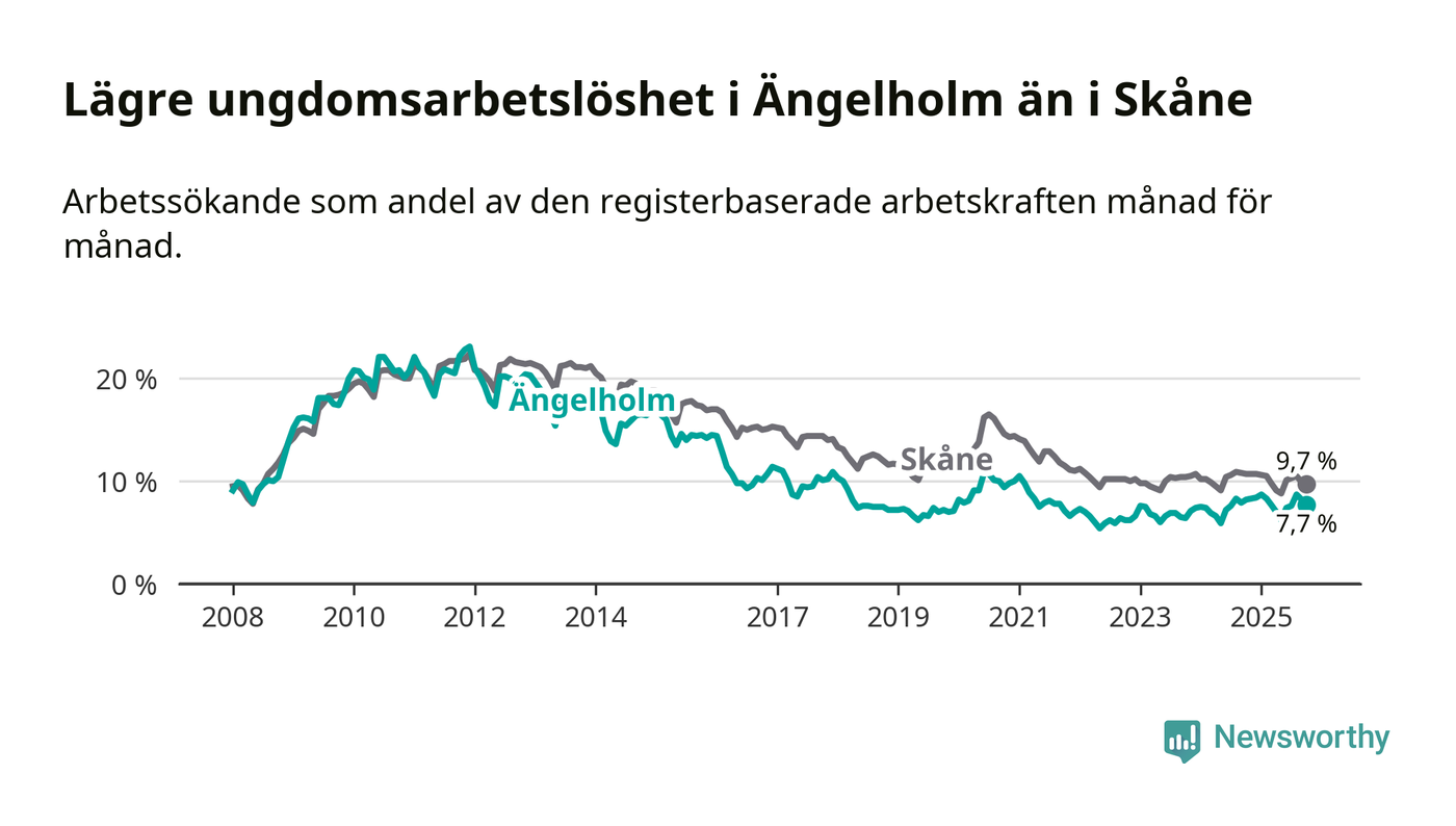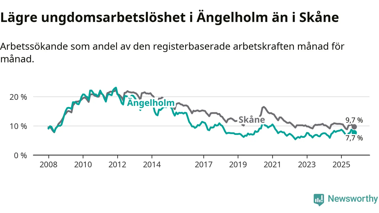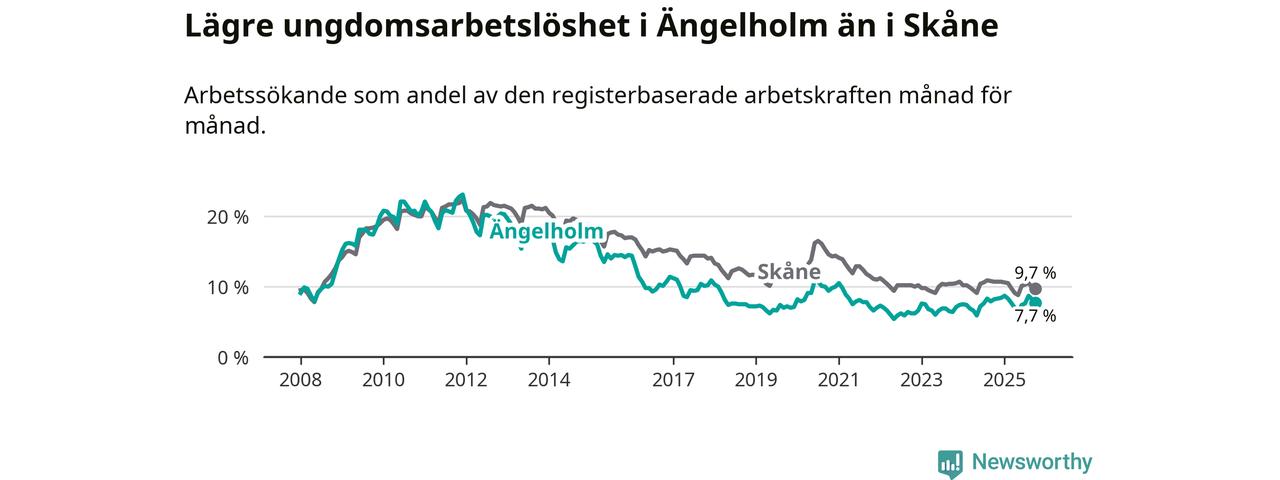 Precis som den totala arbetslösheten ligger ungdomsarbetslösheten i Ängelholm lägre än i Skåne som helhet. Skillnaden mellan kommunen och länet är 2,0 procentenheter.