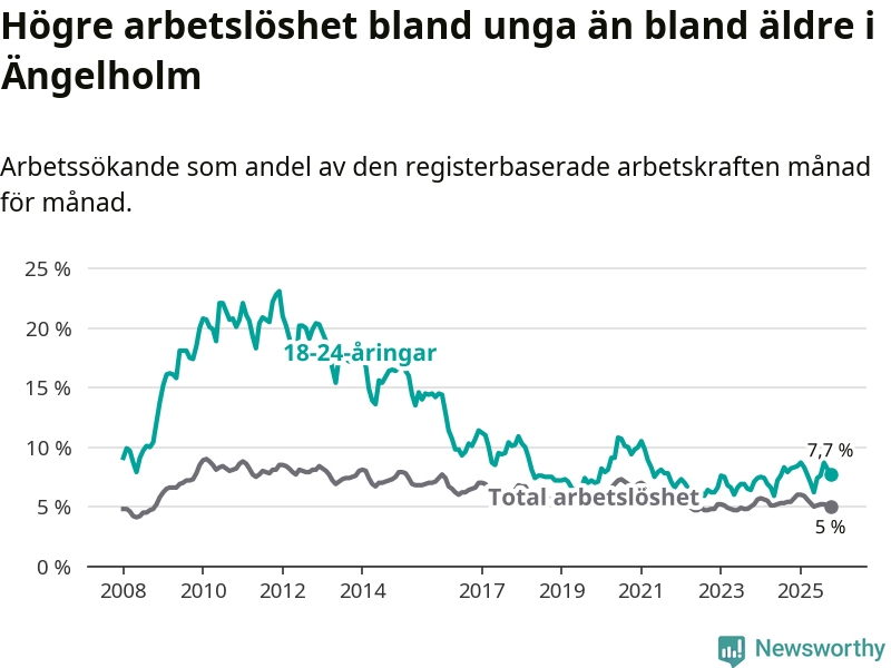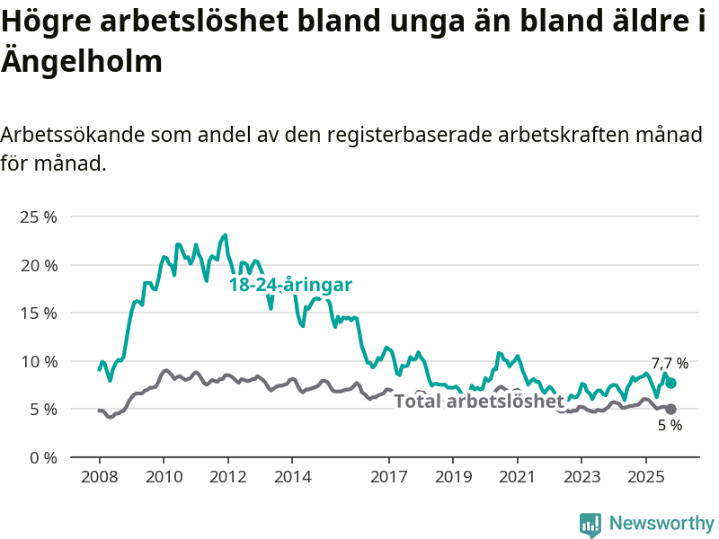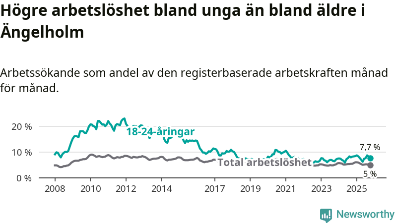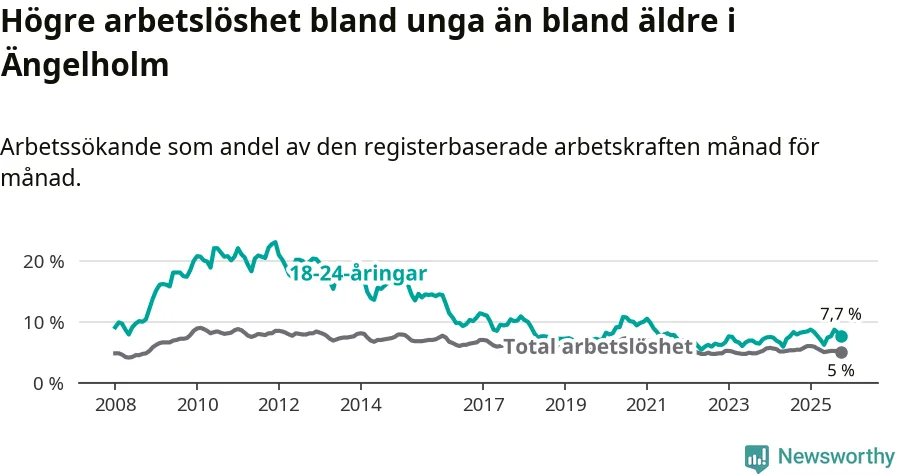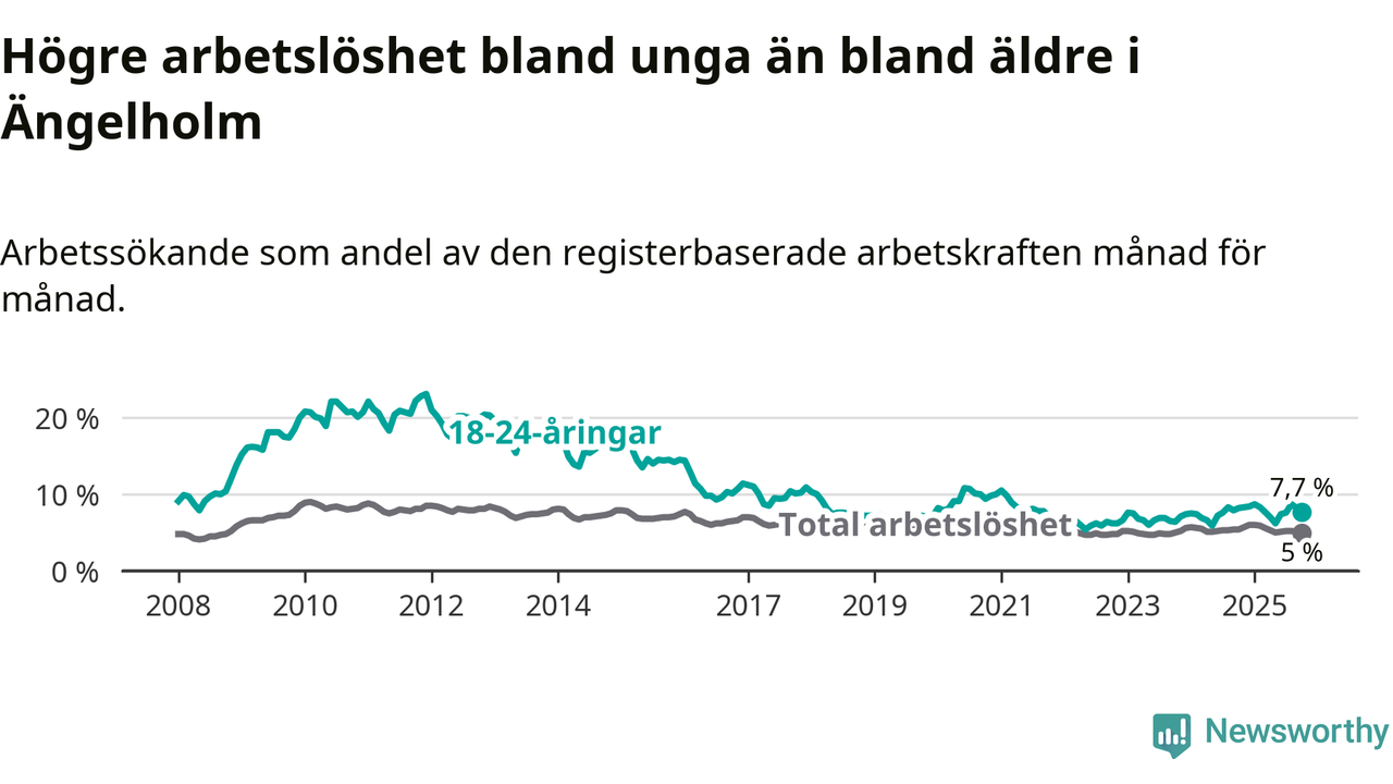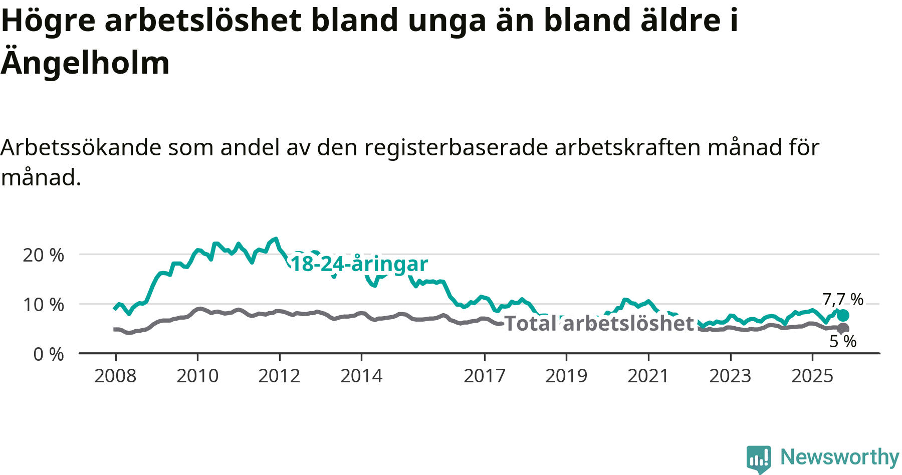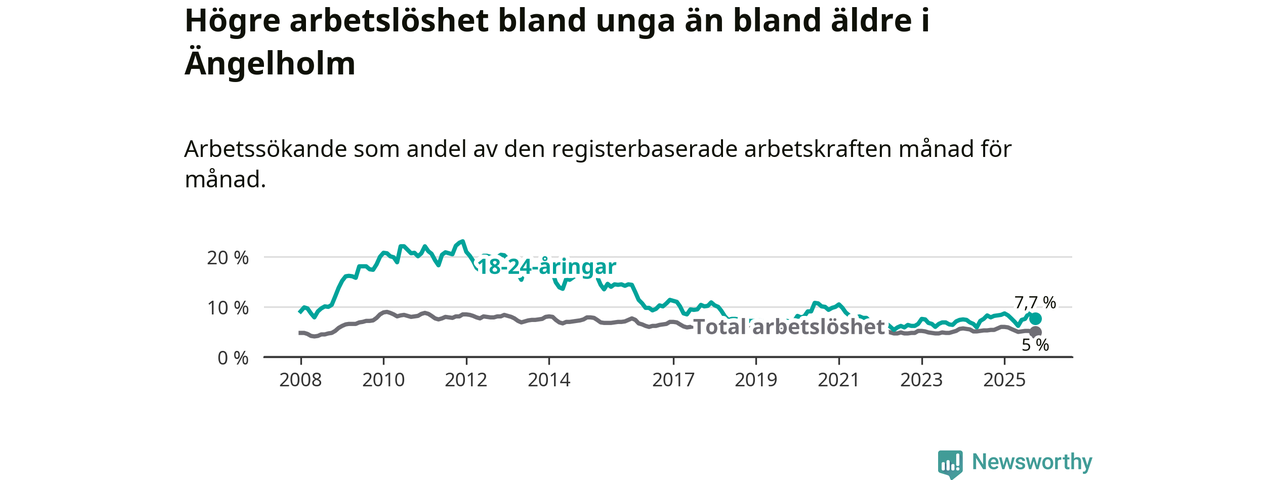 Precis som den totala arbetslösheten ligger ungdomsarbetslösheten i Ängelholm lägre än i Skåne som helhet. Skillnaden mellan kommunen och länet är 2,0 procentenheter.