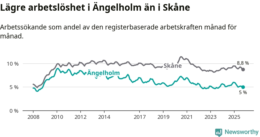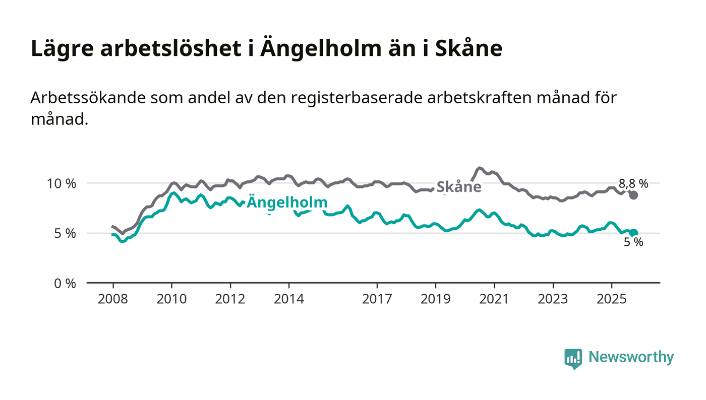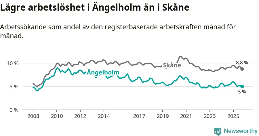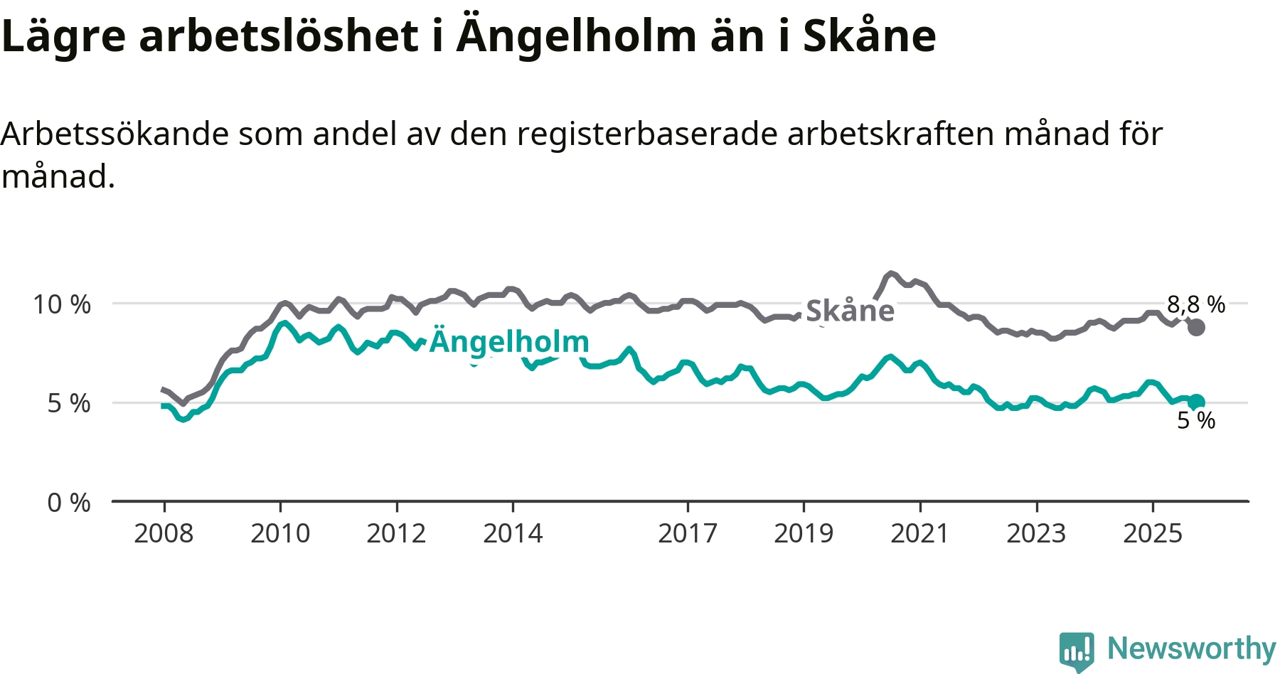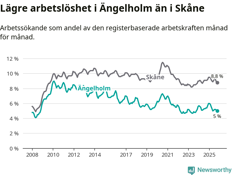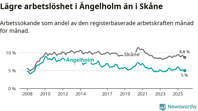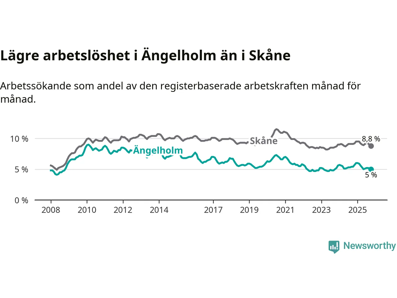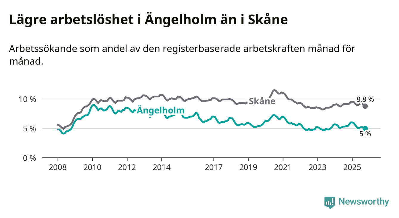Under oktober månad rapporterade Ängelholms kommun en total arbetslöshet på 5,0 procent. Det är en minskning jämfört med samma tidpunkt i fjol (−0,4 procentenheter). Även i Skåne län sjunker arbetslösheten .
