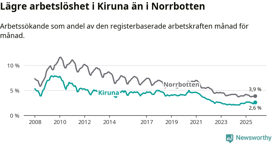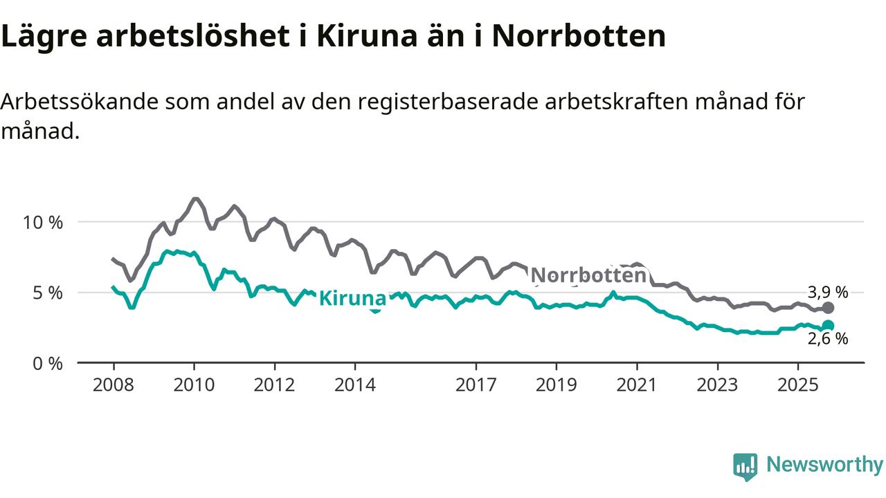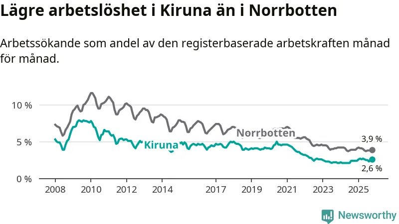 Kiruna kommuns arbetslöshet är nu den lägsta i hela Norrbottens län. Det första gången sedan september 2024 som detta inträffar.