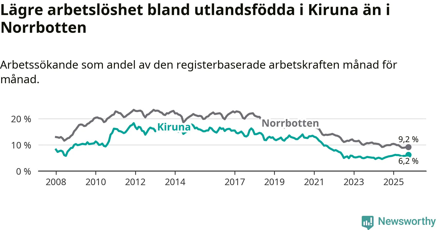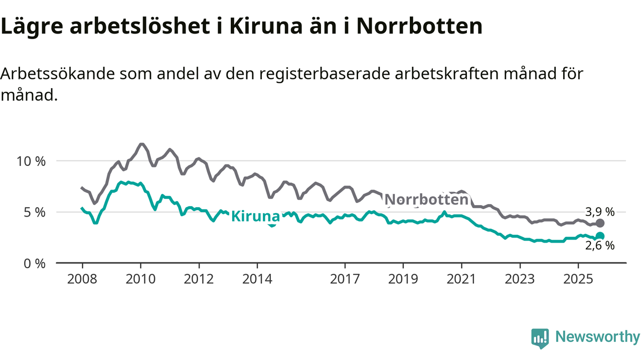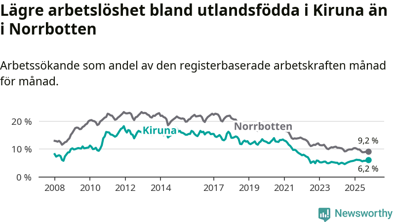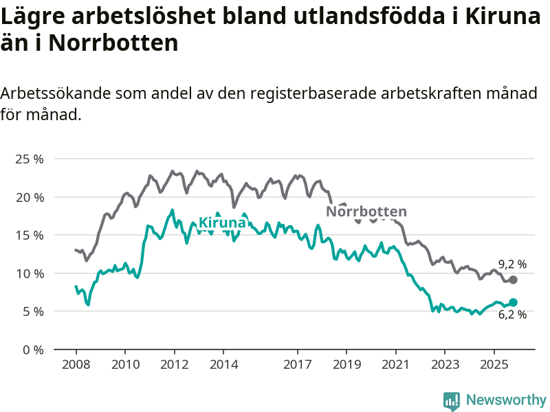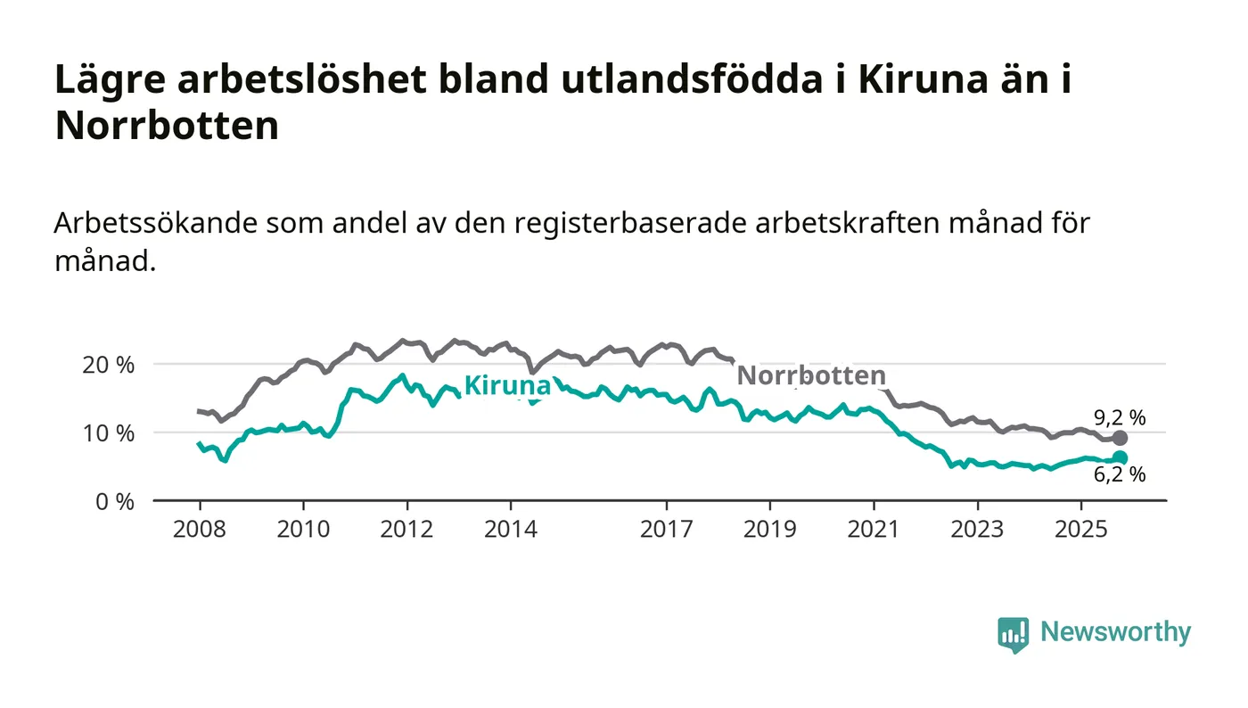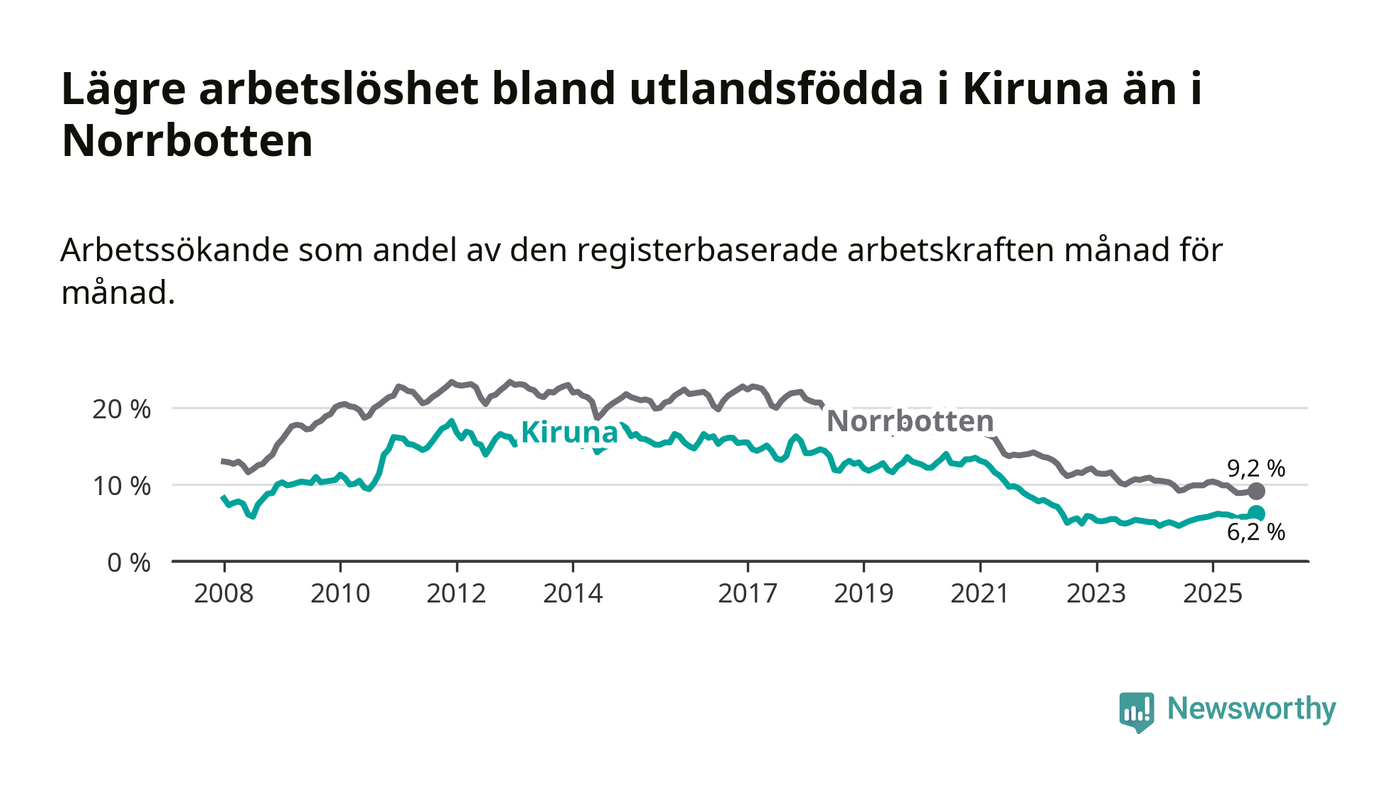 Medan arbetslösheten bland utlandsfödda alltså ökar i Kiruna så minskar den i Norrbotten. Jämfört med oktober förra året har andelen arbetslösa utlandsfödda i länet minskat med 0,7 procentenheter (till 9,2 procent). Trots den senaste uppgången har Kiruna med andra ord fortfarande lägre arbetslöshet bland utlandsfödda än Norrbotten.