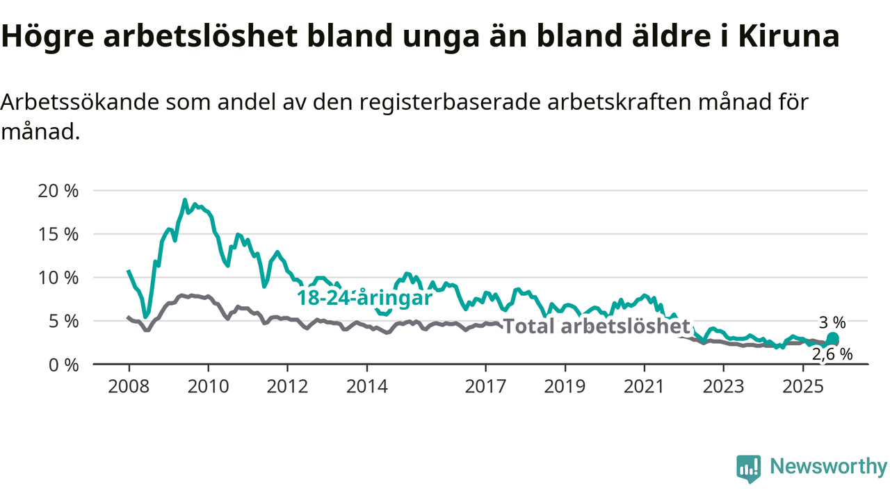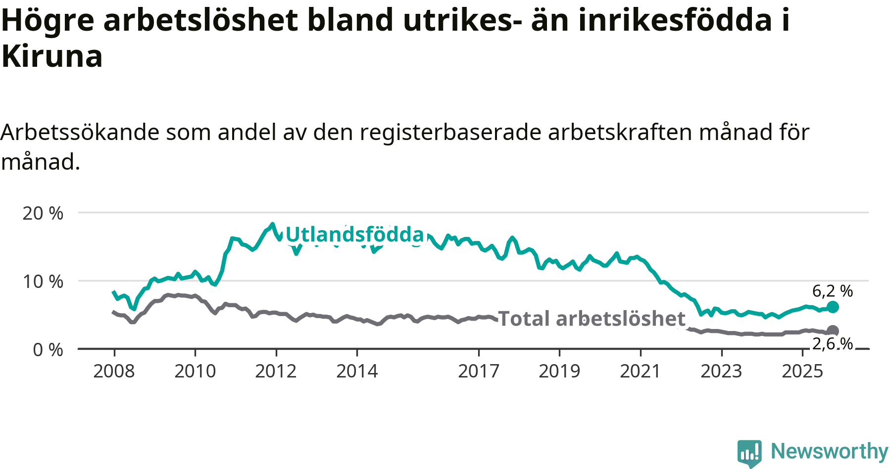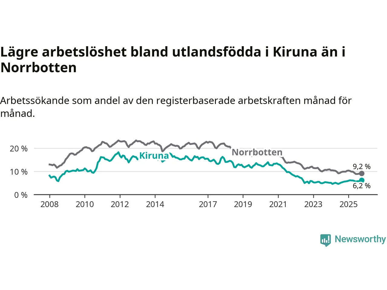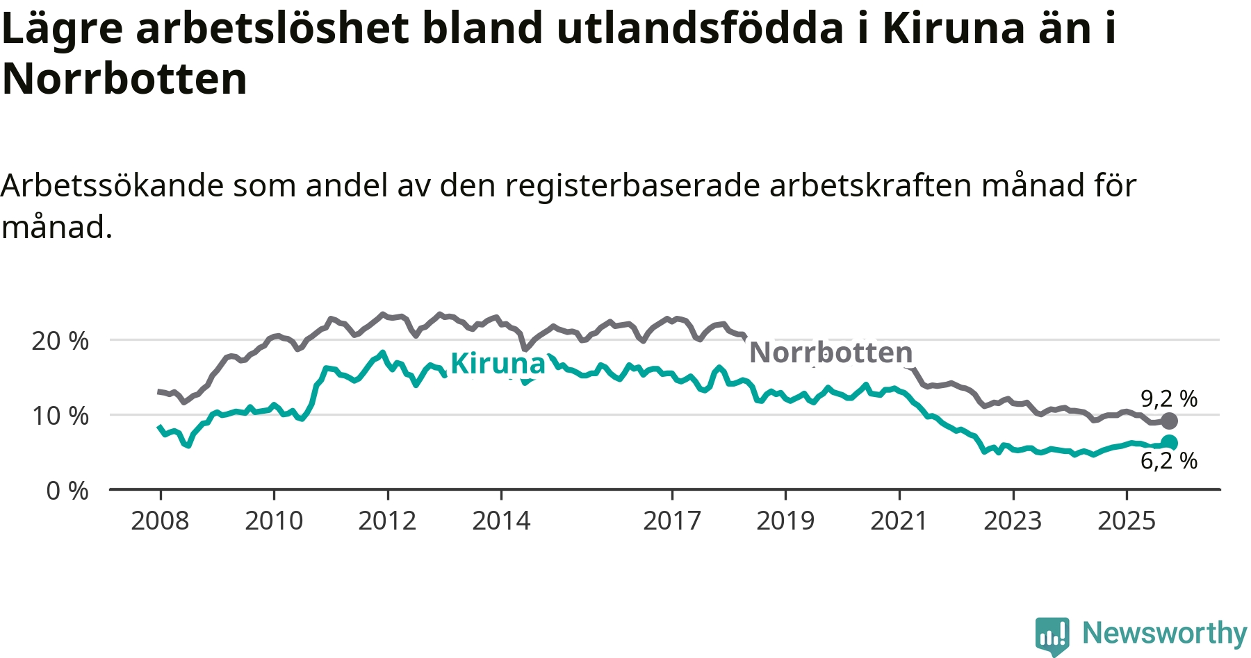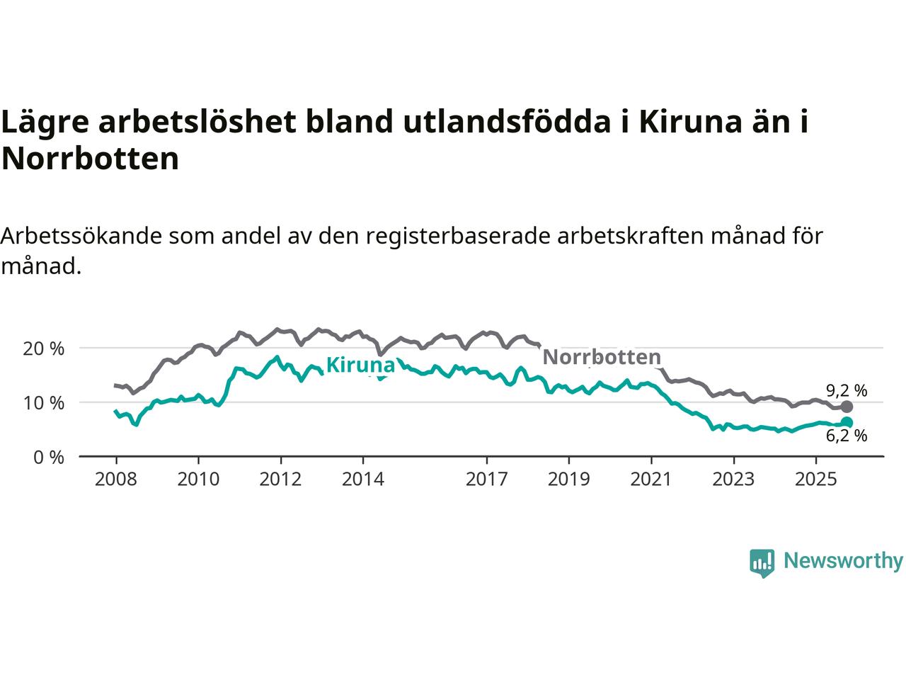 Medan arbetslösheten bland utlandsfödda alltså ökar i Kiruna så minskar den i Norrbotten. Jämfört med oktober förra året har andelen arbetslösa utlandsfödda i länet minskat med 0,7 procentenheter (till 9,2 procent). Trots den senaste uppgången har Kiruna med andra ord fortfarande lägre arbetslöshet bland utlandsfödda än Norrbotten.