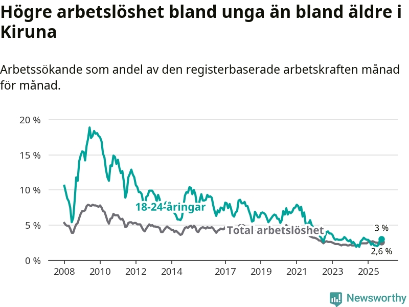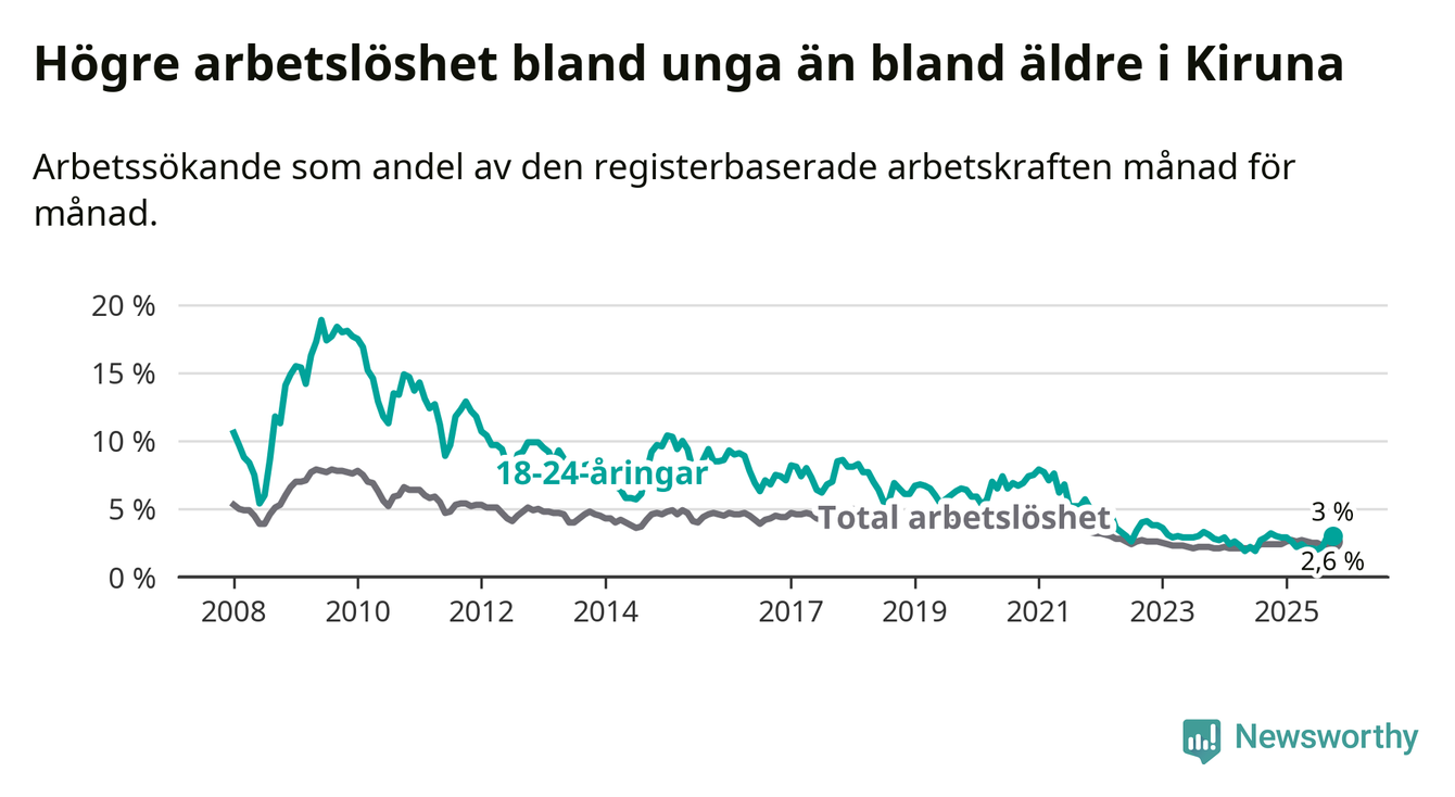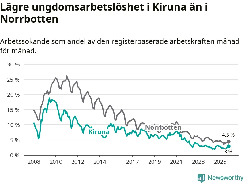 Precis som den totala arbetslösheten ligger ungdomsarbetslösheten i Kiruna lägre än i Norrbotten som helhet. Skillnaden mellan kommunen och länet är 1,5 procentenheter.