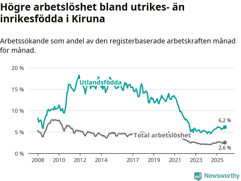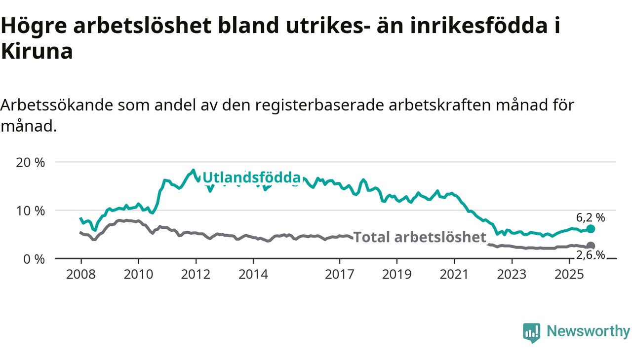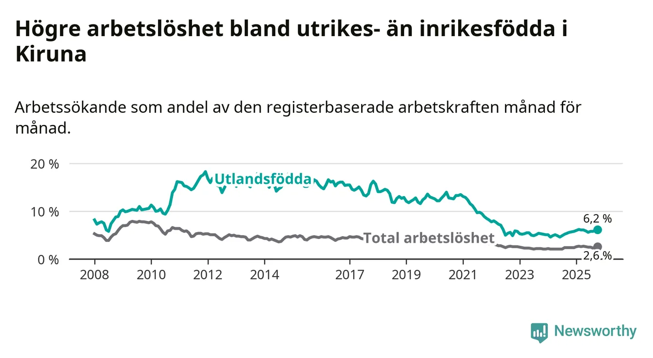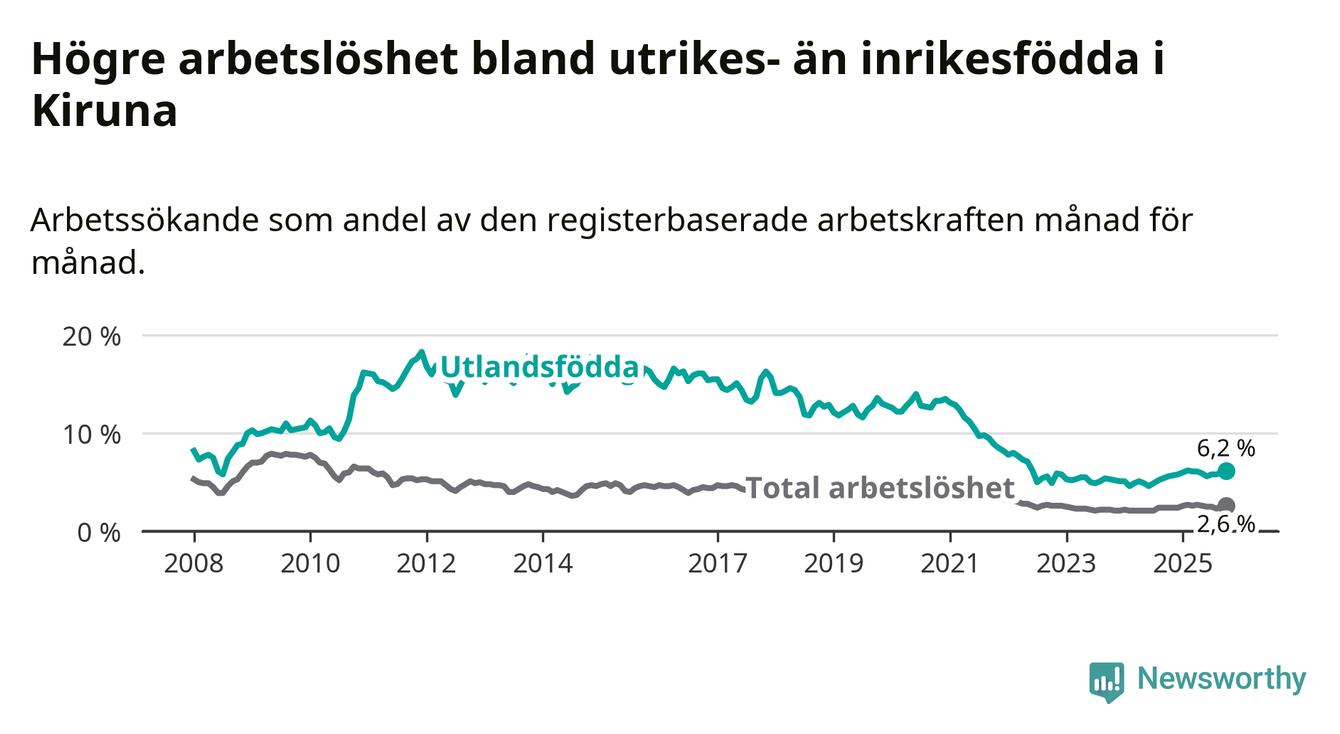 Arbetslösheten bland utlandsfödda var 6,2 procent i Kiruna under oktober månad, motsvarande 124 av 2 000 personer. Det är 0,6 procentenheter fler än vid samma tidpunkt i fjol (+18 om man räknar personer). Därmed är de utlandsföddas arbetslöshet högre än vid samma tidpunkt i fjol för 13:e månaden i följd.