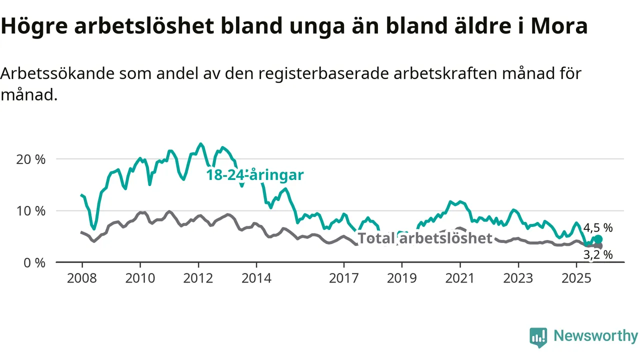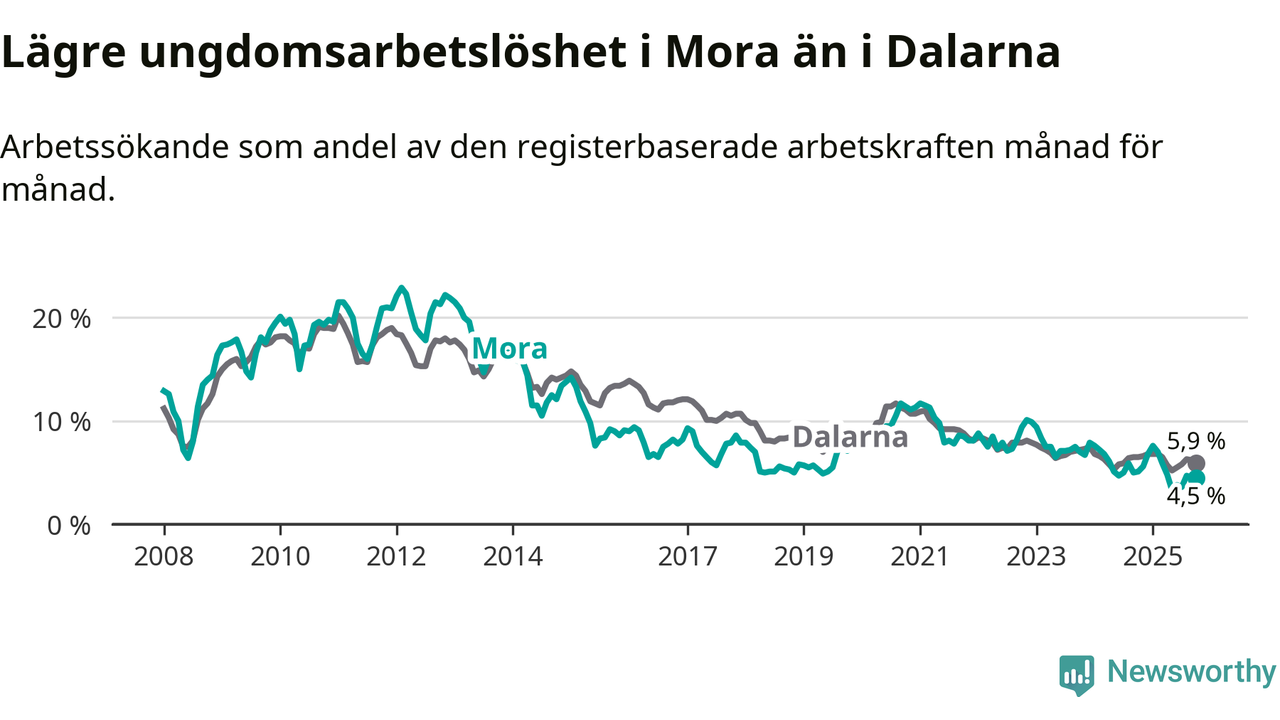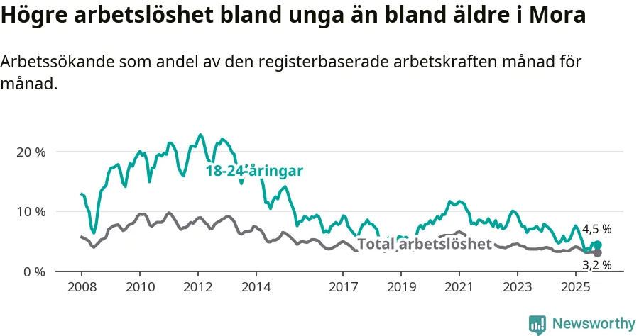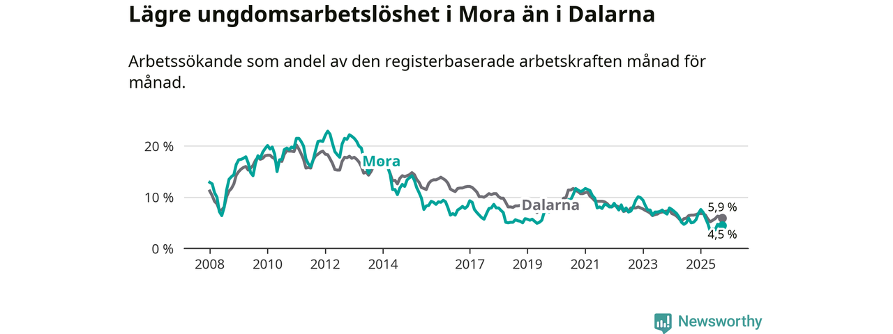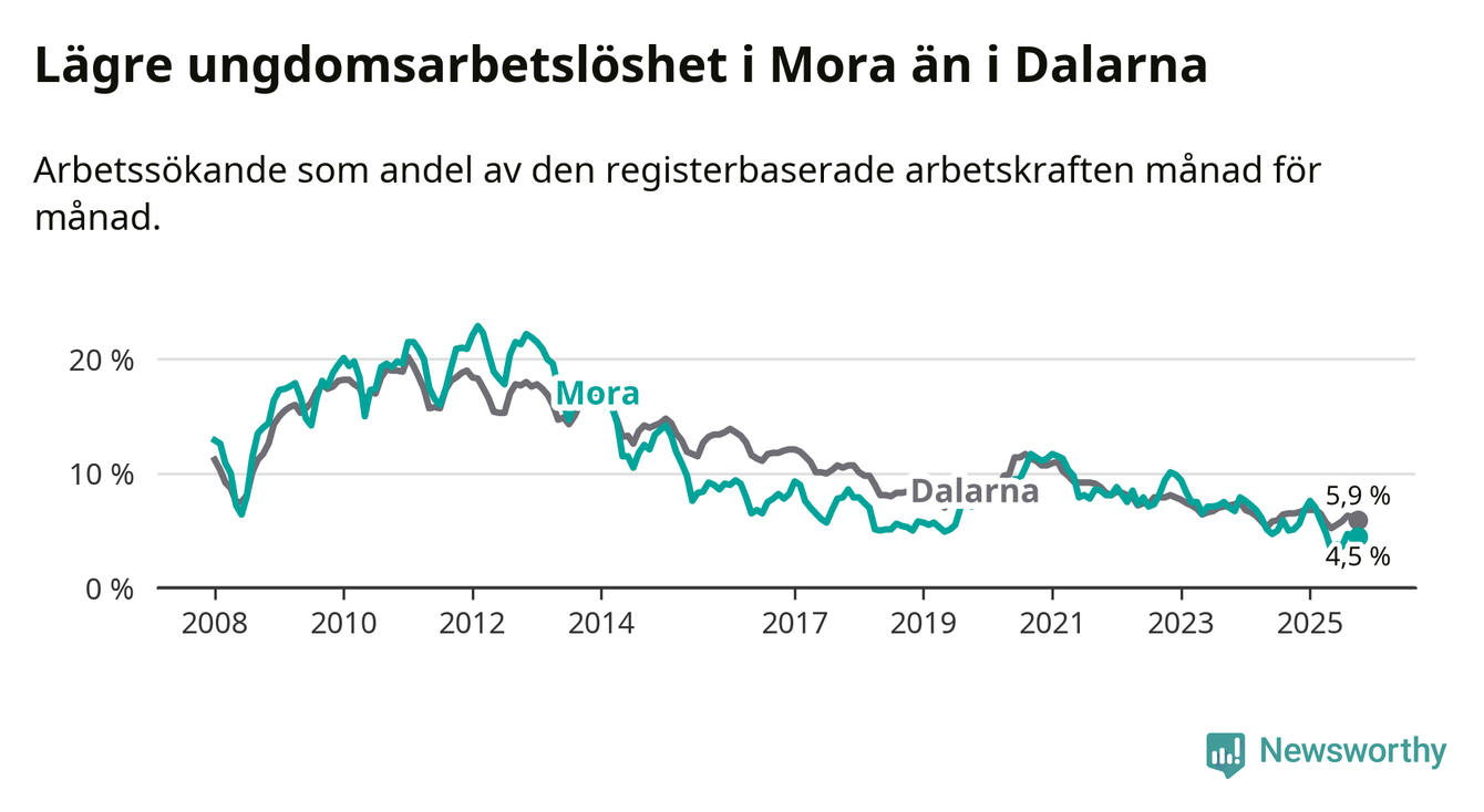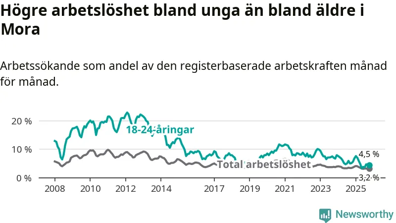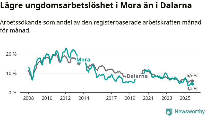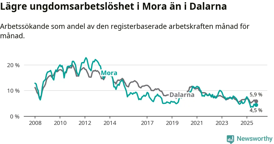 I och med den senaste månadens nedgång har de ungas arbetslöshet i Mora sjunkit nio månader i följd (ner från 7,6 procent i januari till 4,5 procent nu).