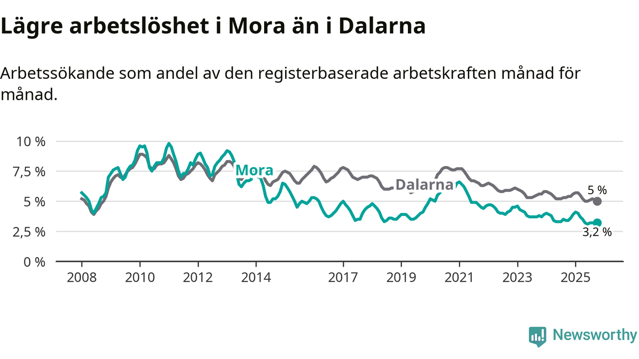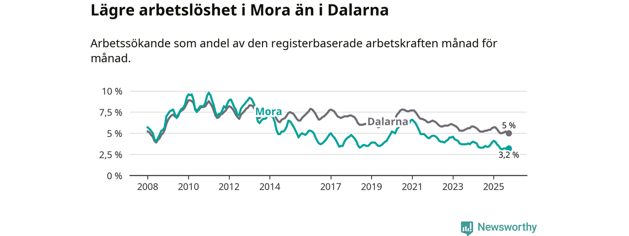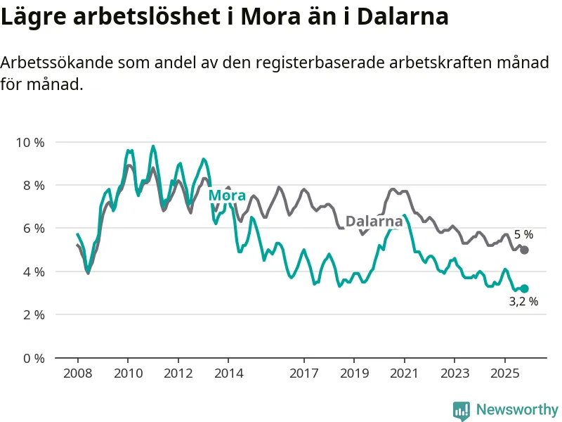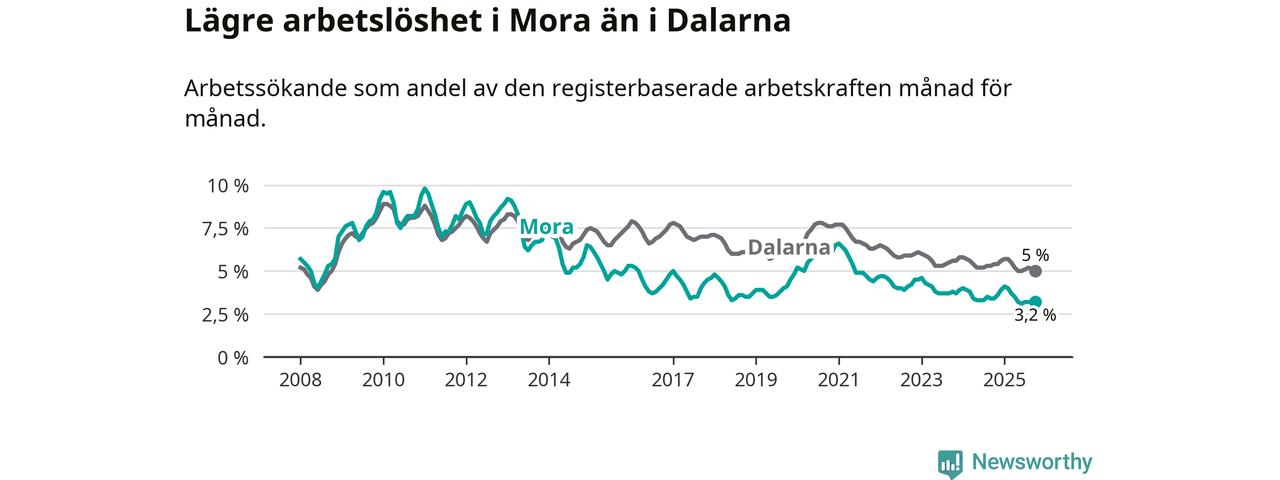 Under oktober månad rapporterade Mora kommun en total arbetslöshet på 3,2 procent. Det är en minskning jämfört med samma tidpunkt i fjol (−0,2 procentenheter). Även i Dalarnas län sjunker arbetslösheten .