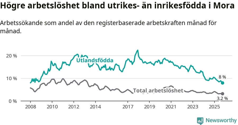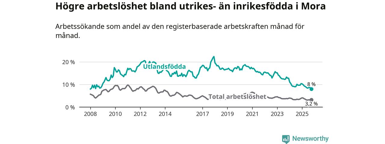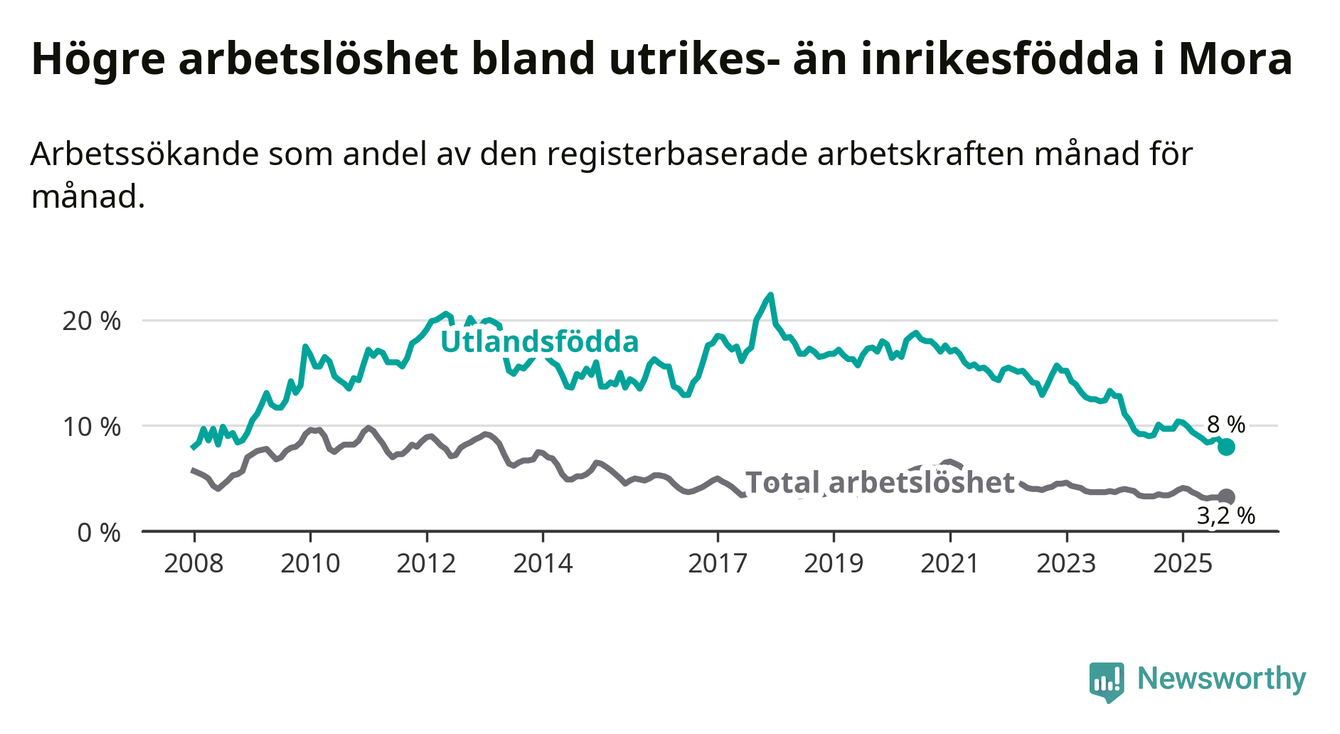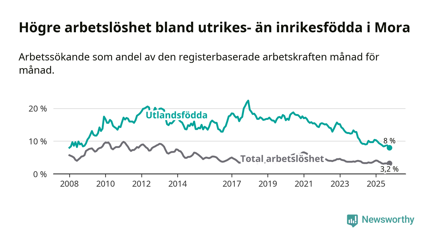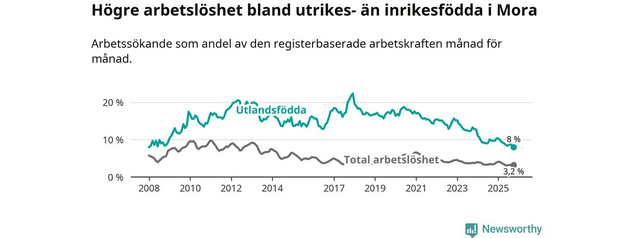 Arbetslösheten bland utlandsfödda var 8,0 procent i Mora under oktober månad, motsvarande 91 av 1 138 personer. Det är 1,7 procentenheter färre än vid samma tidpunkt i fjol (−16 om man räknar personer). Därmed har de utlandsföddas arbetslöshet varit lägre än vid samma tidpunkt i fjol i över två år i sträck. Sedan november 2022 har arbetslösheten bland utlandsfödda minskat från 15,7 till 8,0 procent. Den nuvarande arbetslöshetsnivån är den lägsta sedan januari 2008.