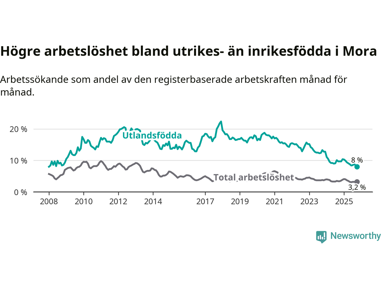 Skillnaden i arbetslöshet mellan utrikesfödda och hela befolkningen är 4,8 procentenheter i Mora. Det är en betydligt mindre skillnad än för ett år sedan (−1,5 procentenheter).