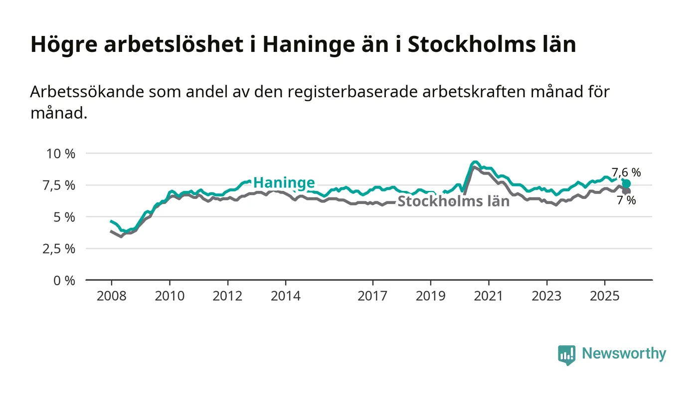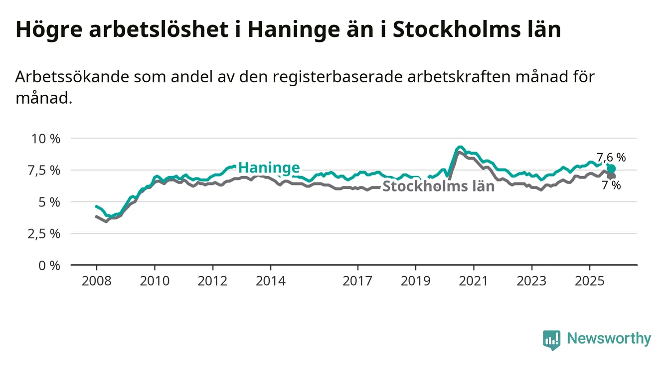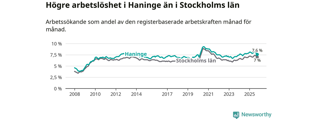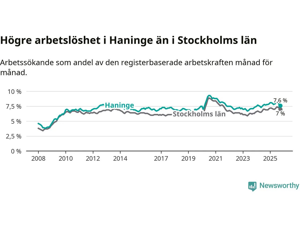 Under oktober månad rapporterade Haninge kommun en total arbetslöshet på 7,6 procent. Det är en minskning jämfört med samma tidpunkt i fjol (−0,2 procentenheter). I Stockholms län däremot stiger arbetslösheten något.