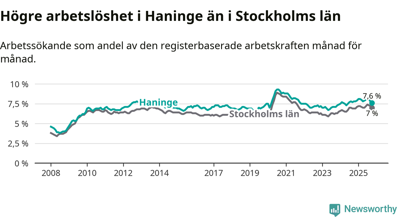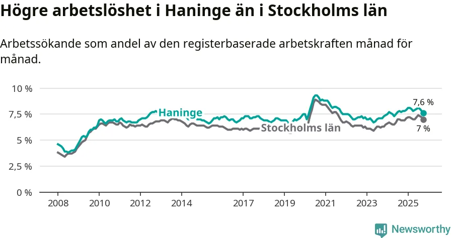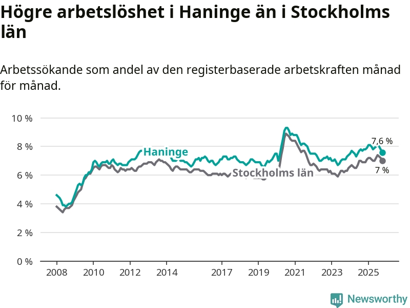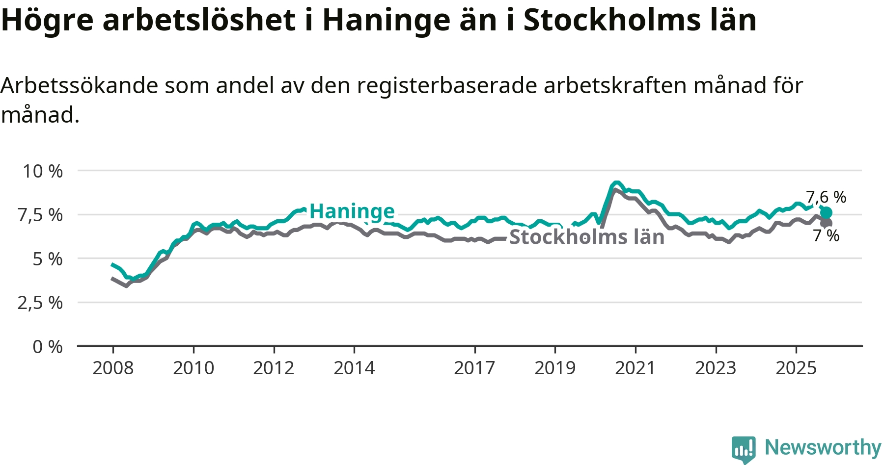 Under oktober månad rapporterade Haninge kommun en total arbetslöshet på 7,6 procent. Det är en minskning jämfört med samma tidpunkt i fjol (−0,2 procentenheter). I Stockholms län däremot stiger arbetslösheten något.