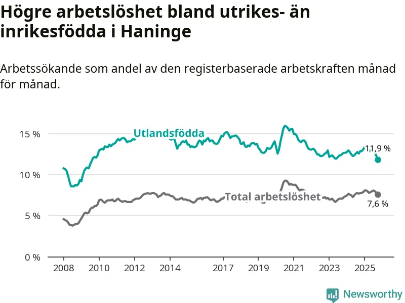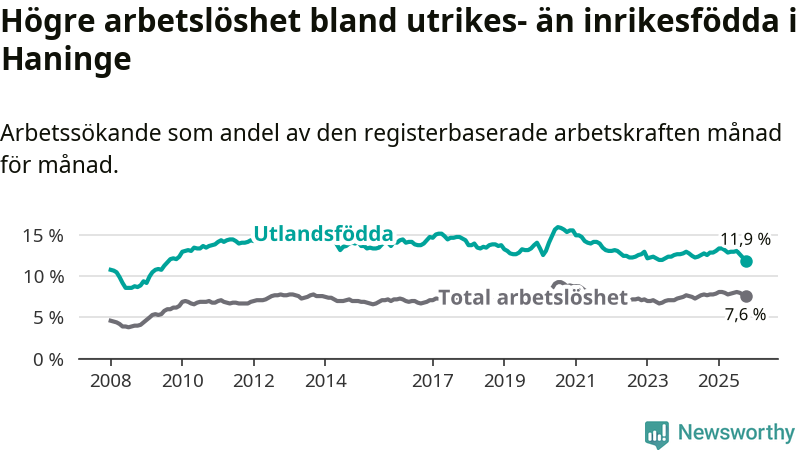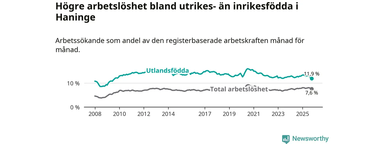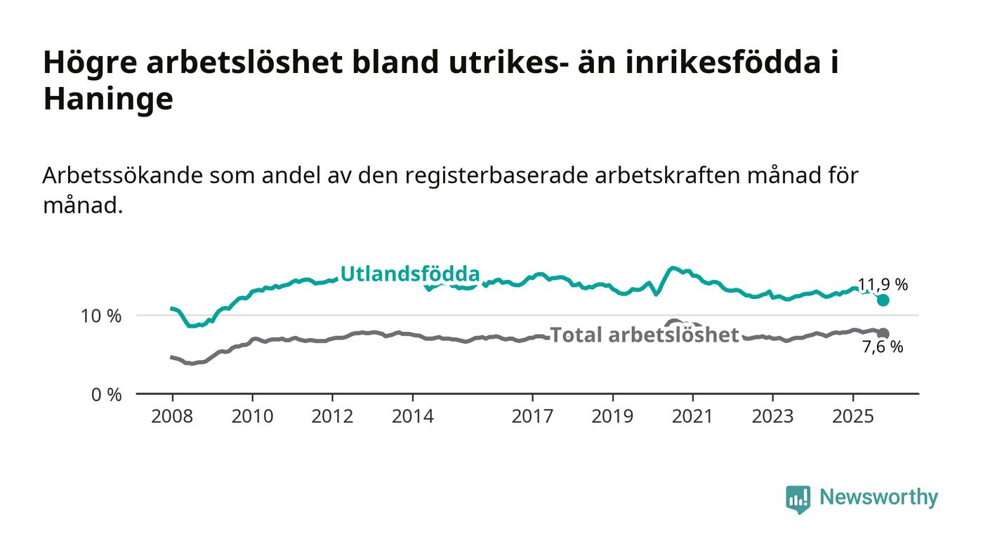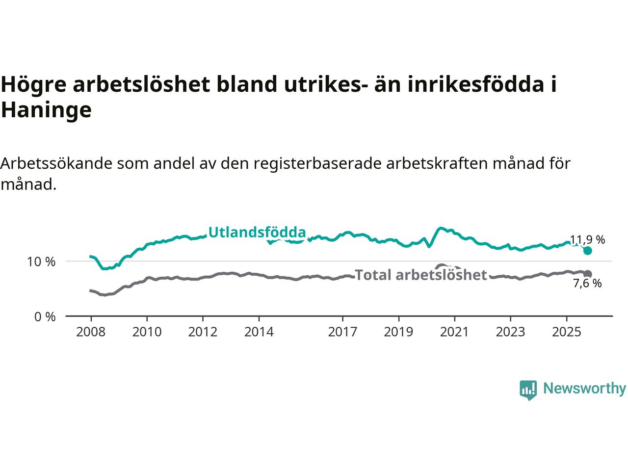 Skillnaden i arbetslöshet mellan utrikesfödda och hela befolkningen är 4,3 procentenheter i Haninge. Det är en mindre skillnad än för ett år sedan (−0,8 procentenheter).