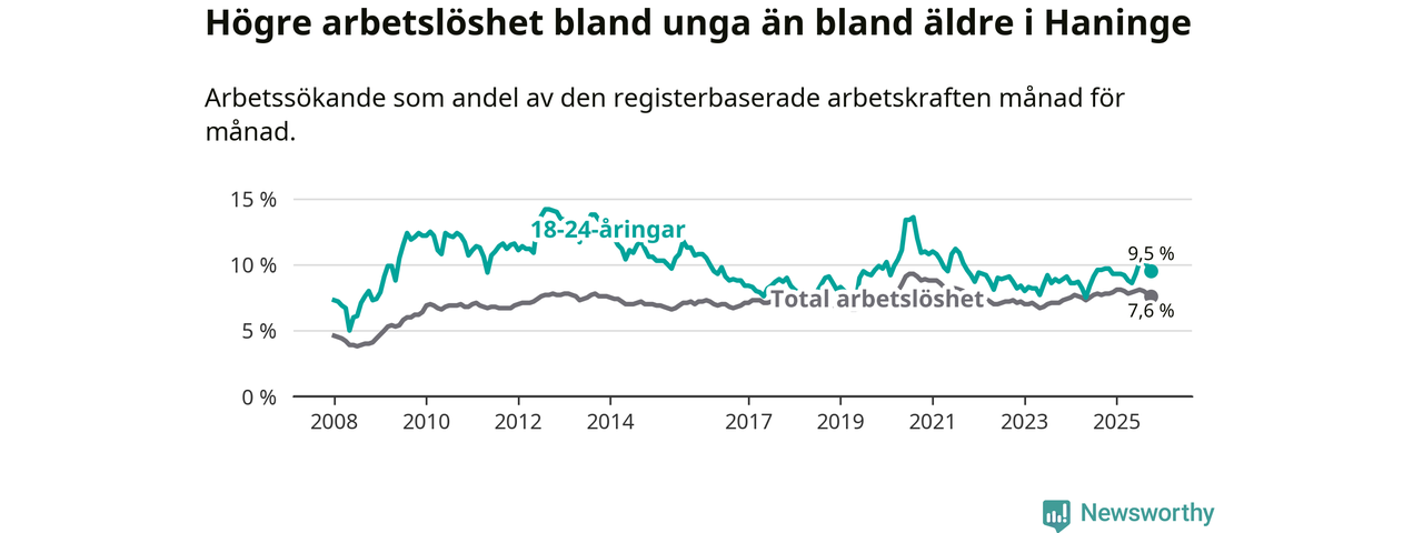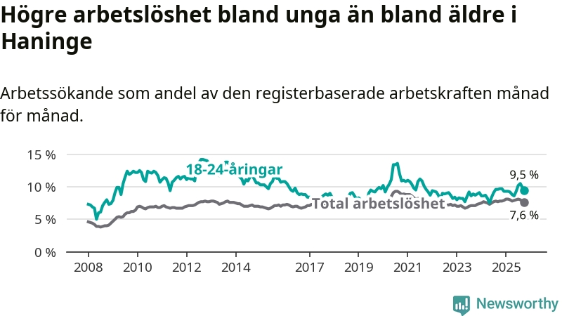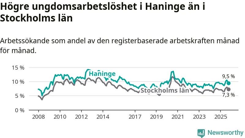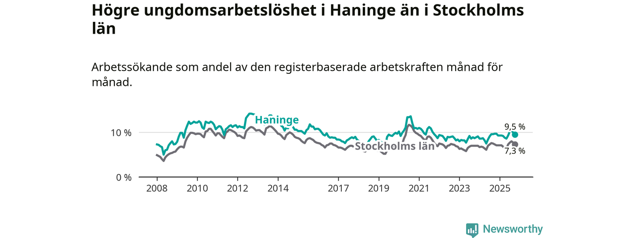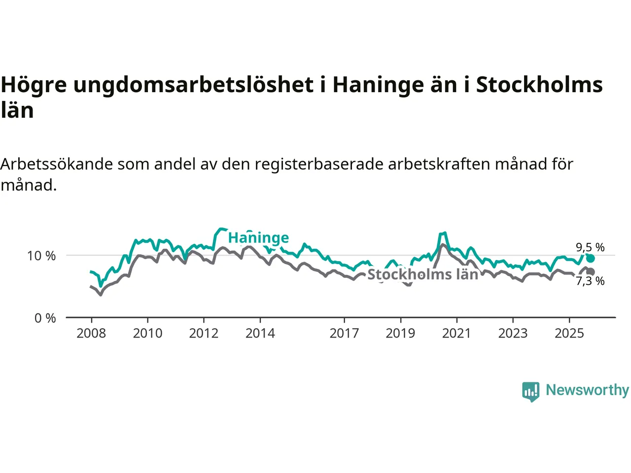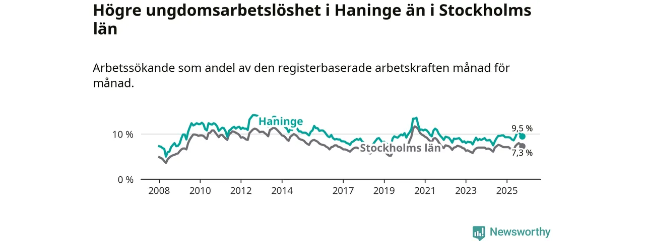 Precis som den totala arbetslösheten ligger ungdomsarbetslösheten i Haninge högre än i Stockholms län som helhet. Skillnaden mellan kommunen och länet är 2,2 procentenheter.