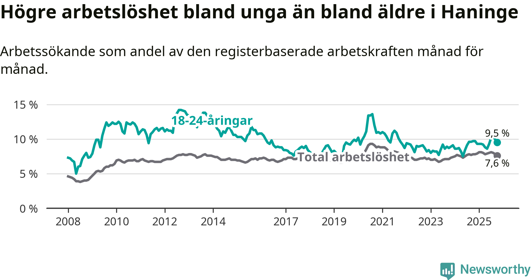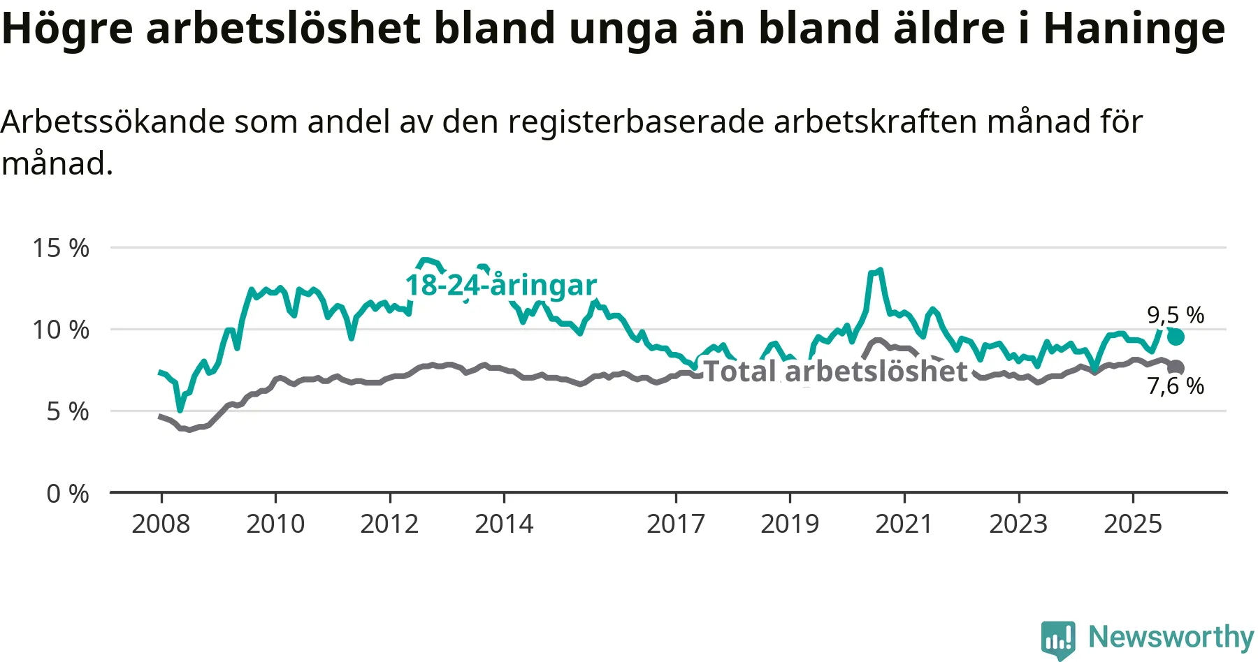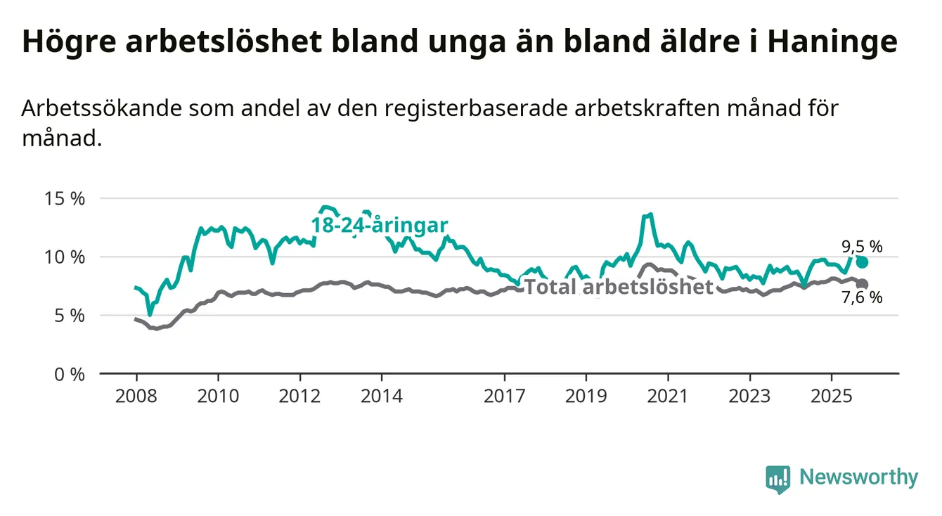Graf: Arbetslöshet bland unga i Haninge kommun och Stockholms län