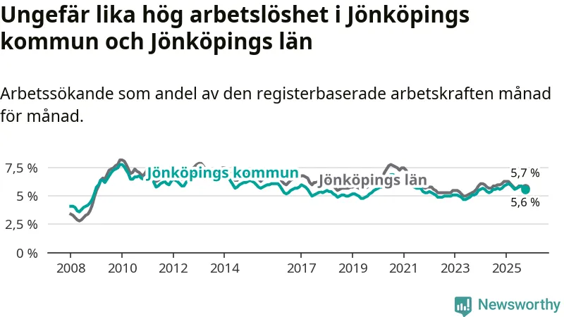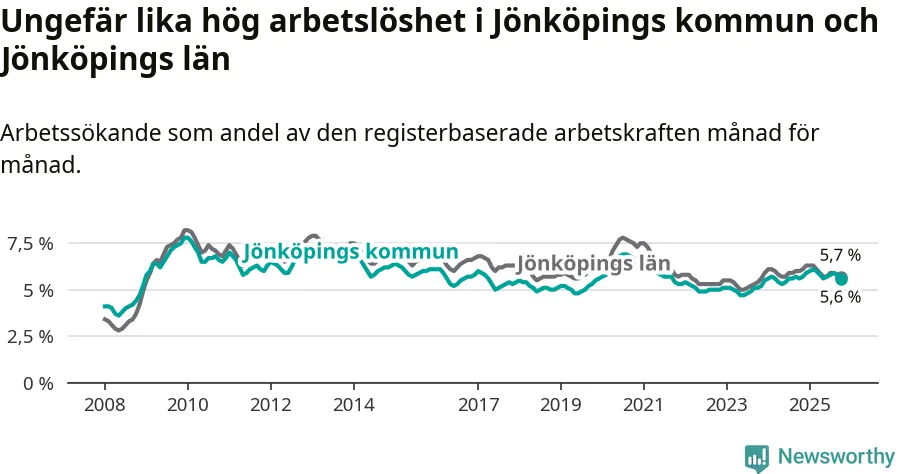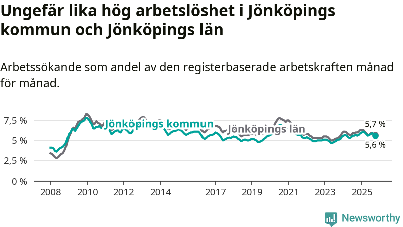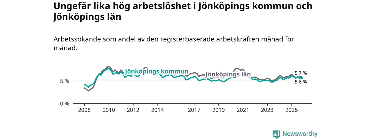 Under oktober månad rapporterade Jönköpings kommun en total arbetslöshet på 5,6 procent. Det är i samma nivå som i oktober i fjol. I Jönköpings län däremot sjunker arbetslösheten